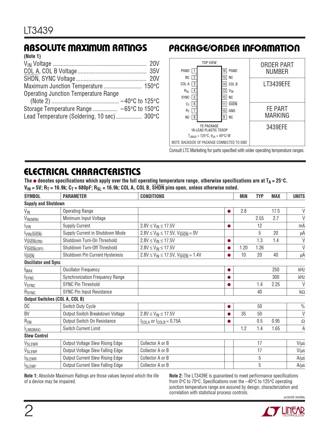 V TOP VIEW IN Voltage ... 20V ORDER PART COL A, COL B Voltage ... 35V PGND 1 16 PGND NUMBER SHDN, SYNC Voltage .. 20V NC 2 15 NC Maximum Junction Temperature ... 150°C COL A 3 14 COL B LT3439EFE R 4 Operating Junction Temperature Range 13 SL VIN SYNC 5 12 NC (Note 2) .. – 40°C to 125°C C 6 11 T SHDN Storage Temperature Range .. – 65°C to 150°C FE PART R 7 10 T GND Lead Temperature (Soldering, 10 sec)... 300°C MARKING NC 8 9 NC FE PACKAGE 3439EFE 16-LEAD PLASTIC TSSOP TJMAX = 125°C, θJA = 40°C/ W NOTE: BACKSIDE OF PACKAGE CONNECTED TO GND Consult LTC Marketing for parts specified with wider operating temperature ranges.