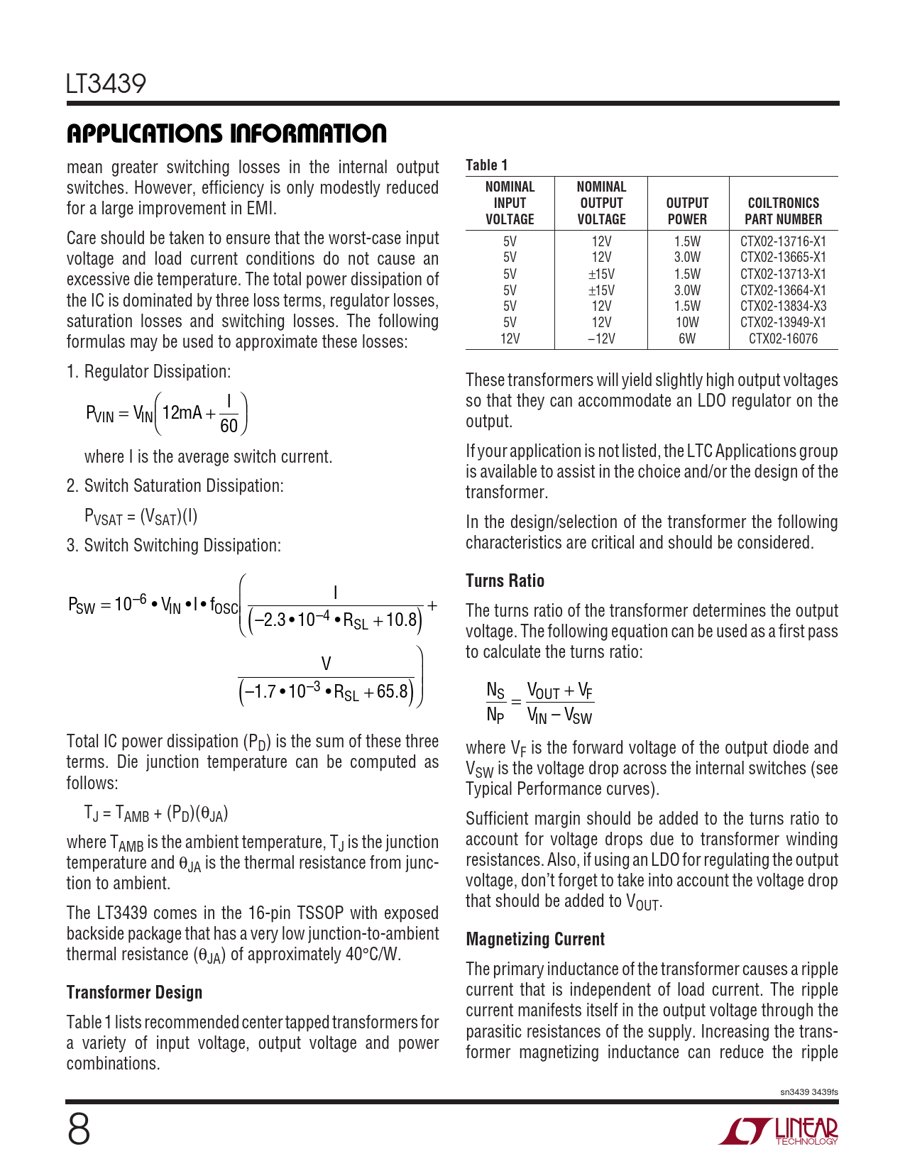 I P = 10 6 – • V •I • f SW IN OSC  The turns ratio of the transformer determines the output –2.3 • 10 4 – • R  ( 10 8 . ) + SL + voltage. The following equation can be used as a first pass  to calculate the turns ratio: V  –1.7 • 10 3 – • R ( 65.8) SL +  N V V S OUT F = + N V – V P IN SW Total IC power dissipation (PD) is the sum of these three where VF is the forward voltage of the output diode and terms. Die junction temperature can be computed as VSW is the voltage drop across the internal switches (see follows: Typical Performance curves). TJ = TAMB + (PD)(θJA) Sufficient margin should be added to the turns ratio to where T account for voltage drops due to transformer winding AMB is the ambient temperature, TJ is the junction temperature and θ resistances. Also, if using an LDO for regulating the output JA is the thermal resistance from junc- tion to ambient. voltage, don’t forget to take into account the voltage drop that should be added to V The LT3439 comes in the 16-pin TSSOP with exposed OUT. backside package that has a very low junction-to-ambient