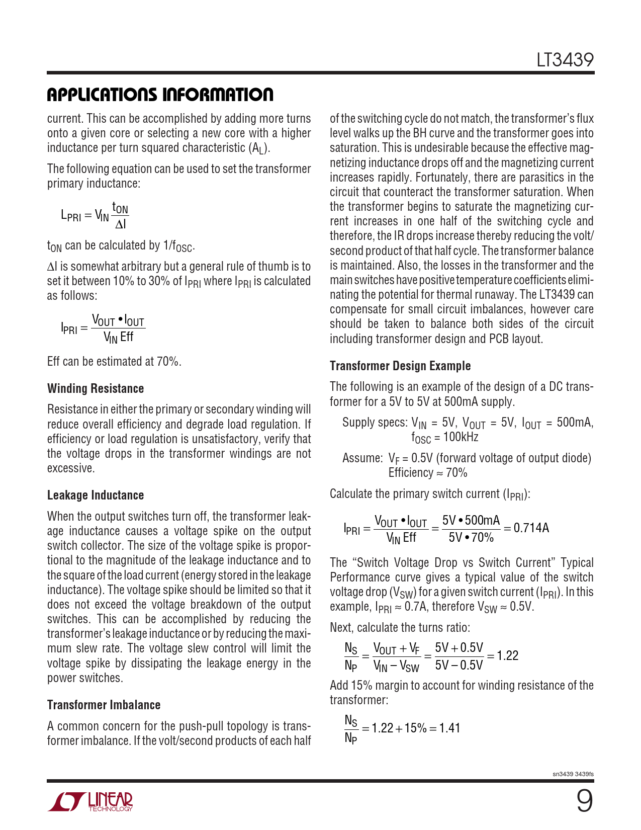 LT3439 UUWUAPPLICATIO S I FOR ATIO current. This can be accomplished by adding more turns of the switching cycle do not match, the transformer’s flux onto a given core or selecting a new core with a higher level walks up the BH curve and the transformer goes into inductance per turn squared characteristic (AL). saturation. This is undesirable because the effective mag- netizing inductance drops off and the magnetizing current The following equation can be used to set the transformer increases rapidly. Fortunately, there are parasitics in the primary inductance: circuit that counteract the transformer saturation. When t the transformer begins to saturate the magnetizing cur- L = V ON PRI IN ∆I rent increases in one half of the switching cycle and therefore, the IR drops increase thereby reducing the volt/ tON can be calculated by 1/fOSC. second product of that half cycle. The transformer balance ∆I is somewhat arbitrary but a general rule of thumb is to is maintained. Also, the losses in the transformer and the set it between 10% to 30% of IPRI where IPRI is calculated main switches have positive temperature coefficients elimi- as follows: nating the potential for thermal runaway. The LT3439 can compensate for small circuit imbalances, however care V I I OUT OUT should be taken to balance both sides of the circuit PRI = • V Eff IN including transformer design and PCB layout. Eff can be estimated at 70%. Transformer Design ExampleWinding Resistance The following is an example of the design of a DC trans- former for a 5V to 5V at 500mA supply. Resistance in either the primary or secondary winding will reduce overall efficiency and degrade load regulation. If Supply specs: VIN = 5V, VOUT = 5V, IOUT = 500mA, efficiency or load regulation is unsatisfactory, verify that fOSC = 100kHz the voltage drops in the transformer windings are not Assume: VF = 0.5V (forward voltage of output diode) excessive. Efficiency ≈ 70% Leakage Inductance Calculate the primary switch current (IPRI): When the output switches turn off, the transformer leak- V • I 5V • m 500 A OUT OUT age inductance causes a voltage spike on the output I = = = 0.714A PRI V Eff 5V • 7 % 0 switch collector. The size of the voltage spike is propor- IN tional to the magnitude of the leakage inductance and to The “Switch Voltage Drop vs Switch Current” Typical the square of the load current (energy stored in the leakage Performance curve gives a typical value of the switch inductance). The voltage spike should be limited so that it voltage drop (VSW) for a given switch current (IPRI). In this does not exceed the voltage breakdown of the output example, IPRI ≈ 0.7A, therefore VSW ≈ 0.5V. switches. This can be accomplished by reducing the Next, calculate the turns ratio: transformer’s leakage inductance or by reducing the maxi- mum slew rate. The voltage slew control will limit the N V V 5V . 0 5V S OUT F = + = + = . 1 22 voltage spike by dissipating the leakage energy in the N V – V 5V – . 0 5V P IN SW power switches. Add 15% margin to account for winding resistance of the Transformer Imbalance transformer: A common concern for the push-pull topology is trans- NS = 1 2.2+15% = 1 4.1 former imbalance. If the volt/second products of each half NP sn3439 3439fs 9