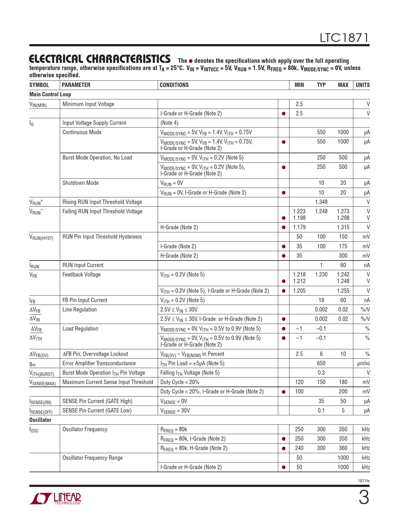 VIN(MIN) Minimum Input Voltage 2.5 V I-Grade or H-Grade (Note 2) ● 2.5 V IQ Input Voltage Supply Current (Note 4) Continuous Mode VMODE/SYNC = 5V, VFB = 1.4V, VITH = 0.75V 550 1000 μA VMODE/SYNC = 5V, VFB = 1.4V, VITH = 0.75V, ● 550 1000 μA I-Grade or H-Grade (Note 2) Burst Mode Operation, No Load VMODE/SYNC = 0V, VITH = 0.2V (Note 5) 250 500 μA VMODE/SYNC = 0V, VITH = 0.2V (Note 5), ● 250 500 μA I-Grade or H-Grade (Note 2) Shutdown Mode VRUN = 0V 10 20 μA VRUN = 0V, I-Grade or H-Grade (Note 2) ● 10 20 μA V + RUN Rising RUN Input Threshold Voltage 1.348 V V – RUN Falling RUN Input Threshold Voltage 1.223 1.248 1.273 V ● 1.198 1.298 V H-Grade (Note 2) ● 1.179 1.315 V VRUN(HYST) RUN Pin Input Threshold Hysteresis 50 100 150 mV I-Grade (Note 2) ● 35 100 175 mV H-Grade (Note 2) ● 35 300 mV IRUN RUN Input Current 1 60 nA VFB Feedback Voltage VITH = 0.2V (Note 5) 1.218 1.230 1.242 V ● 1.212 1.248 V VITH = 0.2V (Note 5), I-Grade or H-Grade (Note 2) ● 1.205 1.255 V IFB FB Pin Input Current VITH = 0.2V (Note 5) 18 60 nA ΔVFB Line Regulation 2.5V ≤ VIN ≤ 30V 0.002 0.02 %/V ΔVIN 2.5V ≤ VIN ≤ 30V, I-Grade or H-Grade (Note 2) ● 0.002 0.02 %/V ΔVFB Load Regulation VMODE/SYNC = 0V, VITH = 0.5V to 0.9V (Note 5) ● – 1 –0.1 % ΔVITH VMODE/SYNC = 0V, VITH = 0.5V to 0.9V (Note 5) ● – 1 –0.1 % I-Grade or H-Grade (Note 2) ΔVFB(OV) ΔFB Pin, Overvoltage Lockout VFB(OV) – VFB(NOM) in Percent 2.5 6 10 % gm Error Amplifi er Transconductance ITH Pin Load = ±5μA (Note 5) 650 μmho VITH(BURST) Burst Mode Operation ITH Pin Voltage Falling ITH Voltage (Note 5) 0.3 V VSENSE(MAX) Maximum Current Sense Input Threshold Duty Cycle < 20% 120 150 180 mV Duty Cycle < 20%, I-Grade or H-Grade (Note 2) ● 100 200 mV ISENSE(ON) SENSE Pin Current (GATE High) VSENSE = 0V 35 50 μA ISENSE(OFF) SENSE Pin Current (GATE Low) VSENSE = 30V 0.1 5 μA