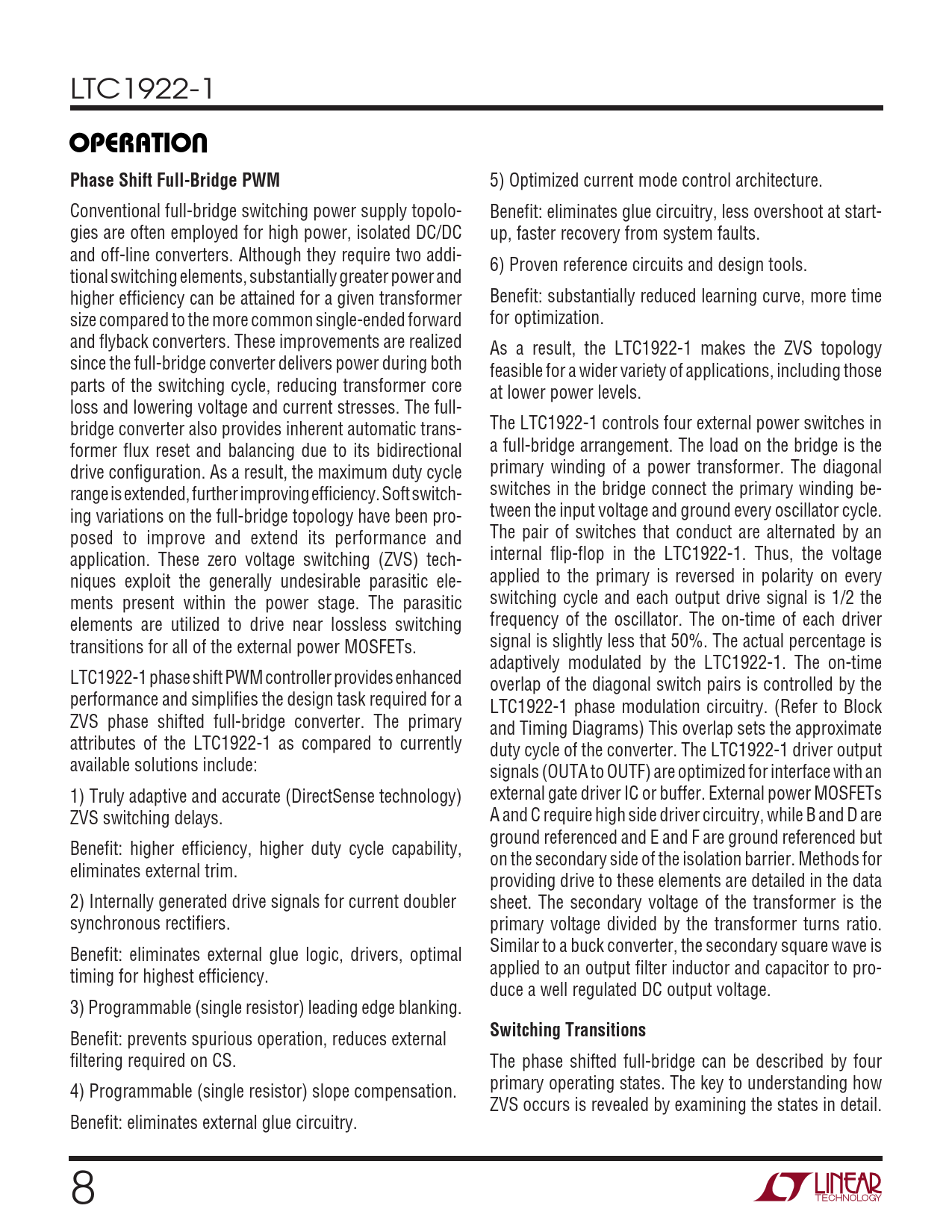 LTC1922-1 UOPERATIOPhase Shift Full-Bridge PWM 5) Optimized current mode control architecture. Conventional full-bridge switching power supply topolo- Benefit: eliminates glue circuitry, less overshoot at start- gies are often employed for high power, isolated DC/DC up, faster recovery from system faults. and off-line converters. Although they require two addi- 6) Proven reference circuits and design tools. tional switching elements, substantially greater power and higher efficiency can be attained for a given transformer Benefit: substantially reduced learning curve, more time size compared to the more common single-ended forward for optimization. and flyback converters. These improvements are realized As a result, the LTC1922-1 makes the ZVS topology since the full-bridge converter delivers power during both feasible for a wider variety of applications, including those parts of the switching cycle, reducing transformer core at lower power levels. loss and lowering voltage and current stresses. The full- bridge converter also provides inherent automatic trans- The LTC1922-1 controls four external power switches in former flux reset and balancing due to its bidirectional a full-bridge arrangement. The load on the bridge is the drive configuration. As a result, the maximum duty cycle primary winding of a power transformer. The diagonal range is extended, further improving efficiency. Soft switch- switches in the bridge connect the primary winding be- ing variations on the full-bridge topology have been pro- tween the input voltage and ground every oscillator cycle. posed to improve and extend its performance and The pair of switches that conduct are alternated by an application. These zero voltage switching (ZVS) tech- internal flip-flop in the LTC1922-1. Thus, the voltage niques exploit the generally undesirable parasitic ele- applied to the primary is reversed in polarity on every ments present within the power stage. The parasitic switching cycle and each output drive signal is 1/2 the elements are utilized to drive near lossless switching frequency of the oscillator. The on-time of each driver transitions for all of the external power MOSFETs. signal is slightly less that 50%. The actual percentage is adaptively modulated by the LTC1922-1. The on-time LTC1922-1 phase shift PWM controller provides enhanced overlap of the diagonal switch pairs is controlled by the performance and simplifies the design task required for a LTC1922-1 phase modulation circuitry. (Refer to Block ZVS phase shifted full-bridge converter. The primary and Timing Diagrams) This overlap sets the approximate attributes of the LTC1922-1 as compared to currently duty cycle of the converter. The LTC1922-1 driver output available solutions include: signals (OUTA to OUTF) are optimized for interface with an 1) Truly adaptive and accurate (DirectSense technology) external gate driver IC or buffer. External power MOSFETs ZVS switching delays. A and C require high side driver circuitry, while B and D are ground referenced and E and F are ground referenced but Benefit: higher efficiency, higher duty cycle capability, on the secondary side of the isolation barrier. Methods for eliminates external trim. providing drive to these elements are detailed in the data 2) Internally generated drive signals for current doubler sheet. The secondary voltage of the transformer is the synchronous rectifiers. primary voltage divided by the transformer turns ratio. Similar to a buck converter, the secondary square wave is Benefit: eliminates external glue logic, drivers, optimal applied to an output filter inductor and capacitor to pro- timing for highest efficiency. duce a well regulated DC output voltage. 3) Programmable (single resistor) leading edge blanking. Switching Transitions Benefit: prevents spurious operation, reduces external filtering required on CS. The phase shifted full-bridge can be described by four primary operating states. The key to understanding how 4) Programmable (single resistor) slope compensation. ZVS occurs is revealed by examining the states in detail. Benefit: eliminates external glue circuitry. 8