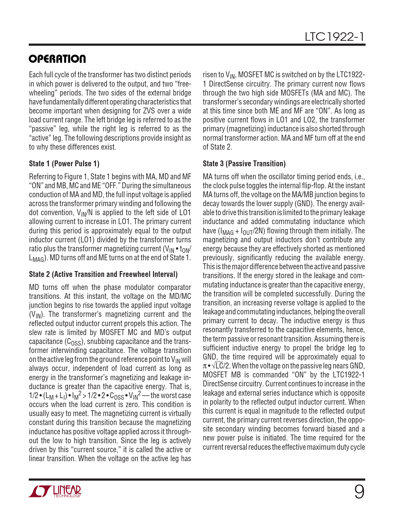 Each full cycle of the transformer has two distinct periods risen to VIN, MOSFET MC is switched on by the LTC1922- in which power is delivered to the output, and two “free- 1 DirectSense circuitry. The primary current␣ now flows wheeling” periods. The two sides of the external bridge through the two high side MOSFETs (MA and MC). The have fundamentally different operating characteristics that transformer’s secondary windings are electrically shorted become important when designing for ZVS over a wide at this time since both ME and MF are “ON”. As long as load current range. The left bridge leg is referred to as the positive current flows in LO1 and LO2, the transformer “passive” leg, while the right leg is referred to as the primary (magnetizing) inductance is also shorted through “active” leg. The following descriptions provide insight as normal transformer action. MA and MF turn off at the end to why these differences exist. of State 2.