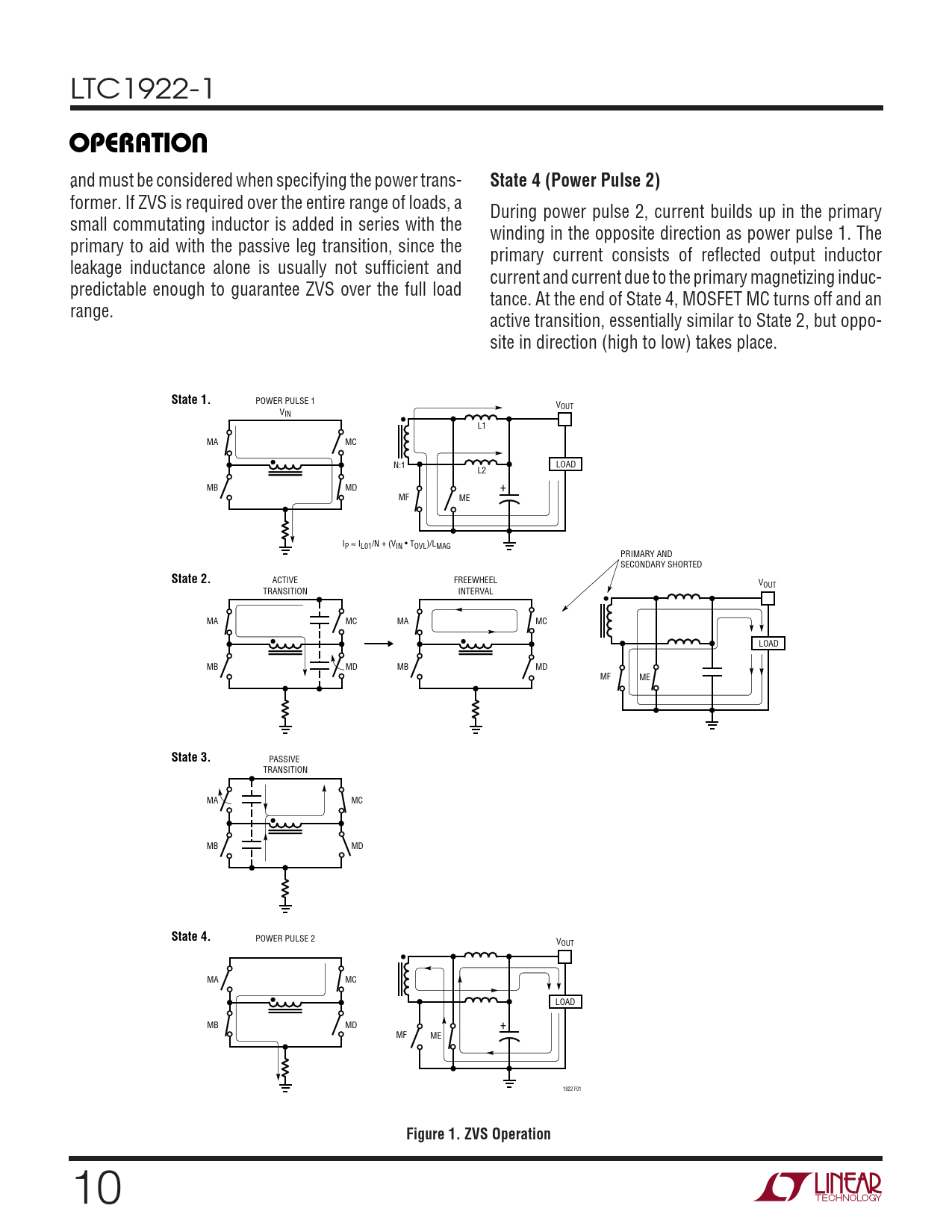 LTC1922-1 UOPERATIO .and must be considered when specifying the power trans- State 4 (Power Pulse 2) former. If ZVS is required over the entire range of loads, a During power pulse 2, current builds up in the primary small commutating inductor is added in series with the winding in the opposite direction as power pulse 1. The primary to aid with the passive leg transition, since the primary current consists of reflected output inductor leakage inductance alone is usually not sufficient and current and current due to the primary magnetizing induc- predictable enough to guarantee ZVS over the full load tance. At the end of State 4, MOSFET MC turns off and an range. active transition, essentially similar to State 2, but oppo- site in direction (high to low) takes place. State 1. POWER PULSE 1 VOUT VIN L1 MA MC N:1 LOAD L2 MB MD + MF ME IP ≈ IL01/N + (VIN • TOVL)/LMAG PRIMARY AND SECONDARY SHORTED State 2. ACTIVE FREEWHEEL VOUT TRANSITION INTERVAL MA MC MA MC LOAD MB MD MB MD MF ME State 3. PASSIVE TRANSITION MA MC MB MD State 4. POWER PULSE 2 VOUT MA MC LOAD MB MD + MF ME 1922 F01 Figure 1. ZVS Operation 10