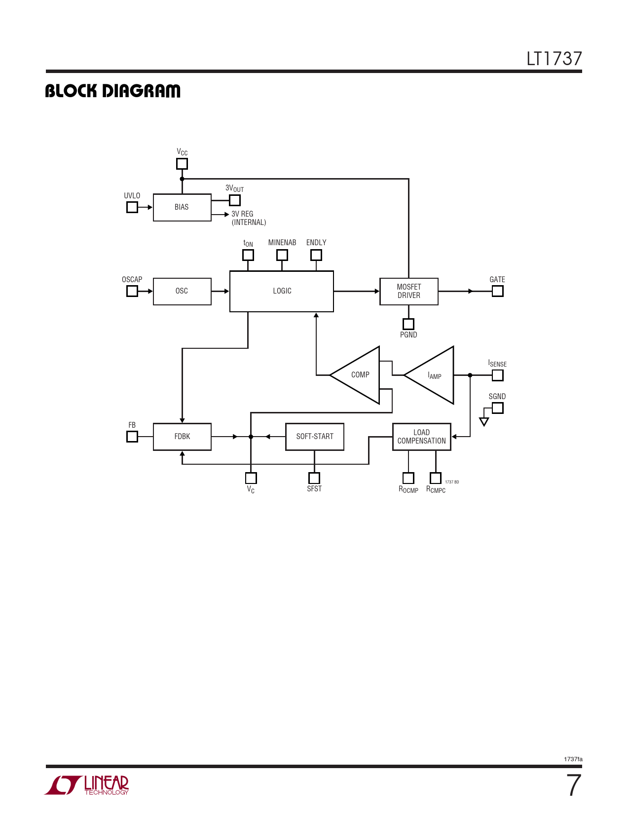 VCC 3VOUT UVLO BIAS 3V REG (INTERNAL) t MINENAB ENDLY ON OSCAP GATE MOSFET OSC LOGIC DRIVER PGND ISENSE COMP IAMP SGND FB LOAD FDBK SOFT-START COMPENSATION 1737 BD VC SFST ROCMP RCMPC 1737fa 7