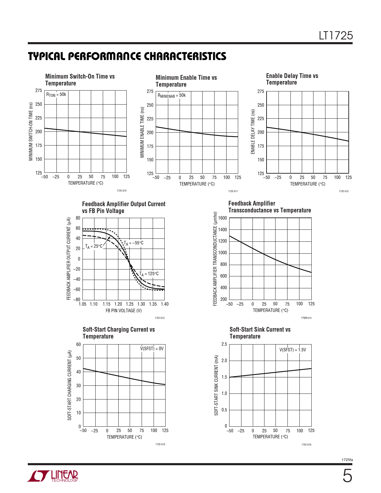 80 1600 µA) µmho) 60 1400 40 T 1200 A = –55°C T 20 A = 25°C 1000 0 800 –20 TA = 125°C 600 –40 –60 400 FEEDBACK AMPLIFIER OUTPUT CURRENT ( –80 200 1.05 1.10 1.15 1.20 1.25 1.30 1.35 1.40 FEEDBACK AMPLIFIER TRANSCONDUCTANCE ( –50 –25 0 25 50 75 100 125 FB PIN VOLTAGE (V) TEMPERATURE (°C) 1725 G13 1725 G14