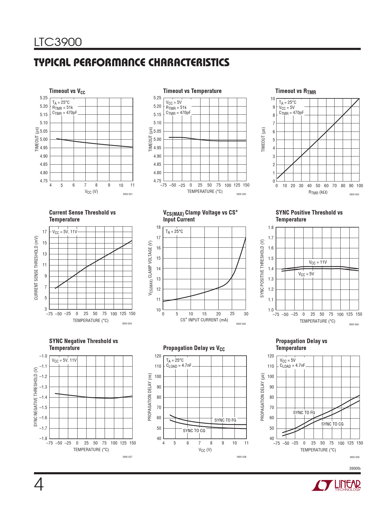 18 1.8 17 VCC = 5V, 11V TA = 25°C 17 1.7 15 16 1.6 13 15 1.5 11 VCC = 11V 14 1.4 9 V CLAMP VOLTAGE (V) CC = 5V 13 1.3 7 12 1.2 V CS(MAX) CURRENT SENSE THRESHOLD (mV) 5 SYNC POSITIVE THRESHOLD (V) 11 1.1 3 10 1.0 –75 –50 –25 0 25 50 75 100 125 150 0 5 10 15 20 25 30 –75 –50 –25 0 25 50 75 100 125 150 TEMPERATURE (°C) CS+ INPUT CURRENT (mA) TEMPERATURE (°C) 3900 G04 3900 G05 3900 G06