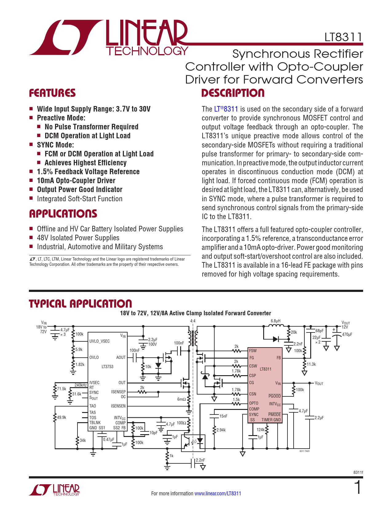 LT8311 Synchronous Rectifier Controller with Opto-Coupler Driver for Forward Converters FEATURESDESCRIPTION n Wide Input Supply Range: 3.7V to 30V The LT®8311 is used on the secondary side of a forward n Preactive Mode: converter to provide synchronous MOSFET control and n No Pulse Transformer Required output voltage feedback through an opto-coupler. The n DCM Operation at Light Load LT8311’s unique preactive mode allows control of the n SYNC Mode: secondary-side MOSFETs without requiring a traditional n FCM or DCM Operation at Light Load pulse transformer for primary- to secondary-side com- n Achieves Highest Efficiency munication. In preactive mode, the output inductor current n 1.5% Feedback Voltage Reference operates in discontinuous conduction mode (DCM) at n 10mA Opto-Coupler Driver light load. If forced continuous mode (FCM) operation is n Output Power Good Indicator desired at light load, the LT8311 can, alternatively, be used n Integrated Soft-Start Function in SYNC mode, where a pulse transformer is required to send synchronous control signals from the primary-side APPLICATIONS IC to the LT8311. n Offline and HV Car Battery Isolated Power Supplies The LT8311 offers a full featured opto-coupler controller, n 48V Isolated Power Supplies incorporating a 1.5% reference, a transconductance error n Industrial, Automotive and Military Systems amplifier and a 10mA opto-driver. Power good monitoring L, LT, LTC, LTM, Linear Technology and the Linear logo are registered trademarks of Linear and output soft-start/overshoot control are also included. Technology Corporation. All other trademarks are the property of their respective owners. The LT8311 is available in a 16-lead FE package with pins removed for high voltage spacing requirements. TYPICAL APPLICATION18V to 72V, 12V/8A Active Clamp Isolated Forward Converter V 4:4 6.8µH IN VOUT 18V to 12V 4.7µF + 72V 68pF × 3 100k • • 20k V 470µF IN 22µF UVLO_VSEC 2.2µF 100V 100nF × 2 2.2nF 2k 5.9k 100nF FSW 100k OVLO AOUT FG FB 2k 1.82k 11.3k LT3753 10k CSW LT8311 1.78k CSP IVSEC 240kHz OUT CG VIN VOUT RT 71.5k 2k 1.78k 100k SYNC 31.6k ISENSEP CSN S PGOOD OUT OC 6mΩ 1.5k OPTO TAO ISENSEN INTVCC COMP TAS 4.7µF SYNC PMODE 49.9k TOS INTV 15nF CC SS TIMER GND 2.2µF TBLNK COMP 4.7µF 100Ω GND SS1 SS2 FB 100k 2.94k 124k 10pF 1µF 0.47µF 1µF 34k 1µF 100k 8311 TA01 1k 2.2nF 8311f For more information www.linear.com/LT8311 1 Document Outline Related Parts Features Applications Typical Application Description Absolute Maximum Ratings Order Information Pin Configuration Electrical Characteristics Typical Performance Characteristics Pin Functions Block Diagram Operation FUNDAMENTALS OF FORWARD CONVERTER OPERATION IN CCM LT8311 SYNCHRONOUS CONTROL SCHEMES PREACTIVE MODE SYNCHRONOUS CONTROL SYNC MODE SYNCHRONOUS CONTROL OPTO-COUPLER CONTROL Applications Information VIN BIAS SUPPLY INTVCC BIAS SUPPLY LT8311 OPTO CONTROL FUNDAMENTALS LT8311 SYNCHRONOUS CONTROL FUNDAMENTALS PREACTIVE MODE SYNCHRONOUS CONTROL SYNC MODE SYNCHRONOUS CONTROL Typical Applications Package Description Typical Application Related Parts