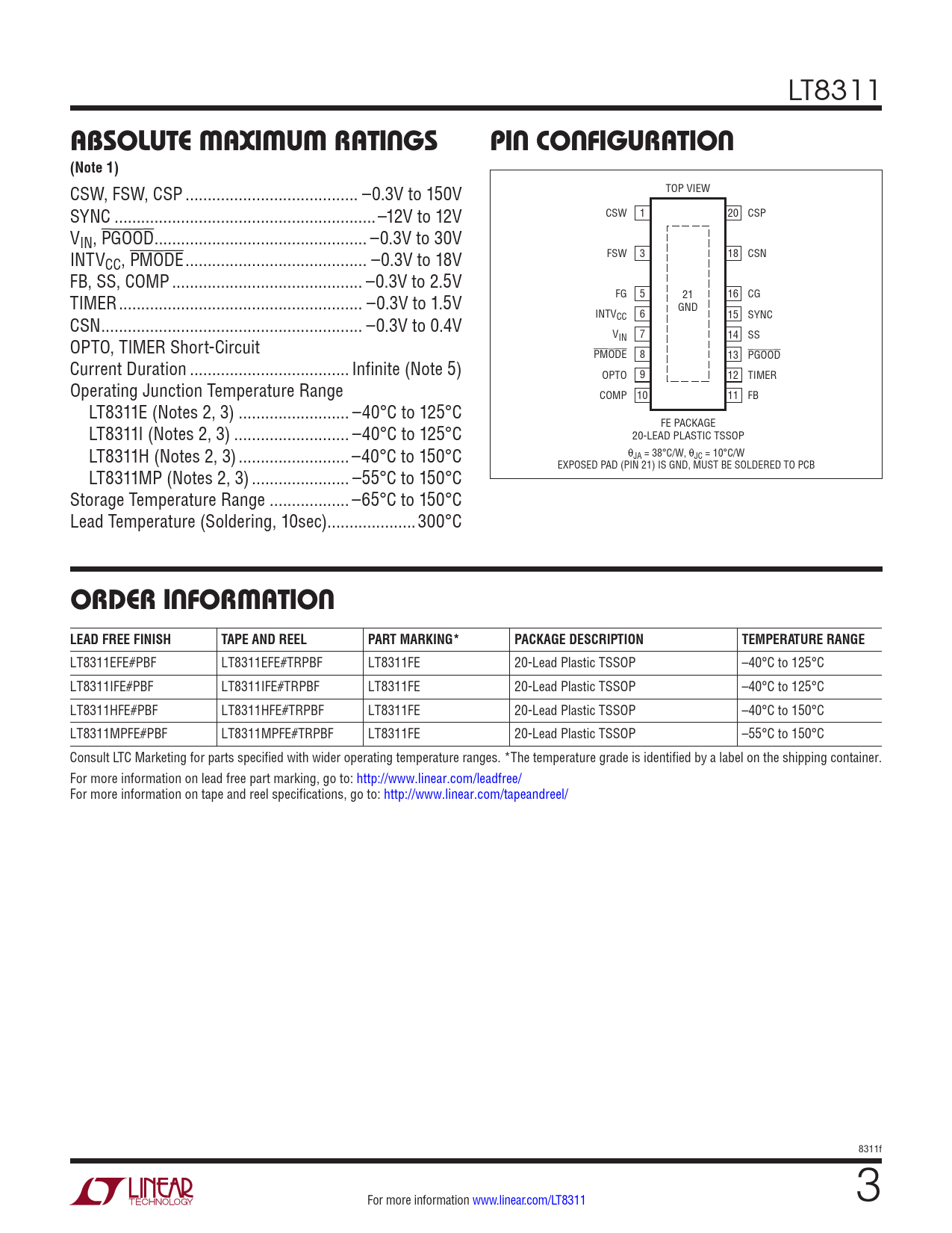 ABSOLUTE MAXIMUM RATINGS PIN CONFIGURATION (Note 1) ORDER INFORMATION LEAD FREE FINISH TAPE AND REEL PART MARKING*