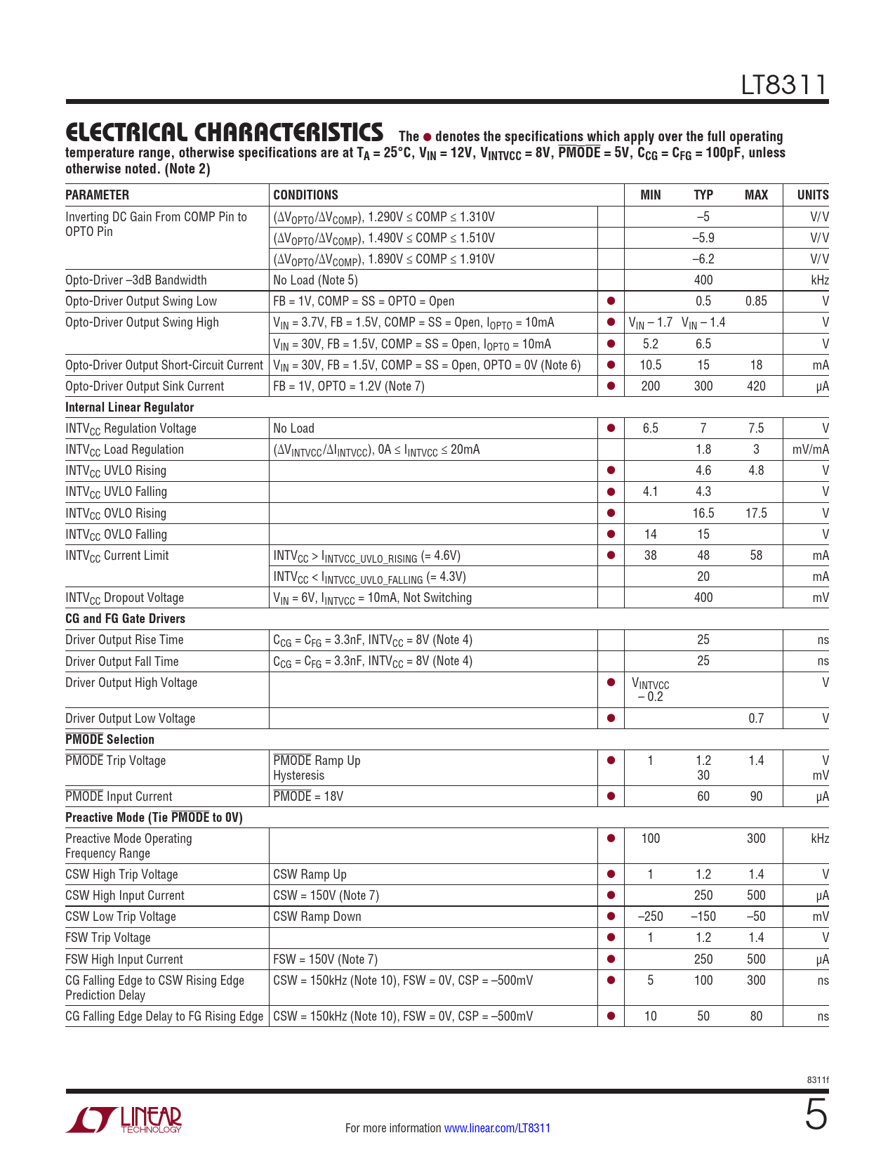 Preactive Mode Operating l 100 300 kHz Frequency Range CSW High Trip Voltage CSW Ramp Up l 1 1.2 1.4 V CSW High Input Current CSW = 150V (Note 7) l 250 500 µA CSW Low Trip Voltage CSW Ramp Down l –250 –150 –50 mV FSW Trip Voltage l 1 1.2 1.4 V FSW High Input Current FSW = 150V (Note 7) l 250 500 µA CG Falling Edge to CSW Rising Edge CSW = 150kHz (Note 10), FSW = 0V, CSP = –500mV l 5 100 300 ns Prediction Delay CG Falling Edge Delay to FG Rising Edge CSW = 150kHz (Note 10), FSW = 0V, CSP = –500mV l 10 50 80 ns 8311f For more information www.linear.com/LT8311 5 Document Outline Related Parts Features Applications Typical Application Description Absolute Maximum Ratings Order Information Pin Configuration Electrical Characteristics Typical Performance Characteristics Pin Functions Block Diagram Operation FUNDAMENTALS OF FORWARD CONVERTER OPERATION IN CCM LT8311 SYNCHRONOUS CONTROL SCHEMES PREACTIVE MODE SYNCHRONOUS CONTROL SYNC MODE SYNCHRONOUS CONTROL OPTO-COUPLER CONTROL Applications Information VIN BIAS SUPPLY INTVCC BIAS SUPPLY LT8311 OPTO CONTROL FUNDAMENTALS LT8311 SYNCHRONOUS CONTROL FUNDAMENTALS PREACTIVE MODE SYNCHRONOUS CONTROL SYNC MODE SYNCHRONOUS CONTROL Typical Applications Package Description Typical Application Related Parts