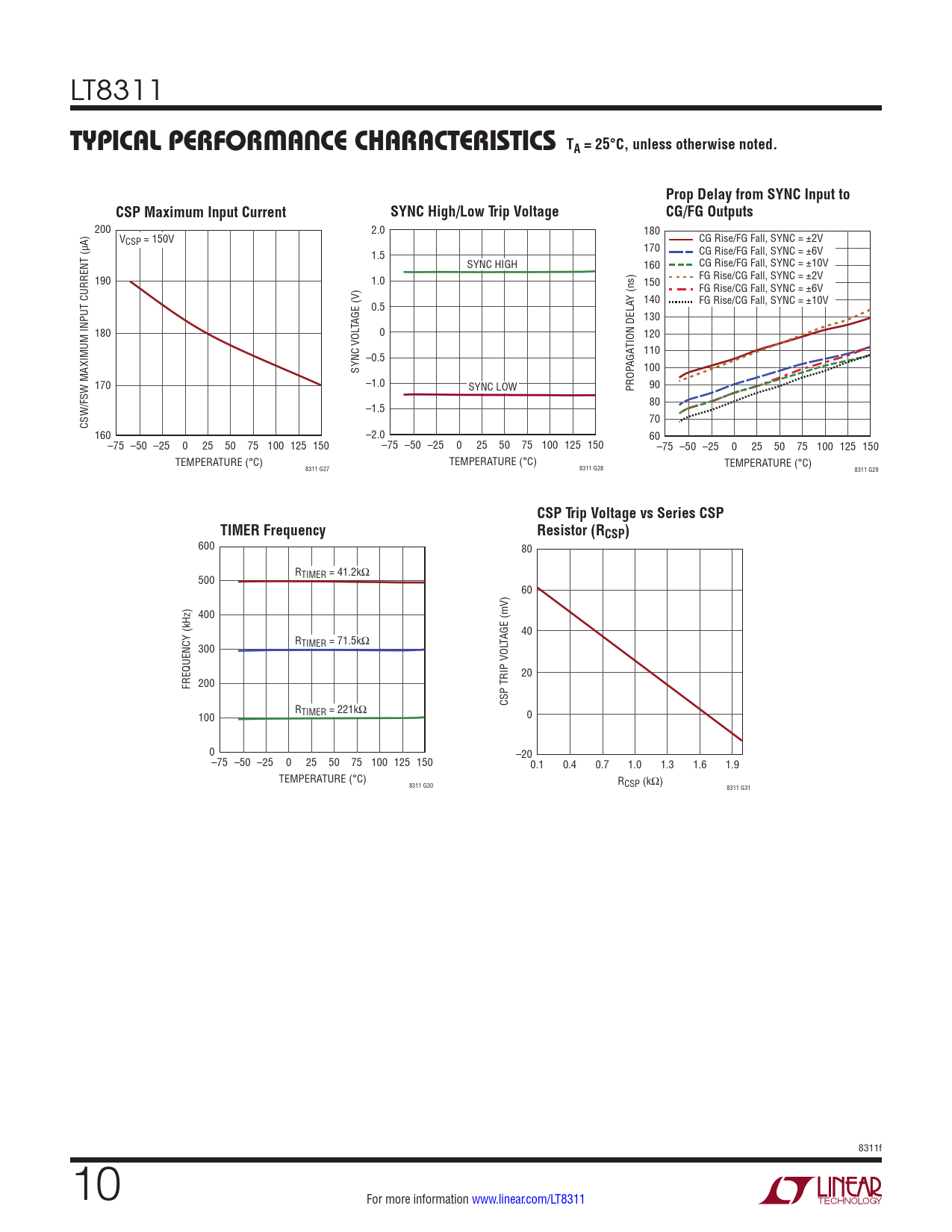 200 2.0 180 VCSP = 150V CG Rise/FG Fall, SYNC = ±2V 170 1.5 CG Rise/FG Fall, SYNC = ±6V SYNC HIGH 160 CG Rise/FG Fall, SYNC = ±10V 190 1.0 150 FG Rise/CG Fall, SYNC = ±2V FG Rise/CG Fall, SYNC = ±6V Y (ns) 140 0.5 FG Rise/CG Fall, SYNC = ±10V 130 TAGE (V) 180 0 120 TION DELA 110 –0.5 SYNC VOL AGA 100 170 –1.0 SYNC LOW PROP 90 80 –1.5 CSW/FSW MAXIMUM INPUT CURRENT (µA) 70 160 –2.0 60 –75 –50 –25 0 25 50 75 100 125 150 –75 –50 –25 0 25 50 75 100 125 150 –75 –50 –25 0 25 50 75 100 125 150 TEMPERATURE (°C) TEMPERATURE (°C) TEMPERATURE (°C) 8311 G27 8311 G28 8311 G29