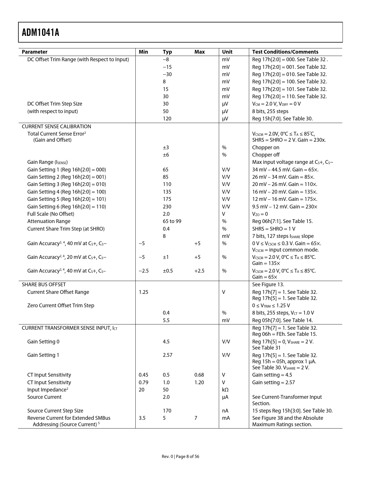 link to page 46 link to page 46 link to page 46 link to page 46 link to page 46 link to page 46 link to page 45 link to page 40 link to page 21 link to page 46 link to page 46 link to page 40 link to page 46 link to page 40 link to page 46 link to page 45 link to page 21 link to page 45 link to page 37 link to page 13 link to page 13 ADM1041AParameterMinTypMaxUnitTest Conditions/Comments DC Offset Trim Range (with Respect to Input) −8 mV Reg 17h[2:0] = 000. See Table 32 . −15 mV Reg 17h[2:0] = 001. See Table 32. −30 mV Reg 17h[2:0] = 010. See Table 32. 8 mV Reg 17h[2:0] = 100. See Table 32. 15 mV Reg 17h[2:0] = 101. See Table 32. 30 mV Reg 17h[2:0] = 110. See Table 32. DC Offset Trim Step Size 30 μV VCM = 2.0 V, VDIFF = 0 V (with respect to input) 50 μV 8 bits, 255 steps 120 μV Reg 15h[7:0]. See Table 30. CURRENT SENSE CALIBRATION Total Current Sense Error2 VCSCM = 2.0V, 0°C ≤ TA ≤ 85°C, (Gain and Offset) SHRS = SHRO = 2 V. Gain = 230x. ±3 % Chopper on ±6 % Chopper off Gain Range (ISENSE) Max input voltage range at CS+, CS− Gain Setting 1 (Reg 16h[2:0] = 000) 65 V/V 34 mV – 44.5 mV. Gain = 65×. Gain Setting 2 (Reg 16h[2:0] = 001) 85 V/V 26 mV – 34 mV. Gain = 85×. Gain Setting 3 (Reg 16h[2:0] = 010) 110 V/V 20 mV – 26 mV. Gain = 110×. Gain Setting 4 (Reg 16h[2:0] = 100) 135 V/V 16 mV – 20 mV. Gain = 135×. Gain Setting 5 (Reg 16h[2:0] = 101) 175 V/V 12 mV – 16 mV. Gain = 175×. Gain Setting 6 (Reg 16h[2:0] = 110) 230 V/V 9.5 mV – 12 mV. Gain = 230× Full Scale (No Offset) 2.0 V VZO = 0 Attenuation Range 65 to 99 % Reg 06h[7:1]. See Table 15. Current Share Trim Step (at SHRO) 0.4 % SHRS = SHRO = 1 V 8 mV 7 bits, 127 steps ISHARE slope Gain Accuracy2, 4, 40 mV at CS+, CS− −5 +5 % 0 V ≤ VCSCM ≤ 0.3 V. Gain = 65×. VCSCM = input common mode. Gain Accuracy2, 4, 20 mV at CS+, CS− −5 ±1 +5 % VCSCM = 2.0 V, 0°C ≤ TA ≤ 85°C. Gain = 135× Gain Accuracy2, 4, 40 mV at CS+, CS– −2.5 ±0.5 +2.5 % VCSCM = 2.0 V, 0°C ≤ TA ≤ 85°C. Gain = 65× SHARE BUS OFFSET See Figure 13. Current Share Offset Range 1.25 V Reg 17h[7] = 1. See Table 32. Reg 17h[5] = 1. See Table 32. Zero Current Offset Trim Step 0 ≤ VTRIM ≤ 1.25 V 0.4 % 8 bits, 255 steps, VCT = 1.0 V 5.5 mV Reg 05h[7:0]. See Table 14. CURRENT TRANSFORMER SENSE INPUT, ICT Reg 17h[7] = 1. See Table 32. Reg 06h = FEh. See Table 15. Gain Setting 0 4.5 V/V Reg 17h[5] = 0, VSHARE = 2 V. See Table 31 Gain Setting 1 2.57 V/V Reg 17h[5] = 1. See Table 32. Reg 15h = 05h, approx 1 μA. See Table 30. VSHARE = 2 V. CT Input Sensitivity 0.45 0.5 0.68 V Gain setting = 4.5 CT Input Sensitivity 0.79 1.0 1.20 V Gain setting = 2.57 Input Impedance2 20 50 kΩ Source Current 2.0 μA See Current-Transformer Input Section. Source Current Step Size 170 nA 15 steps Reg 15h[3:0]. See Table 30. Reverse Current for Extended SMBus 3.5 5 7 mA See Figure 38 and the Absolute Addressing (Source Current) 5 Maximum Ratings section. Rev. 0 | Page 8 of 56 Document Outline FEATURES SECONDARY-SIDE FEATURES INTERFACE AND INTERNAL FEATURES APPLICATIONS GENERAL DESCRIPTION SAMPLE APPLICATION CIRCUIT DESCRIPTION SPECIFICATIONS ABSOLUTE MAXIMUM RATINGS THERMAL CHARACTERISTICS ESD CAUTION PIN CONFIGURATION AND FUNCTION DESCRIPTIONS TERMINOLOGY THEORY OF OPERATION POWER MANAGEMENT GAIN TRIMMING AND CONFIGURATION DIFFERENTIAL REMOTE SENSE AMPLIFIER SET LOAD VOLTAGE LOAD OVERVOLTAGE (OV) LOCAL VOLTAGE SENSE LOCAL OVERVOLTAGE PROTECTION (OVP) LOCAL UNDERVOLTAGE PROTECTION (UVP) FALSE UV CLAMP VOLTAGE ERROR AMPLIFIER MAIN VOLTAGE REFERENCE CURRENT-SENSE AMPLIFIER CURRENT SENSING CURRENT-TRANSFORMER INPUT CURRENT-SENSE CALIBRATION CURRENT-LIMIT ERROR AMPLIFIER OVERCURRENT PROTECTION CURRENT SHARE CURRENT-SHARE OFFSET ISHARE DRIVE AMPLIFIER DIFFERENTIAL SENSE AMPLIFIER ISHARE ERROR AMPLIFIER ISHARE CLAMP SHARE_OK DETECTOR PULSE/ACSENSE2 PULSE ACSENSE OrFET GATE DRIVE OSCILLATOR AND TIMING GENERATORS LOGIC I/O AND MONITOR PINS CBD/ALERT MON1 MON2 PEN PSON MON3 DC_OK (POWER-OK, POWER Good, Etc.) MON4 AC_OK MON5 SMBus SERIAL PORT MICROPROCESSOR SUPPORT Interfacing Configuring for a Microprocessor BROADCASTING SMBus SERIAL INTERFACE GENERAL SMBus TIMING SMBus PROTOCOLS FOR RAM AND EEPROM SMBus Erase EEPROM Page Operations SMBus Write Operations Send Byte Write Byte/Word Block Write SMBus READ OPERATIONS Receive Byte Block Read Notes on SMBus Read Operations SMBus ALERT RESPONSE ADDRESS (ARA) SUPPORT FOR SMBus 1.1 LAYOUT CONSIDERATIONS POWER-UP AUTO-CONFIGURATION EXTENDED SMBus ADDRESSING SDA/PSONLINK SCL/AC_OKLink BACKDOOR ACCESS REGISTER LISTING DETAILED REGISTER DESCRIPTIONS MANUFACTURING DATA MICROPROCESSOR SUPPORT TEST NAME TABLE OUTLINE DIMENSIONS ORDERING GUIDE