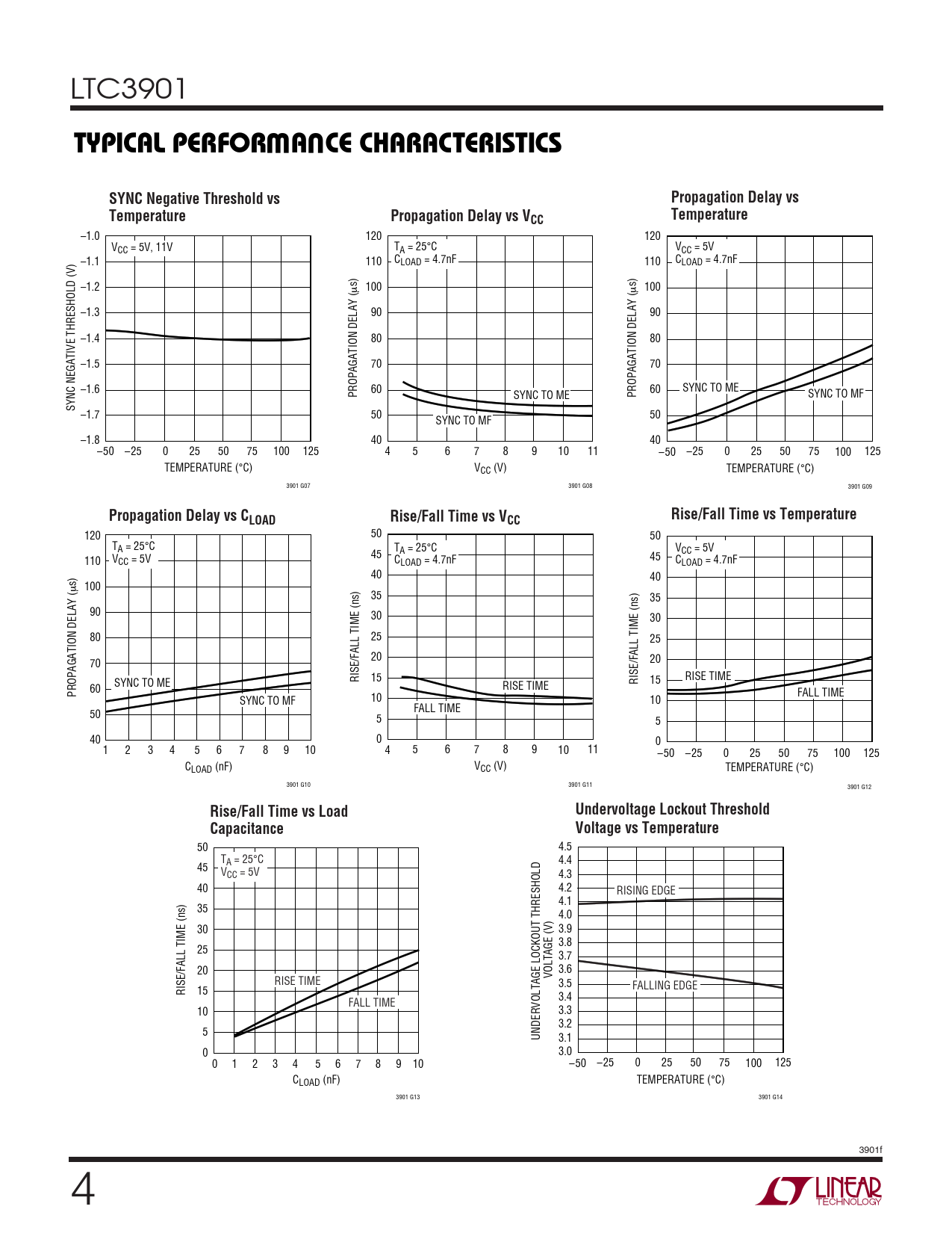 50 4.5 TA = 25°C 4.4 45 VCC = 5V 4.3 40 4.2 RISING EDGE 4.1 35 4.0 30 3.9 3.8 25 3.7 20 3.6 VOLTAGE (V) RISE TIME 3.5 FALLING EDGE RISE/FALL TIME (ns) 15 3.4 FALL TIME 10 3.3 3.2 5 UNDERVOLTAGE LOCKOUT THRESHOLD 3.1 0 3.0 0 1 2 3 4 5 6 7 8 9 10 –50 –25 0 25 50 75 100 125 CLOAD (nF) TEMPERATURE (°C) 3901 G13 3901 G14 3901f 4