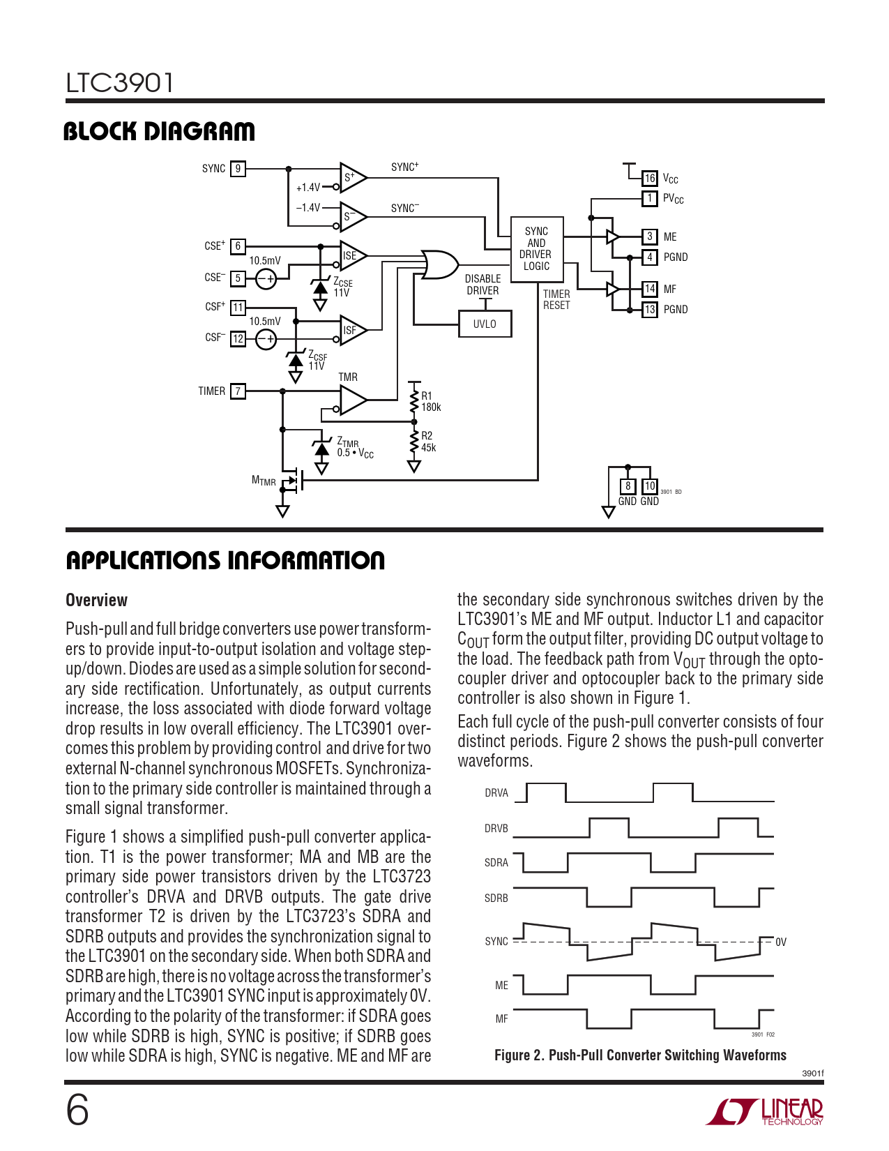 LTC3901 WBLOCK DIAGRA SYNC 9 SYNC+ S+ 16 VCC +1.4V 1 PVCC –1.4V SYNC– S– SYNC 3 ME AND CSE+ 6 ISE DRIVER 4 PGND 10.5mV LOGIC CSE– 5 – + DISABLE ZCSE DRIVER 11V 14 TIMER MF CSF+ 11 RESET 13 PGND 10.5mV UVLO ISF CSF– 12 – + ZCSF 11V TMR TIMER 7 R1 180k R2 ZTMR 45k 0.5 • VCC MTMR 8 10 3901 BD GND GND UUWUAPPLICATIO S I FOR ATIOOverview the secondary side synchronous switches driven by the LTC3901’s ME and MF output. Inductor L1 and capacitor Push-pull and full bridge converters use power transform- C ers to provide input-to-output isolation and voltage step- OUT form the output filter, providing DC output voltage to the load. The feedback path from V up/down. Diodes are used as a simple solution for second- OUT through the opto- coupler driver and optocoupler back to the primary side ary side rectification. Unfortunately, as output currents controller is also shown in Figure 1. increase, the loss associated with diode forward voltage drop results in low overall efficiency. The LTC3901 over- Each full cycle of the push-pull converter consists of four comes this problem by providing control and drive for two distinct periods. Figure 2 shows the push-pull converter external N-channel synchronous MOSFETs. Synchroniza- waveforms. tion to the primary side controller is maintained through a DRVA small signal transformer. DRVB Figure 1 shows a simplified push-pull converter applica- tion. T1 is the power transformer; MA and MB are the SDRA primary side power transistors driven by the LTC3723 controller’s DRVA and DRVB outputs. The gate drive SDRB transformer T2 is driven by the LTC3723’s SDRA and SDRB outputs and provides the synchronization signal to SYNC 0V the LTC3901 on the secondary side. When both SDRA and SDRB are high, there is no voltage across the transformer’s ME primary and the LTC3901 SYNC input is approximately 0V. According to the polarity of the transformer: if SDRA goes MF 3901 F02 low while SDRB is high, SYNC is positive; if SDRB goes low while SDRA is high, SYNC is negative. ME and MF are Figure 2. Push-Pull Converter Switching Waveforms 3901f 6