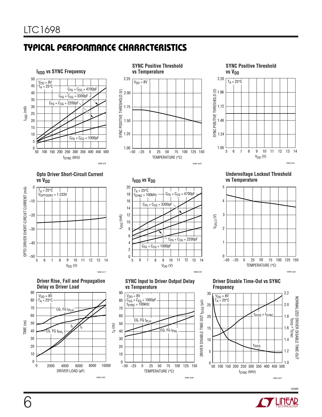50 2.25 2.20 V T DD = 8V VDD = 8V A = 25°C 45 TA = 25°C CFG = CCG = 4700pF 40 2.00 1.96 CFG = CCG = 3300pF 35 CFG = CCG = 2200pF 30 1.75 1.72 (mA) 25 I VDD 20 1.50 1.48 15 10 1.25 1.24 SYNC POSITIVE THRESHOLD (V) C SYNC POSITIVE THRESHOLD (V) FG = CCG = 1000pF 5 0 1.00 1.00 50 100 150 200 250 300 350 400 450 500 –50 –25 0 25 50 75 100 125 150 5 6 7 8 9 10 11 12 13 14 f V SYNC (kHz) TEMPERATURE (°C) DD (V) 1698 G19 1698 G20 1698 G21