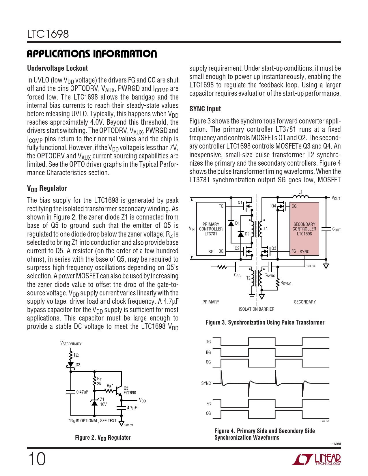 LTC1698 UUWUAPPLICATIO S I FOR ATIOUndervoltage Lockout supply requirement. Under start-up conditions, it must be small enough to power up instantaneously, enabling the In UVLO (low VDD voltage) the drivers FG and CG are shut LTC1698 to regulate the feedback loop. Using a larger off and the pins OPTODRV, VAUX, PWRGD and ICOMP are capacitor requires evaluation of the start-up performance. forced low. The LTC1698 allows the bandgap and the internal bias currents to reach their steady-state values SYNC Input before releasing UVLO. Typically, this happens when VDD reaches approximately 4.0V. Beyond this threshold, the Figure 3 shows the synchronous forward converter appli- drivers start switching. The OPTODRV, V cation. The primary controller LT3781 runs at a fixed AUX, PWRGD and I frequency and controls MOSFETs Q1 and Q2. The second- COMP pins return to their normal values and the chip is fully functional. However, if the V ary controller LTC1698 controls MOSFETs Q3 and Q4. An DD voltage is less than 7V, the OPTODRV and V inexpensive, small-size pulse transformer T2 synchro- AUX current sourcing capabilities are limited. See the OPTO driver graphs in the Typical Perfor- nizes the primary and the secondary controllers. Figure 4 mance Characteristics section. shows the pulse transformer timing waveforms. When the LT3781 synchronization output SG goes low, MOSFET VDD Regulator L1 The bias supply for the LTC1698 is generated by peak VOUT Q1 rectifying the isolated transformer secondary winding. As TG Q4 CG shown in Figure 2, the zener diode Z1 is connected from • • base of Q5 to ground such that the emitter of Q5 is D1 PRIMARY SECONDARY VIN CONTROLLER T1 CONTROLLER COUT regulated to one diode drop below the zener voltage. RZ is LT3781 D2 LTC1698 selected to bring Z1 into conduction and also provide base current to Q5. A resistor (on the order of a few hundred Q2 Q3 SG BG FG SYNC ohms), in series with the base of Q5, may be required to surpress high frequency oscillations depending on Q5’s 1698 F03 • • selection. A power MOSFET can also be used by increasing CSG CSYNC T2 the zener diode value to offset the drop of the gate-to- RSYNC source voltage. VDD supply current varies linearly with the supply voltage, driver load and clock frequency. A 4.7µF PRIMARY SECONDARY bypass capacitor for the VDD supply is sufficient for most ISOLATION BARRIER applications. This capacitor must be large enough to Figure 3. Synchronization Using Pulse Transformer provide a stable DC voltage to meet the LTC1698 VDD V TG SECONDARY BG 1Ω SG D3 RZ 2k SYNC RB* Q5 0.47µF FZT690 Z1 VDD 10V FG 4.7µF CG *RB IS OPTIONAL, SEE TEXT 1698 F04 1698 F02 Figure 4. Primary Side and Secondary SideFigure 2. VDD RegulatorSynchronization Waveforms 1698f 10