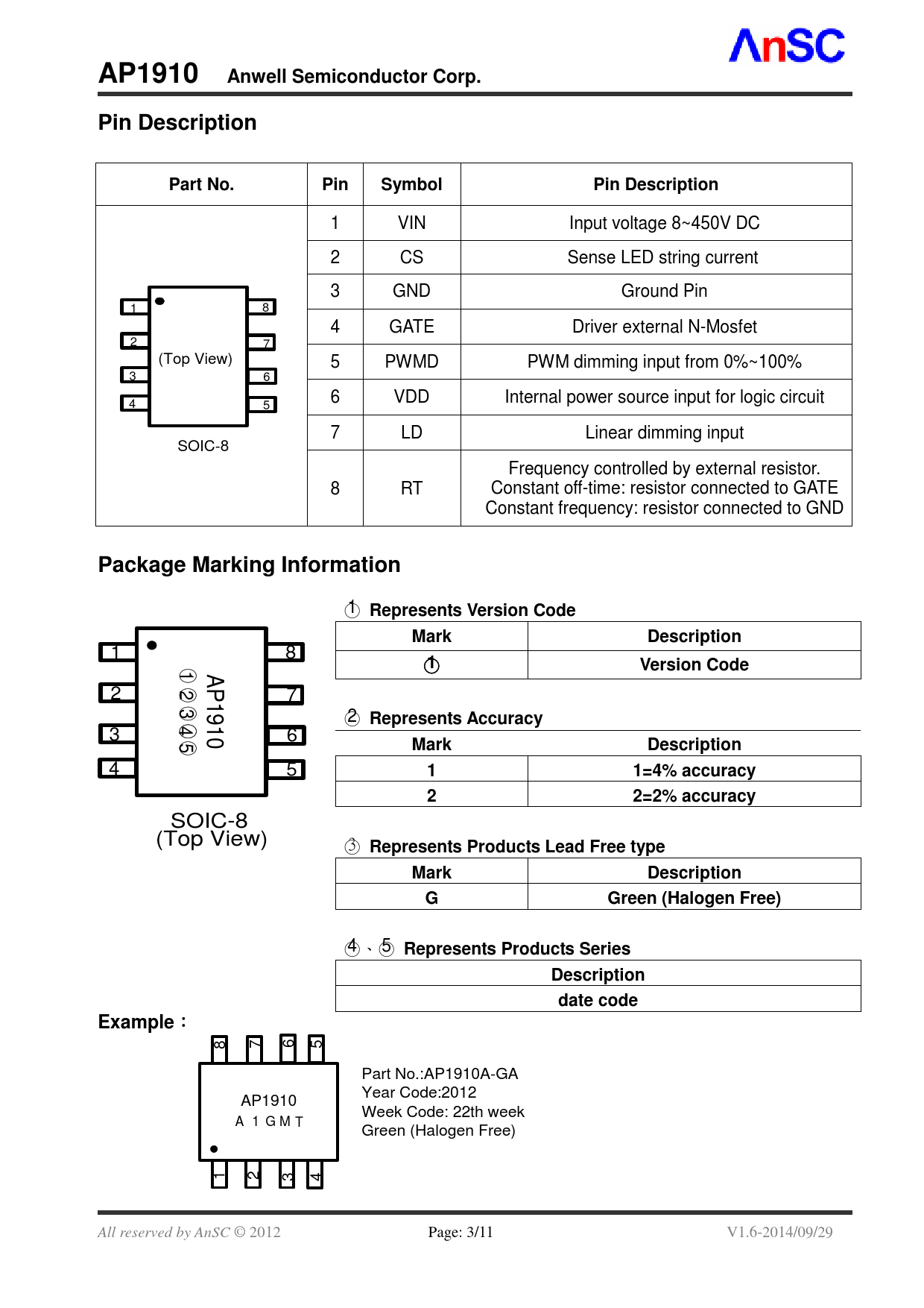 : 8 7 6 5 Part No.:AP1910A-GA Year Code:2012 AP1910 Week Code: 22th week A 1 G M T Green (Halogen Free) 1 2 3 4 All reserved by AnSC © 2012 Page: 3/11 V1.6-2014/09/29