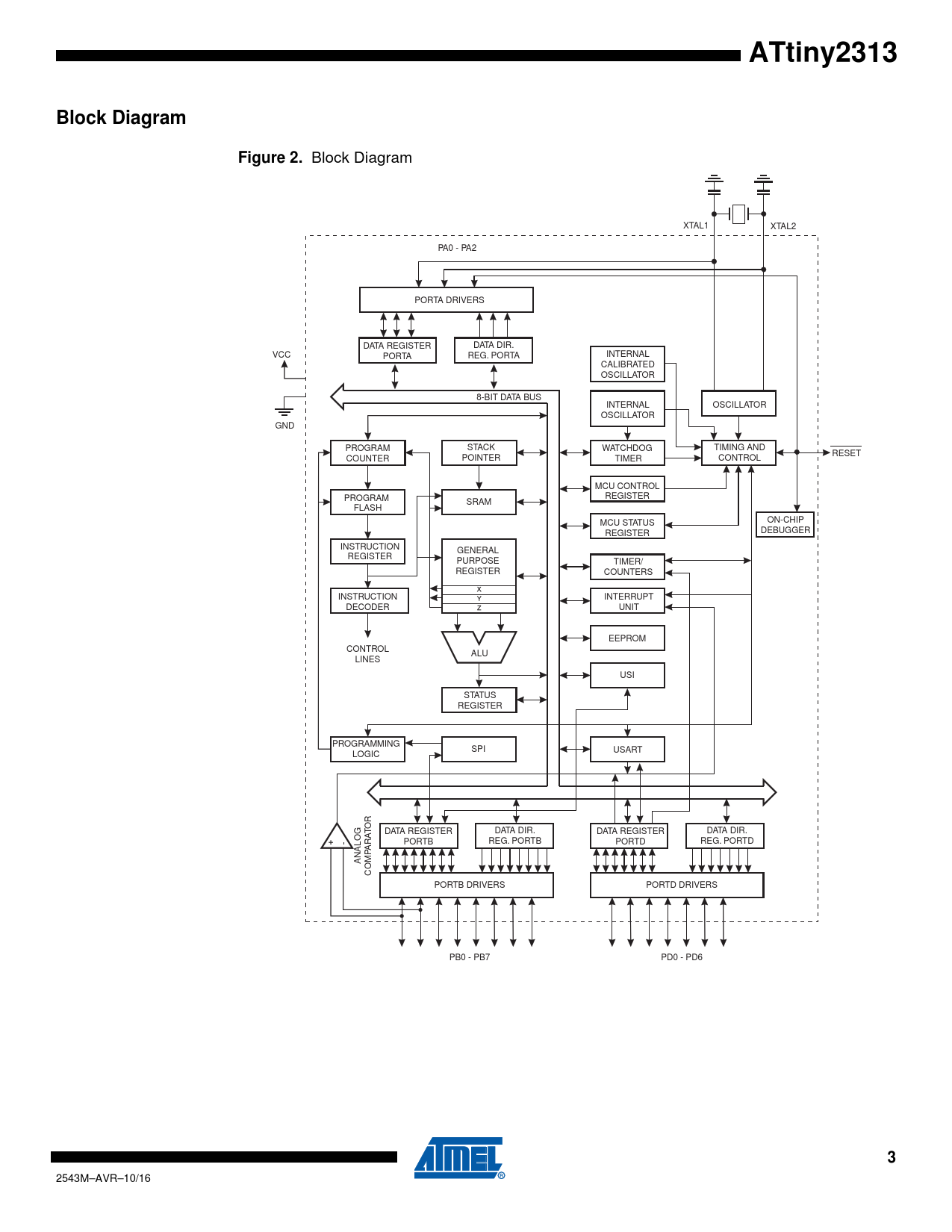 ATtiny2313Block DiagramFigure 2. Block Diagram XTAL1 XTAL2 PA0 - PA2 PORTA DRIVERS DATA REGISTER DATA DIR. VCC PORTA REG. PORTA INTERNAL CALIBRATED OSCILLATOR 8-BIT DATA BUS INTERNAL OSCILLATOR OSCILLATOR GND PROGRAM STACK WATCHDOG TIMING AND RESET COUNTER POINTER TIMER CONTROL MCU CONTROL PROGRAM REGISTER SRAM FLASH MCU STATUS ON-CHIP REGISTER DEBUGGER INSTRUCTION GENERAL REGISTER PURPOSE TIMER/ REGISTER COUNTERS INSTRUCTION INTERRUPT DECODER UNIT EEPROM CONTROL ALU LINES USI STATUS REGISTER PROGRAMMING SPI USART LOGIC R O T DATA REGISTER DATA DIR. DATA REGISTER DATA DIR. PORTB REG. PORTB PORTD REG. PORTD ARA ANALOG COMP PORTB DRIVERS PORTD DRIVERS PB0 - PB7 PD0 - PD6 3 2543M–AVR–10/16 Document Outline Features Pin Configurations Overview Block Diagram Pin Descriptions VCC GND Port A (PA2..PA0) Port B (PB7..PB0) Port D (PD6..PD0) RESET XTAL1 XTAL2 General Information Resources Code Examples Data Retention AVR CPU Core Introduction Architectural Overview ALU – Arithmetic Logic Unit Status Register General Purpose Register File The X-register, Y- register, and Z-register Stack Pointer Instruction Execution Timing Reset and Interrupt Handling Interrupt Response Time AVR ATtiny2313 Memories In-System Reprogrammable Flash Program Memory SRAM Data Memory Data Memory Access Times EEPROM Data Memory EEPROM Read/Write Access The EEPROM Address Register The EEPROM Data Register – EEDR The EEPROM Control Register – EECR Atomic Byte Programming Split Byte Programming Erase Write Preventing EEPROM Corruption I/O Memory General Purpose I/O Registers General Purpose I/O Register 2 – GPIOR2 General Purpose I/O Register 1 – GPIOR1 General Purpose I/O Register 0 – GPIOR0 System Clock and Clock Options Clock Systems and their Distribution CPU Clock – clkCPU I/O Clock – clkI/O Flash Clock – clkFLASH Clock Sources Default Clock Source Crystal Oscillator Calibrated Internal RC Oscillator Oscillator Calibration Register – OSCCAL External Clock 128 kHz Internal Oscillator System Clock Prescalar CLKPR – Clock Prescale Register Power Management and Sleep Modes MCU Control Register – MCUCR Idle Mode Power-down Mode Standby Mode Minimizing Power Consumption Analog Comparator Brown-out Detector Internal Voltage Reference Watchdog Timer Port Pins System Control and Reset Resetting the AVR Reset Sources Power-on Reset External Reset Brown-out Detection Watchdog Reset MCU Status Register – MCUSR Internal Voltage Reference Voltage Reference Enable Signals and Start-up Time Watchdog Timer Watchdog Timer Control and Status Register - WDTCSR Interrupts Interrupt Vectors in ATtiny2313 I/O-Ports Introduction Ports as General Digital I/O Configuring the Pin Toggling the Pin Switching Between Input and Output Reading the Pin Value Digital Input Enable and Sleep Modes Alternate Port Functions MCU Control Register – MCUCR Alternate Functions of Port A Alternate Functions of Port B Alternate Functions of Port D Register Description for I/O-Ports Port A Data Register – PORTA Port A Data Direction Register – DDRA Port A Input Pins Address – PINA Port B Data Register – PORTB Port B Data Direction Register – DDRB Port B Input Pins Address – PINB Port D Data Register – PORTD Port D Data Direction Register – DDRD Port D Input Pins Address – PIND External Interrupts Pin Change Interrupt Timing MCU Control Register – MCUCR General Interrupt Mask Register – GIMSK External Interrupt Flag Register – EIFR Pin Change Mask Register – PCMSK 8-bit Timer/Counter0 with PWM Overview Registers Definitions Timer/Counter Clock Sources Counter Unit Output Compare Unit Force Output Compare Compare Match Blocking by TCNT0 Write Using the Output Compare Unit Compare Match Output Unit Compare Output Mode and Waveform Generation Modes of Operation Normal Mode Clear Timer on Compare Match (CTC) Mode Fast PWM Mode Phase Correct PWM Mode Timer/Counter Timing Diagrams 8-bit Timer/Counter Register Description Timer/Counter Control Register A – TCCR0A Timer/Counter Control Register B – TCCR0B Timer/Counter Register – TCNT0 Output Compare Register A – OCR0A Output Compare Register B – OCR0B Timer/Counter Interrupt Mask Register – TIMSK Timer/Counter Interrupt Flag Register – TIFR Timer/Counter0 and Timer/Counter1 Prescalers Internal Clock Source Prescaler Reset External Clock Source General Timer/Counter Control Register – GTCCR 16-bit Timer/Counter1 Overview Registers Definitions Compatibility Accessing 16-bit Registers Reusing the Temporary High Byte Register Timer/Counter Clock Sources Counter Unit Input Capture Unit Input Capture Trigger Source Noise Canceler Using the Input Capture Unit Output Compare Units Force Output Compare Compare Match Blocking by TCNT1 Write Using the Output Compare Unit Compare Match Output Unit Compare Output Mode and Waveform Generation Modes of Operation Normal Mode Clear Timer on Compare Match (CTC) Mode Fast PWM Mode Phase Correct PWM Mode Phase and Frequency Correct PWM Mode Timer/Counter Timing Diagrams 16-bit Timer/Counter Register Description Timer/Counter1 Control Register A – TCCR1A Timer/Counter1 Control Register B – TCCR1B Timer/Counter1 Control Register C – TCCR1C Timer/Counter1 – TCNT1H and TCNT1L Output Compare Register 1 A – OCR1AH and OCR1AL Output Compare Register 1 B - OCR1BH and OCR1BL Input Capture Register 1 – ICR1H and ICR1L Timer/Counter Interrupt Mask Register – TIMSK Timer/Counter Interrupt Flag Register – TIFR USART Overview AVR USART vs. AVR UART – Compatibility Clock Generation Internal Clock Generation – The Baud Rate Generator Double Speed Operation (U2X) External Clock Synchronous Clock Operation Frame Formats Parity Bit Calculation USART Initialization Data Transmission – The USART Transmitter Sending Frames with 5 to 8 Data Bit Sending Frames with 9 Data Bit Transmitter Flags and Interrupts Parity Generator Disabling the Transmitter Data Reception – The USART Receiver Receiving Frames with 5 to 8 Data B