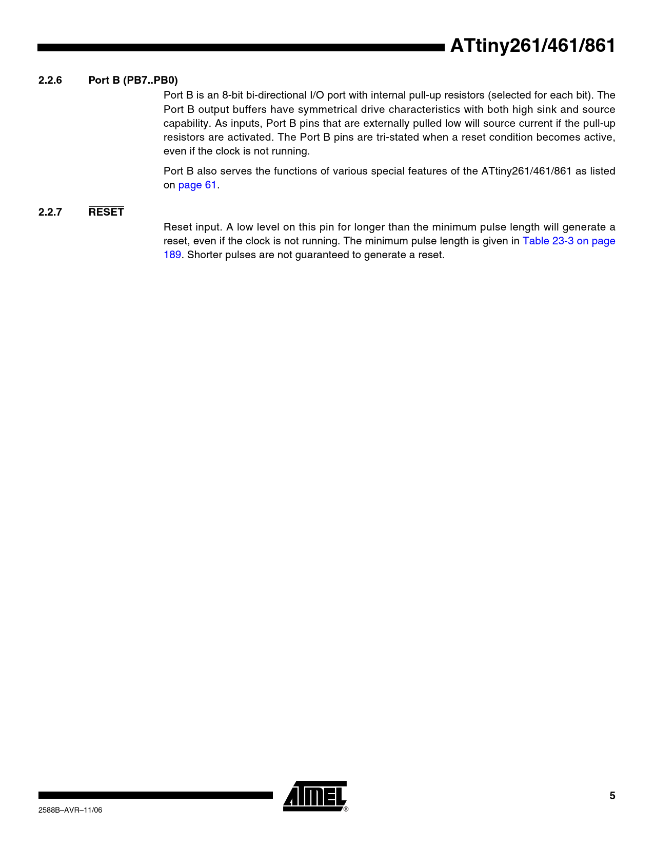 link to page 61 ATtiny261/461/8612.2.6Port B (PB7..PB0) Port B is an 8-bit bi-directional I/O port with internal pull-up resistors (selected for each bit). The Port B output buffers have symmetrical drive characteristics with both high sink and source capability. As inputs, Port B pins that are externally pulled low will source current if the pull-up resistors are activated. The Port B pins are tri-stated when a reset condition becomes active, even if the clock is not running. Port B also serves the functions of various special features of the ATtiny261/461/861 as listed on page 61. 2.2.7RESET Reset input. A low level on this pin for longer than the minimum pulse length will generate a reset, even if the clock is not running. The minimum pulse length is given in Table 23-3 on page 189. Shorter pulses are not guaranteed to generate a reset. 5 2588B–AVR–11/06 Document Outline Features 1. Pin Configurations 1.1 Disclaimer 2. Overview 2.1 Block Diagram 2.2 Pin Descriptions 2.2.1 VCC 2.2.2 GND 2.2.3 AVCC 2.2.4 AGND 2.2.5 Port A (PA7..PA0) 2.2.6 Port B (PB7..PB0) 2.2.7 RESET 3. Resources 4. About Code Examples 5. AVR CPU Core 5.1 Overview 5.2 ALU - Arithmetic Logic Unit 5.3 Status Register 5.3.1 SREG - AVR Status Register 5.4 General Purpose Register File 5.4.1 The X-register, Y-register, and Z-register 5.5 Stack Pointer 5.5.1 SPH and SPL - Stack Pointer Register 5.6 Instruction Execution Timing 5.7 Reset and Interrupt Handling 5.7.1 Interrupt Response Time 6. AVR Memories 6.1 In-System Re-programmable Flash Program Memory 6.2 SRAM Data Memory 6.2.1 Data Memory Access Times 6.3 EEPROM Data Memory 6.3.1 EEPROM Read/Write Access 6.3.2 Atomic Byte Programming 6.3.3 Split Byte Programming 6.3.4 Erase 6.3.5 Write 6.3.6 Preventing EEPROM Corruption 6.4 I/O Memory 6.4.1 General Purpose I/O Registers 6.5 Register Description 6.5.1 EEARH and EEARL - EEPROM Address Register 6.5.2 EEDR - EEPROM Data Register 6.5.3 EECR - EEPROM Control Register 6.5.4 GPIOR2 - General Purpose I/O Register 2 6.5.5 GPIOR1 - General Purpose I/O Register 1 6.5.6 GPIOR0 - General Purpose I/O Register 0 7. System Clock and Clock Options 7.1 Clock Systems and their Distribution 7.1.1 CPU Clock - clkCPU 7.1.2 I/O Clock - clkI/O 7.1.3 Flash Clock - clkFLASH 7.1.4 ADC Clock - clkADC 7.1.5 Internal PLL for Fast Peripheral Clock Generation - clkPCK 7.2 Clock Sources 7.3 Default Clock Source 7.4 External Clock 7.5 High Frequency PLL Clock - PLLCLK 7.6 Calibrated Internal RC Oscillator 7.7 128 kHz Internal Oscillator 7.8 Low-frequency Crystal Oscillator 7.9 Crystal Oscillator 7.10 Clock Output Buffer 7.11 System Clock Prescaler 7.11.1 Switching Time 7.12 Register Description 7.12.1 OSCCAL - Oscillator Calibration Register 7.12.2 CLKPR - Clock Prescale Register 8. Power Management and Sleep Modes 8.1 Sleep Modes 8.2 Idle Mode 8.3 ADC Noise Reduction Mode 8.4 Power-down Mode 8.5 Standby Mode 8.6 Power Reduction Register 8.7 Minimizing Power Consumption 8.7.1 Analog to Digital Converter 8.7.2 Analog Comparator 8.7.3 Brown-out Detector 8.7.4 Internal Voltage Reference 8.7.5 Watchdog Timer 8.7.6 Port Pins 8.8 Register Description 8.8.1 MCUCR - MCU Control Register 8.8.2 PRR - Power Reduction Register 9. System Control and Reset 9.0.1 Resetting the AVR 9.0.2 Reset Sources 9.0.3 Power-on Reset 9.0.4 External Reset 9.0.5 Brown-out Detection 9.0.6 Watchdog Reset 9.1 Internal Voltage Reference 9.1.1 Voltage Reference Enable Signals and Start-up Time 9.2 Watchdog Timer 9.3 Timed Sequences for Changing the Configuration of the Watchdog Timer 9.3.1 Safety Level 1 9.3.2 Safety Level 2 9.4 Register Description 9.4.1 MCUSR - MCU Status Register 9.4.2 WDTCR - Watchdog Timer Control Register 10. Interrupts 10.1 Interrupt Vectors in ATtiny261/461/861 11. External Interrupts 11.1 Register Description 11.1.1 MCUCR - MCU Control Register 11.1.2 GIMSK - General Interrupt Mask Register 11.1.3 GIFR - General Interrupt Flag Register 11.1.4 PCMSK0 - Pin Change Mask Register A 11.1.5 PCMSK1 - Pin Change Mask Register B 12. I/O Ports 12.1 Overview 12.2 Ports as General Digital I/O 12.2.1 Configuring the Pin 12.2.2 Toggling the Pin 12.2.3 Switching Between Input and Output 12.2.4 Reading the Pin Value 12.2.5 Digital Input Enable and Sleep Modes 12.2.6 Unconnected Pins 12.3 Alternate Port Functions 12.3.1 Alternate Functions of Port B 12.3.2 Alternate Functions of Port A 12.4 Register Description 12.4.1 MCUCR - MCU Control Register 12.4.2 PORTA - Port A Data Register 12.4.3 DDRA - Port A Data Direction Register 12.4.4 PINA - Port A Input Pins Address 12.4.5 PORTB - Port B Data Register 12.4.6 DDRB - Port B Data Direction Register 12.4.7 PINB - Port B Input Pins Address 13. Timer/Counter0 Prescaler 13.0.1 Prescaler Reset 13.0.2 External Clock Source 13.1 Register Description 13.1.1 TCCR0B - Timer/Counter0 Control Register B 14. Timer/Counter0 14.1 Features 14.2 Overview 14.2.1 Registers 14.2.2 Definitions 14.3 Timer/Counter Clock Sources 14.4 Counter Unit 14.5 Modes of Operation 14.5.1 Normal 8-bit Mode 14.5.2 Clear Timer on Compare Match (CTC) 8-bit Mode 14.5.3 16-bit Mode 14.5.4 8-bit Input Capture Mode 14.5.5 16-bit Input Capture Mode 14.6 Input Capture Unit 14.6.1 Input Capture Trigger Source 14.6.2 Noise Canceler 14.6.3 Using the Input Capture Unit 14.7 Output Compare Unit 14.7.1 Compare Match Blocking by TCNT0 Write 14.7.2 Using the Output Compare Unit 14.8 Timer/Counter Timing Diagrams 14.9 Accessing Registers in 16-bit Mode 14.9.1 Reusing the temporary high byte register 14.10 Register Description 14.10.1 TCCR0A - Timer/Counter0 Control Register A 14.10.2 TCNT0L - Timer/Counter0 Register Low Byte 14.10.3 TCNT0H - Timer/Counter0 Register High Byte 14.10.4 OCR0A - Timer/Counter0 Output Compare Register A 14.10.5 OCR0B - Timer/Counter0 Output Compare Register B 14.10.6 TIMSK - Timer/Counter0 Interrupt Mask Register 14.10.7 TIFR - Timer/Counter0 Interrupt Flag Register 15. Timer/Counter1 Prescaler 15.0.1 Prescaler Reset 15.0.2 Prescaler Initialization for Asy