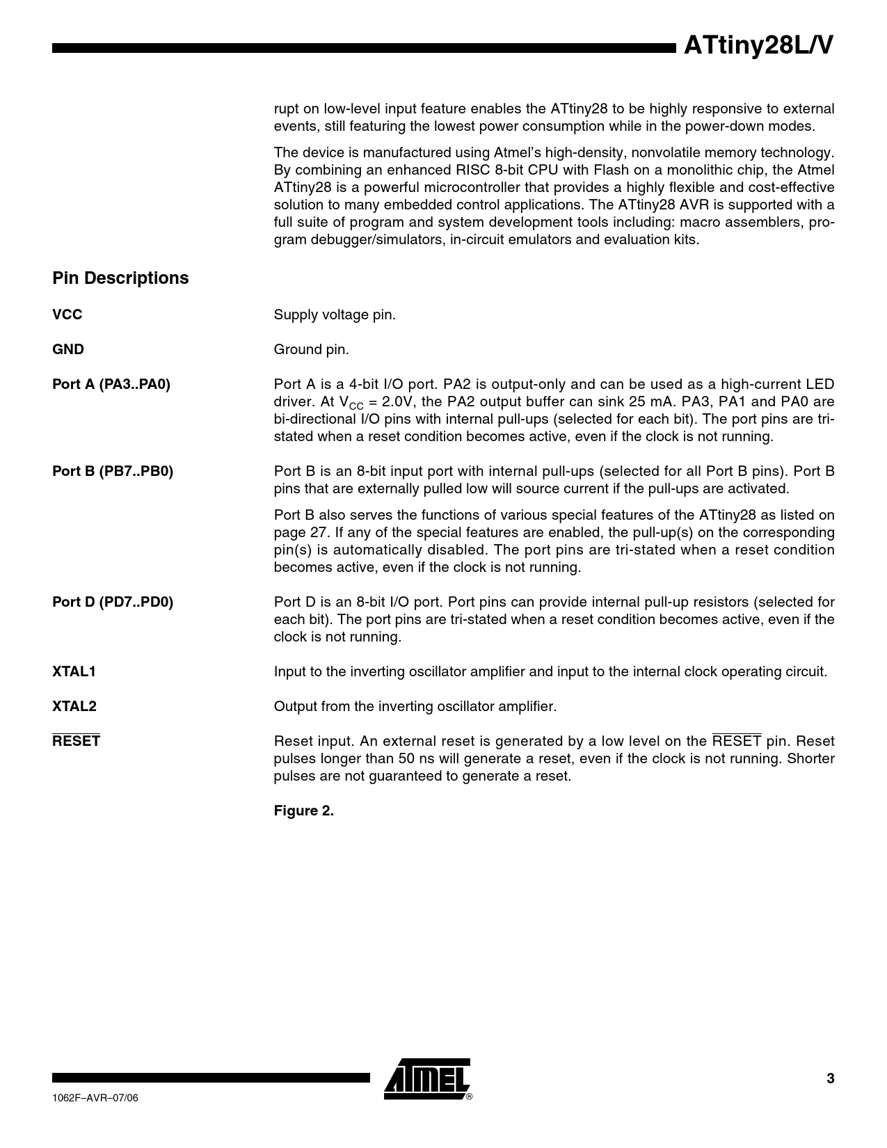 link to page 27 ATtiny28L/V rupt on low-level input feature enables the ATtiny28 to be highly responsive to external events, still featuring the lowest power consumption while in the power-down modes. The device is manufactured using Atmel’s high-density, nonvolatile memory technology. By combining an enhanced RISC 8-bit CPU with Flash on a monolithic chip, the Atmel ATtiny28 is a powerful microcontroller that provides a highly flexible and cost-effective solution to many embedded control applications. The ATtiny28 AVR is supported with a full suite of program and system development tools including: macro assemblers, pro- gram debugger/simulators, in-circuit emulators and evaluation kits. Pin DescriptionsVCC Supply voltage pin. GND Ground pin. Port A (PA3..PA0) Port A is a 4-bit I/O port. PA2 is output-only and can be used as a high-current LED driver. At V = 2.0V, the PA2 output buffer can sink 25 mA. PA3, PA1 and PA0 are CC bi-directional I/O pins with internal pull-ups (selected for each bit). The port pins are tri- stated when a reset condition becomes active, even if the clock is not running. Port B (PB7..PB0) Port B is an 8-bit input port with internal pull-ups (selected for all Port B pins). Port B pins that are externally pulled low will source current if the pull-ups are activated. Port B also serves the functions of various special features of the ATtiny28 as listed on page 27. If any of the special features are enabled, the pull-up(s) on the corresponding pin(s) is automatically disabled. The port pins are tri-stated when a reset condition becomes active, even if the clock is not running. Port D (PD7..PD0) Port D is an 8-bit I/O port. Port pins can provide internal pull-up resistors (selected for each bit). The port pins are tri-stated when a reset condition becomes active, even if the clock is not running. XTAL1 Input to the inverting oscillator amplifier and input to the internal clock operating circuit. XTAL2 Output from the inverting oscillator amplifier. RESET Reset input. An external reset is generated by a low level on the RESET pin. Reset pulses longer than 50 ns will generate a reset, even if the clock is not running. Shorter pulses are not guaranteed to generate a reset. Figure 2.3 1062F–AVR–07/06 Document Outline Features Pin Configurations Description Block Diagram Pin Descriptions VCC GND Port A (PA3..PA0) Port B (PB7..PB0) Port D (PD7..PD0) XTAL1 XTAL2 RESET Architectural Overview ALU - Arithmetic Logic Unit Subroutine and Interrupt Hardware Stack General-purpose Register File Status Register Status Register - SREG System Clock and Clock Options Internal RC Oscillator Calibrated Internal RC Oscillator Crystal Oscillator External Clock External RC Oscillator Register Description Oscillator Calibration Register - OSCCAL Memories I/O Memory Program and Data Addressing Modes Register Direct, Single Register Rd Register Indirect Register Direct, Two Registers Rd and Rr I/O Direct Relative Program Addressing, RJMP and RCALL Constant Addressing Using the LPM Instruction Memory Access and Instruction Execution Timing Flash Program Memory Sleep Modes Idle Mode Power-down Mode System Control and Reset Reset Sources Power-on Reset External Reset Watchdog Reset Register Description MCU Control and Status Register - MCUCS Interrupts Reset and Interrupt Interrupt Handling Interrupt Response Time External Interrupt Low-level Input Interrupt Register Description Interrupt Control Register - ICR Interrupt Flag Register - IFR I/O Ports Port A Port A as General Digital I/O Alternate Function of PA2 Port A Schematics Port B Port B as General Digital Input Alternate Functions of Port B Port B Schematics Port D Port D as General Digital I/O Register Description Port A Data Register - PORTA Port A Control Register - PACR Port A Input Pins Address - PINA Port B Input Pins Address - PINB Port D Data Register - PORTD Port D Data Direction Register - DDRD Port D Input Pins Address - PIND Timer/Counter0 Timer/Counter Prescaler Register Description Timer/Counter0 Control Register - TCCR0 Timer Counter 0 - TCNT0 Watchdog Timer Register Description Watchdog Timer Control Register - WDTCR Hardware Modulator Register Description Modulation Control Register - MODCR Analog Comparator Register Description Analog Comparator Control and Status Register - ACSR Memory Programming Program Memory Lock Bits Fuse Bits Signature Bytes Calibration Byte Programming the Flash Parallel Programming Signal Names Enter Programming Mode Chip Erase Programming the Flash Reading the Flash Programming the Fuse Bits Programming the Lock Bits Reading the Fuse and Lock Bits Reading the Signature Bytes and Calibration Byte Parallel Programming Characteristics Electrical Characteristics Absolute Maximum Ratings DC Characteristics External Clock Drive Waveforms External Clock Drive Typical Characteristics Register Summary Instruction Set Summary Ordering Information Packaging Information 32A 28P3 32M1-A Errata All revisions Datasheet Revision History Rev - 01/06G Rev - 01/06G Rev - 03/05F Table of Contents