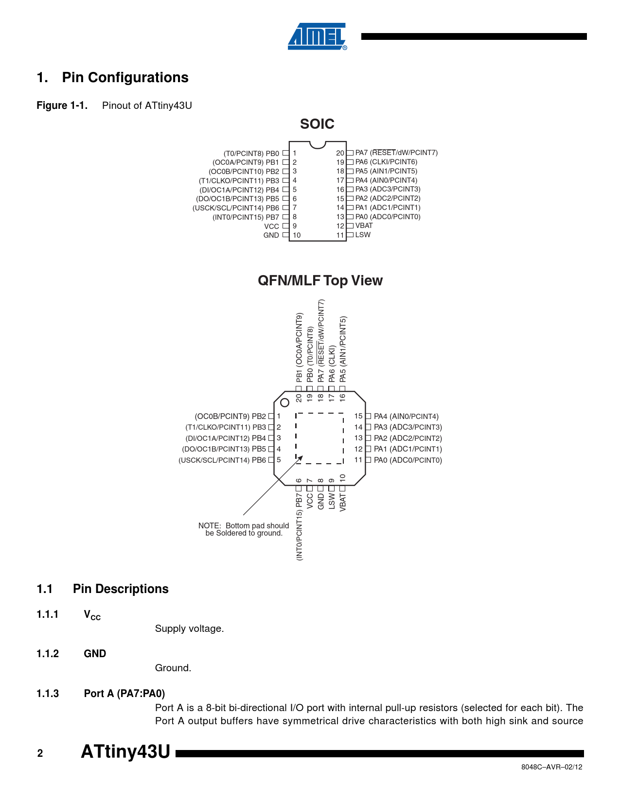 Pin Configurations. Figure 1-1. SOIC. QFN/MLF Top View. 1.1. Pin Descriptions. 1.1.1. VCC. 1.1.2. GND. 1.1.3. Port A (PA7:PA0). ATtiny43U