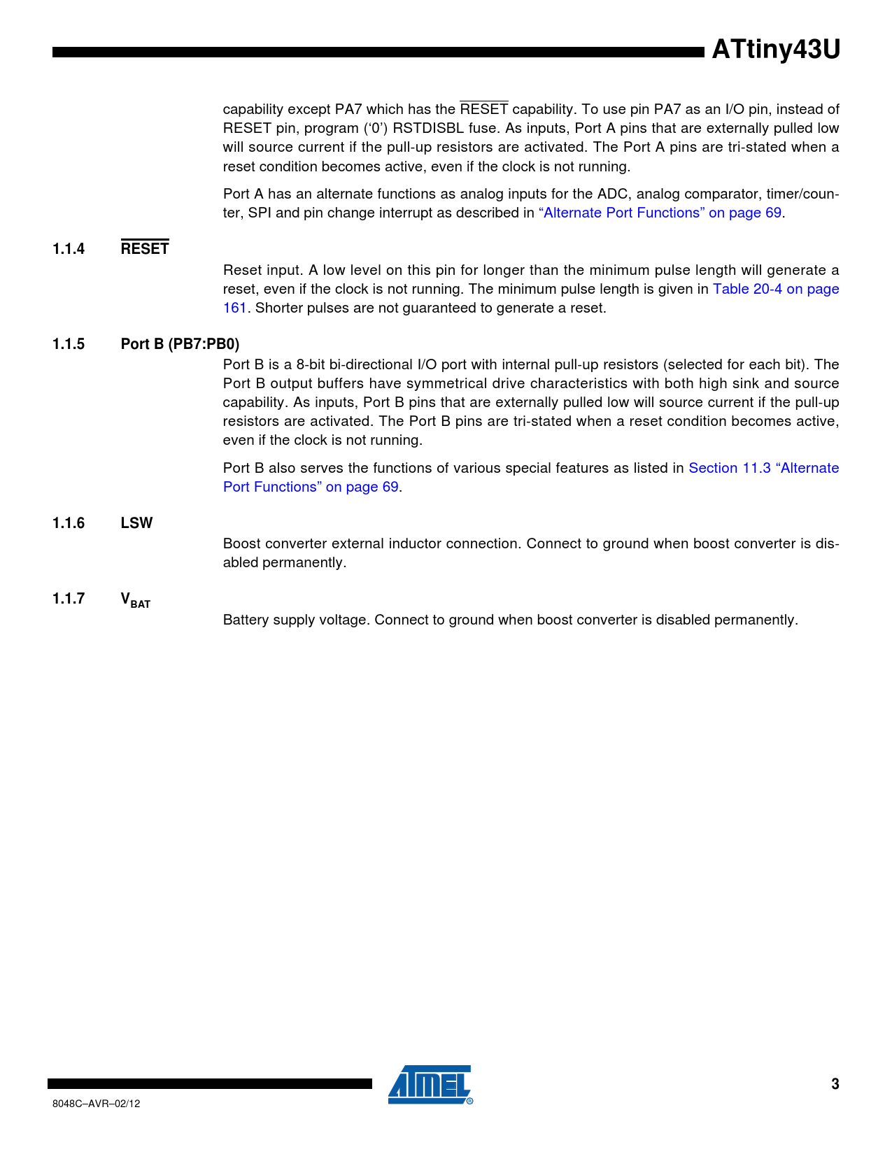 ATtiny43U 1.1.4 RESET 1.1.5 Port B (PB7:PB0) 1.1.6 LSW 1.1.7 VBAT