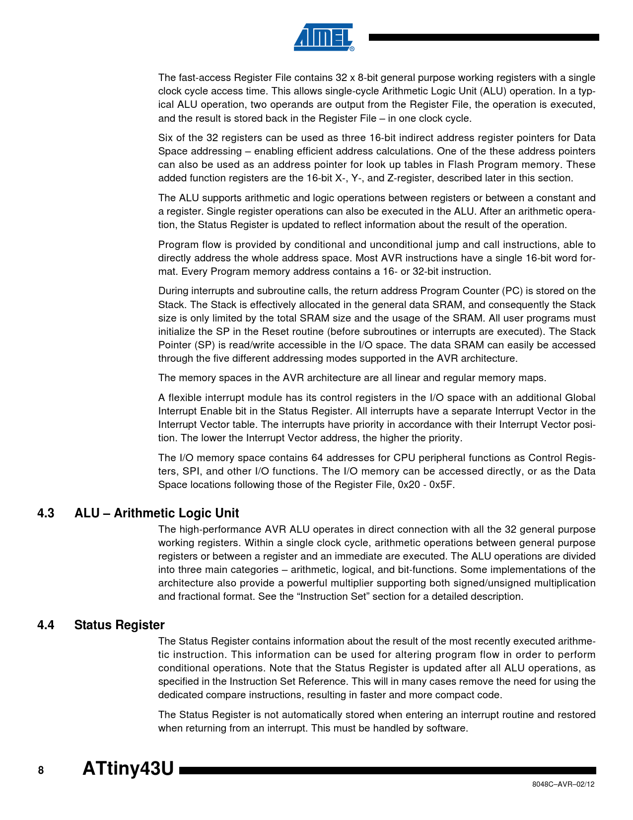 4.3. ALU – Arithmetic Logic Unit. 4.4. Status Register. ATtiny43U
