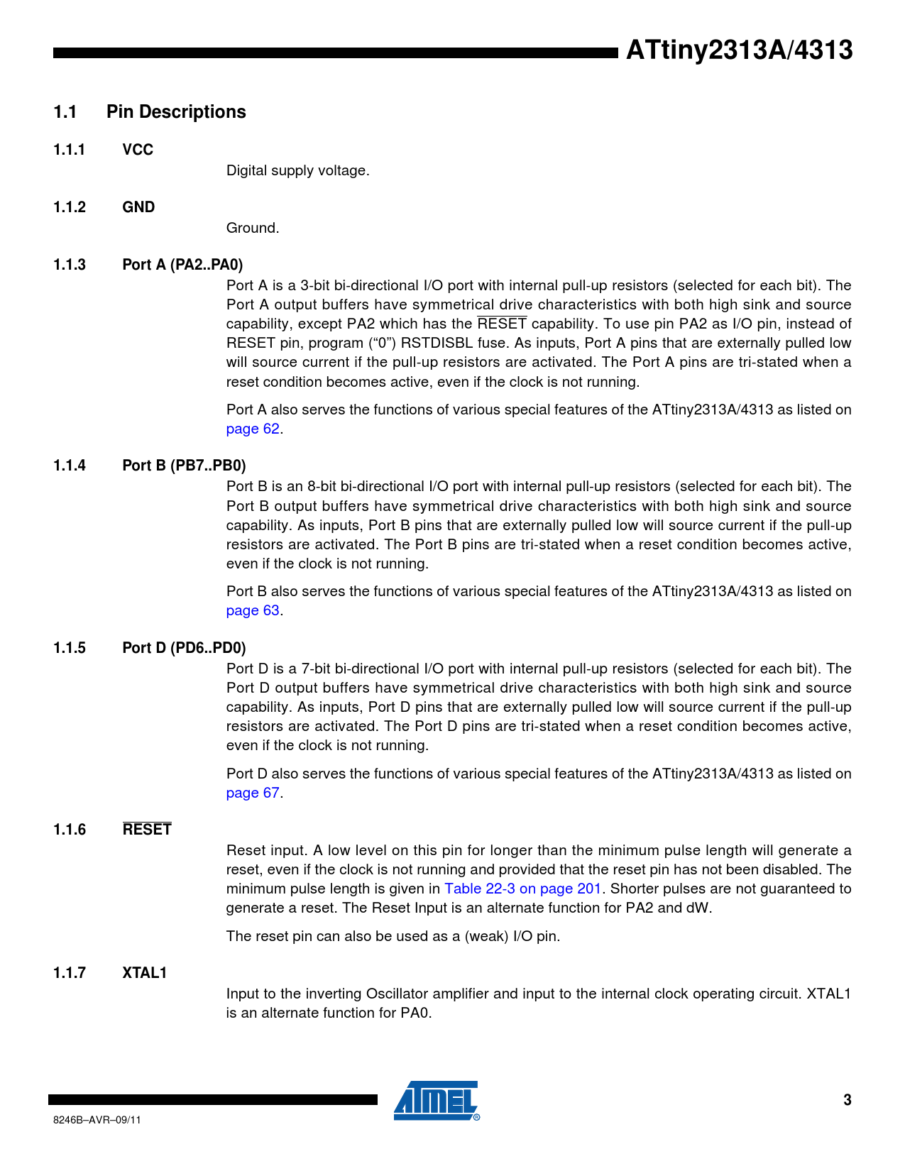 Pages / Page274 / 3 — ATtiny2313A/4313. 1.1. Pin Descriptions. 1.1.1. VCC. 1.1.2. GND. 1.1.3. …