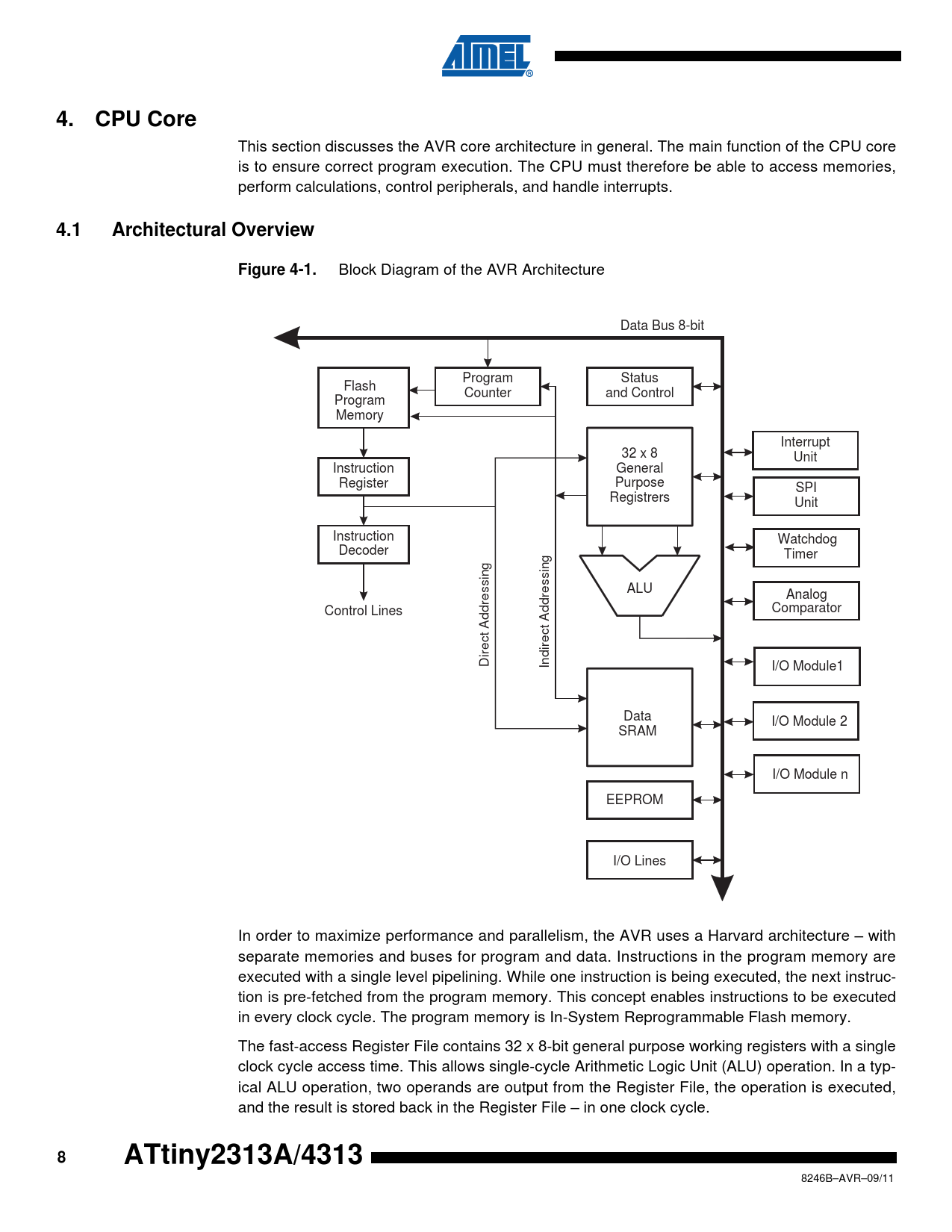 Pages / Page274 / 8 — CPU Core. 4.1. Architectural Overview. Figure 4-1. ATtiny2313A/4313