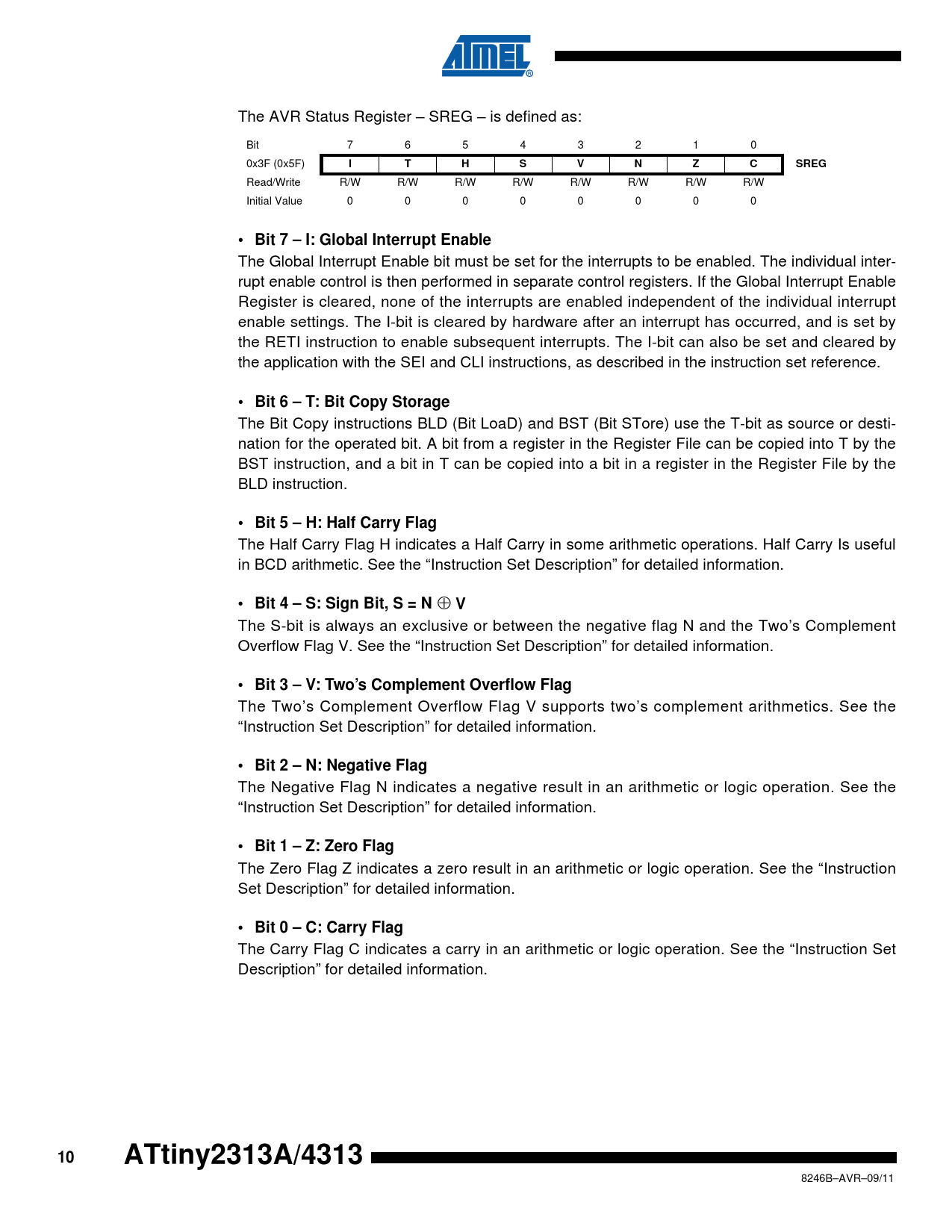 link to page 255 The AVR Status Register – SREG – is defined as: Bit 7 6 5 4 3 2 1 0 0x3F (0x5F) ITHSVNZCSREG Read/Write R/W R/W R/W R/W R/W R/W R/W R/W Initial Value 0 0 0 0 0 0 0 0 • Bit 7 – I: Global Interrupt Enable The Global Interrupt Enable bit must be set for the interrupts to be enabled. The individual inter- rupt enable control is then performed in separate control registers. If the Global Interrupt Enable Register is cleared, none of the interrupts are enabled independent of the individual interrupt enable settings. The I-bit is cleared by hardware after an interrupt has occurred, and is set by the RETI instruction to enable subsequent interrupts. The I-bit can also be set and cleared by the application with the SEI and CLI instructions, as described in the instruction set reference. • Bit 6 – T: Bit Copy Storage The Bit Copy instructions BLD (Bit LoaD) and BST (Bit STore) use the T-bit as source or desti- nation for the operated bit. A bit from a register in the Register File can be copied into T by the BST instruction, and a bit in T can be copied into a bit in a register in the Register File by the BLD instruction. • Bit 5 – H: Half Carry Flag The Half Carry Flag H indicates a Half Carry in some arithmetic operations. Half Carry Is useful in BCD arithmetic. See the “Instruction Set Description” for detailed information. • Bit 4 – S: Sign Bit, S = N ⊕ V The S-bit is always an exclusive or between the negative flag N and the Two’s Complement Overflow Flag V. See the “Instruction Set Description” for detailed information. • Bit 3 – V: Two’s Complement Overflow Flag The Two’s Complement Overflow Flag V supports two’s complement arithmetics. See the “Instruction Set Description” for detailed information. • Bit 2 – N: Negative Flag The Negative Flag N indicates a negative result in an arithmetic or logic operation. See the “Instruction Set Description” for detailed information. • Bit 1 – Z: Zero Flag The Zero Flag Z indicates a zero result in an arithmetic or logic operation. See the “Instruction Set Description” for detailed information. • Bit 0 – C: Carry Flag The Carry Flag C indicates a carry in an arithmetic or logic operation. See the “Instruction Set Description” for detailed information. 10ATtiny2313A/4313 8246B–AVR–09/11 Document Outline Features 1. Pin Configurations 1.1 Pin Descriptions 1.1.1 VCC 1.1.2 GND 1.1.3 Port A (PA2..PA0) 1.1.4 Port B (PB7..PB0) 1.1.5 Port D (PD6..PD0) 1.1.6 RESET 1.1.7 XTAL1 1.1.8 XTAL2 2. Overview 2.1 Block Diagram 2.2 Comparison Between ATtiny2313A and ATtiny4313 3. About 3.1 Resources 3.2 Code Examples 3.3 Data Retention 4. CPU Core 4.1 Architectural Overview 4.2 ALU – Arithmetic Logic Unit 4.3 Status Register 4.4 General Purpose Register File 4.4.1 The X-register, Y-register, and Z-register 4.5 Stack Pointer 4.6 Instruction Execution Timing 4.7 Reset and Interrupt Handling 4.7.1 Interrupt Response Time 5. Memories 5.1 Program Memory (Flash) 5.2 Data Memory (SRAM) and Register Files 5.2.1 General Purpose Register File 5.2.2 I/O Register File 5.2.3 Data Memory (SRAM) 5.3 Data Memory (EEPROM) 5.3.1 Programming Methods 5.3.2 Read 5.3.3 Erase 5.3.4 Write 5.3.5 Preventing EEPROM Corruption 5.3.6 Program Examples 5.4 Register Description 5.4.1 EEAR – EEPROM Address Register 5.4.2 EEDR – EEPROM Data Register 5.4.3 EECR – EEPROM Control Register 5.4.4 GPIOR2 – General Purpose I/O Register 2 5.4.5 GPIOR1 – General Purpose I/O Register 1 5.4.6 GPIOR0 – General Purpose I/O Register 0 6. Clock System 6.1 Clock Subsystems 6.1.1 CPU Clock – clkCPU 6.1.2 I/O Clock – clkI/O 6.1.3 Flash Clock – clkFLASH 6.2 Clock Sources 6.2.1 Default Clock Source 6.2.2 External Clock 6.2.3 Calibrated Internal RC Oscillator 6.2.4 128 kHz Internal Oscillator 6.2.5 Crystal Oscillator 6.3 System Clock Prescaler 6.3.1 Switching Time 6.4 Clock Output Buffer 6.5 Register Description 6.5.1 OSCCAL – Oscillator Calibration Register 6.5.2 CLKPR – Clock Prescale Register 7. Power Management and Sleep Modes 7.1 Sleep Modes 7.1.1 Idle Mode 7.1.2 Power-Down Mode 7.1.3 Standby Mode 7.2 Software BOD Disable 7.3 Power Reduction Register 7.4 Minimizing Power Consumption 7.4.1 Analog Comparator 7.4.2 Internal Voltage Reference 7.4.3 Brown-out Detector 7.4.4 Watchdog Timer 7.4.5 Port Pins 7.5 Register Description 7.5.1 MCUCR – MCU Control Register 7.5.2 PRR – Power Reduction Register 7.5.3 BODCR – Brown-Out Detector Control Register 8. System Control and Reset 8.1 Resetting the AVR 8.2 Reset Sources 8.2.1 Power-on Reset 8.2.2 External Reset 8.2.3 Brown-out Detection 8.2.4 Watchdog Reset 8.3 Internal Voltage Reference 8.3.1 Voltage Reference Enable Signals and Start-up Time 8.4 Watchdog Timer 8.4.1 Timed Sequences for Changing the Configuration of the Watchdog Timer 8.4.2 Code Example 8.5 Register Description 8.5.1 MCUSR – MCU Status Register 8.5.2 WDTCSR – Watchdog Timer Control and Status Register 9. Interrupts 9.1 Interrupt Vectors 9.2 External Interrupts 9.2.1 Low Level Interrupt 9.2.2 Pin Change Interrupt Timing 9.3 Register Description 9.3.1 MCUCR – MCU Control Register 9.3.2 GIMSK – General Interrupt Mask Register 9.3.3 GIFR – General Interrupt Flag Register 9.3.4 PCMSK2 – Pin Change Mask Register 2 9.3.5 PCMSK1 – Pin Change Mask Register 1 9.3.6 PCMSK0 – Pin Change Mask Register 0 10. I/O-Ports 10.1 Ports as General Digital I/O 10.1.1 Configuring the Pin 10.1.2 Toggling the Pin 10.1.3 Switching Between Input and Output 10.1.4 Reading the Pin Value 10.1.5 Digital Input Enable and Sleep Modes 10.1.6 Unconnected Pins 10.1.7 Program Examples 10.2 Alternate Port Functions 10.2.1 Alternate Functions of Port A 10.2.2 Alternate Functions of Port B 10.2.3 Alternate Functions of Port D 10.3 Register Description 10.3.1 MCUCR – MCU Control Register 10.3.2 PORTA – Port A Data Register 10.3.3 DDRA – Port A Data Direction Register 10.3.4 PINA – Port A Input Pins Address 10.3.