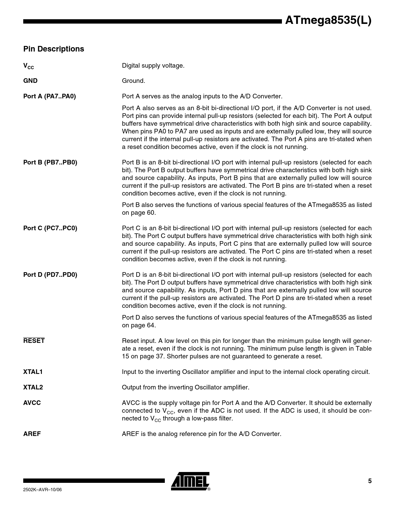 Pages / Page321 / 5 — ATmega8535(L). Pin Descriptions. GND. Port A (PA7..PA0). Port B …