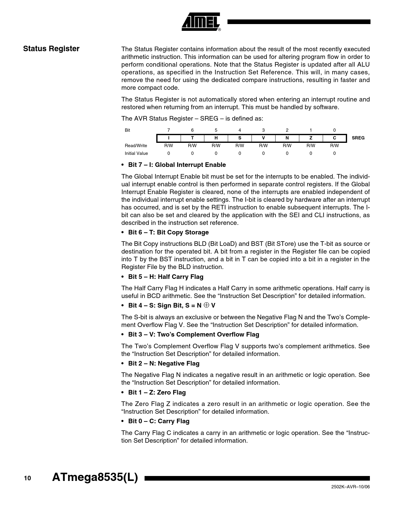 Status Register The Status Register contains information about the result of the most recently executed arithmetic instruction. This information can be used for altering program flow in order to perform conditional operations. Note that the Status Register is updated after all ALU operations, as specified in the Instruction Set Reference. This will, in many cases, remove the need for using the dedicated compare instructions, resulting in faster and more compact code. The Status Register is not automatically stored when entering an interrupt routine and restored when returning from an interrupt. This must be handled by software. The AVR Status Register – SREG – is defined as: Bit 7 6 5 4 3 2 1 0 ITHSVNZCSREG Read/Write R/W R/W R/W R/W R/W R/W R/W R/W Initial Value 0 0 0 0 0 0 0 0 • Bit 7 – I: Global Interrupt Enable The Global Interrupt Enable bit must be set for the interrupts to be enabled. The individ- ual interrupt enable control is then performed in separate control registers. If the Global Interrupt Enable Register is cleared, none of the interrupts are enabled independent of the individual interrupt enable settings. The I-bit is cleared by hardware after an interrupt has occurred, and is set by the RETI instruction to enable subsequent interrupts. The I- bit can also be set and cleared by the application with the SEI and CLI instructions, as described in the instruction set reference. • Bit 6 – T: Bit Copy Storage The Bit Copy instructions BLD (Bit LoaD) and BST (Bit STore) use the T-bit as source or destination for the operated bit. A bit from a register in the Register file can be copied into T by the BST instruction, and a bit in T can be copied into a bit in a register in the Register File by the BLD instruction. • Bit 5 – H: Half Carry Flag The Half Carry Flag H indicates a Half Carry in some arithmetic operations. Half carry is useful in BCD arithmetic. See the “Instruction Set Description” for detailed information. • Bit 4 – S: Sign Bit, S = N ⊕ V The S-bit is always an exclusive or between the Negative Flag N and the Two’s Comple- ment Overflow Flag V. See the “Instruction Set Description” for detailed information. • Bit 3 – V: Two’s Complement Overflow Flag The Two’s Complement Overflow Flag V supports two’s complement arithmetics. See the “Instruction Set Description” for detailed information. • Bit 2 – N: Negative Flag The Negative Flag N indicates a negative result in an arithmetic or logic operation. See the “Instruction Set Description” for detailed information. • Bit 1 – Z: Zero Flag The Zero Flag Z indicates a zero result in an arithmetic or logic operation. See the “Instruction Set Description” for detailed information. • Bit 0 – C: Carry Flag The Carry Flag C indicates a carry in an arithmetic or logic operation. See the “Instruc- tion Set Description” for detailed information. 10ATmega8535(L) 2502K–AVR–10/06 Document Outline Features Pin Configurations Disclaimer Overview Block Diagram AT90S8535 Compatibility AT90S8535 Compatibility Mode Pin Descriptions VCC GND Port A (PA7..PA0) Port B (PB7..PB0) Port C (PC7..PC0) Port D (PD7..PD0) RESET XTAL1 XTAL2 AVCC AREF Resources About Code Examples AVR CPU Core Introduction Architectural Overview ALU - Arithmetic Logic Unit Status Register General Purpose Register File The X-register, Y-register, and Z-register Stack Pointer Instruction Execution Timing Reset and Interrupt Handling Interrupt Response Time AVR ATmega8535 Memories In-System Reprogrammable Flash Program Memory SRAM Data Memory Data Memory Access Times EEPROM Data Memory EEPROM Read/Write Access The EEPROM Address Register - EEARH and EEARL The EEPROM Data Register - EEDR The EEPROM Control Register - EECR EEPROM Write During Power- down Sleep Mode Preventing EEPROM Corruption I/O Memory System Clock and Clock Options Clock Systems and their Distribution CPU Clock - clkCPU I/O Clock - clkI/O Flash Clock - clkFLASH Asynchronous Timer Clock - clkASY ADC Clock - clkADC Clock Sources Default Clock Source Crystal Oscillator Low-frequency Crystal Oscillator External RC Oscillator Calibrated Internal RC Oscillator Oscillator Calibration Register - OSCCAL External Clock Timer/Counter Oscillator Power Management and Sleep Modes MCU Control Register - MCUCR Idle Mode ADC Noise Reduction Mode Power-down Mode Power-save Mode Standby Mode Extended Standby Mode Minimizing Power Consumption Analog-to-Digital Converter Analog Comparator Brown-out Detector Internal Voltage Reference Watchdog Timer Port Pins System Control and Reset Resetting the AVR Reset Sources Power-on Reset External Reset Brown-out Detection Watchdog Reset MCU Control and Status Register - MCUCSR Internal Voltage Reference Voltage Reference Enable Signals and Start-up Time Watchdog Timer Watchdog Timer Control Register - WDTCR Timed Sequences for Changing the Configuration of the Watchdog Timer Safety Level 0 Safety Level 1 Safety Level 2 Interrupts Interrupt Vectors in ATmega8535 Moving Interrupts Between Application and Boot Space General Interrupt Control Register - GICR I/O-Ports Introduction Ports as General Digital I/O Configuring the Pin Reading the Pin Value Digital Input Enable and Sleep Modes Unconnected pins Alternate Port Functions Special Function IO Register - SFIOR Alternate Functions of Port A Alternate Functions Of Port B Alternate Functions of Port C Alternate Functions of Port D Register Description for I/O-Ports Port A Data Register - PORTA Port A Data Direction Register - DDRA Port A Input Pins Address - PINA Port B Data Register - PORTB Port B Data Direction Register - DDRB Port B Input Pins Address - PINB Port C Data Register - PORTC Port C Data Direction Register - DDRC Port C Input Pins Address - PINC Port D Data Register - PORTD Port D Data Direction Register - DDRD Port D Input Pins Address - PIND External Interrupts MCU Control Register - MCUCR MCU Control and Status Register - MCUCSR General Interrupt Co
