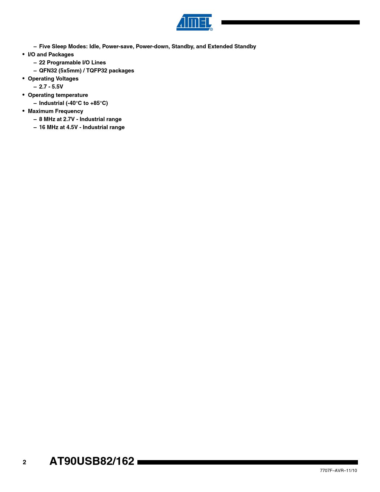 Maximum Frequency – 8 MHz at 2.7V - Industrial range – 16 MHz at 4.5V - Industrial range 2 AT90USB82/162