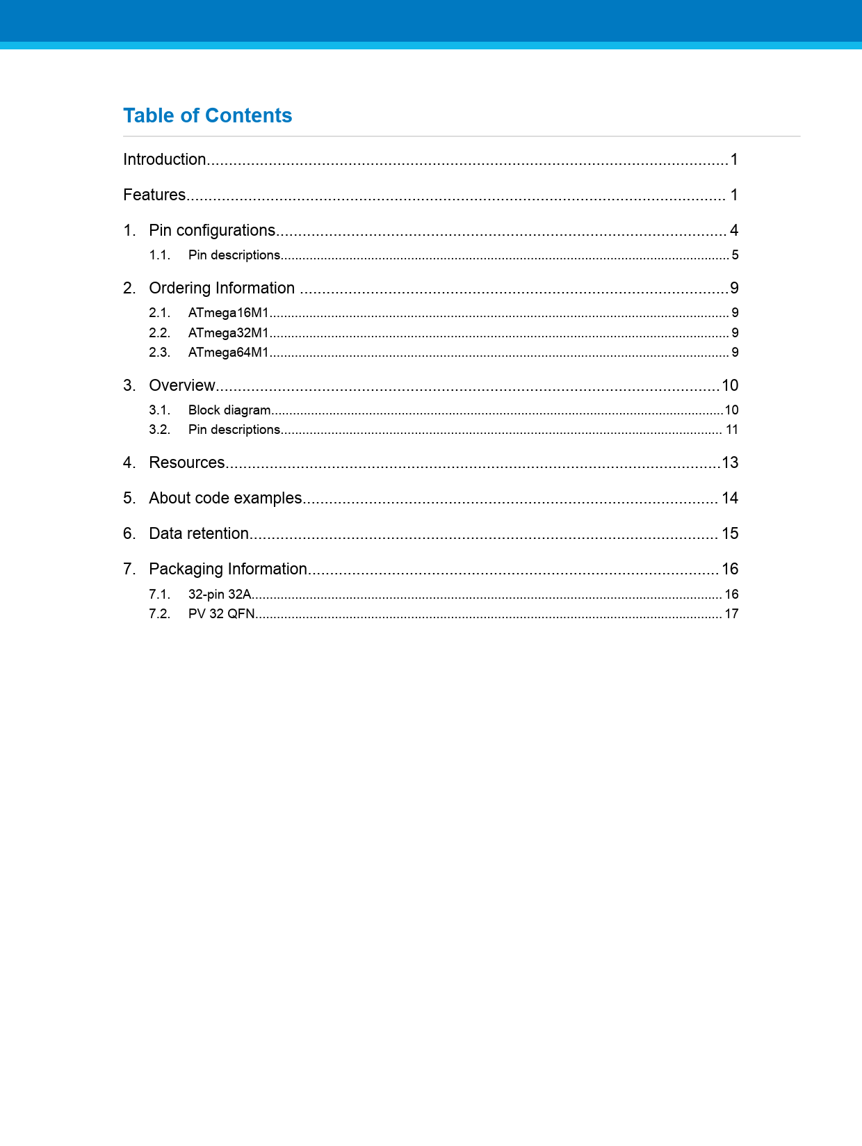 Introduction..1 Features.. 1 1. Pin configurations.. 4 1.1. Pin descriptions.. 5 2. Ordering Information ...9 2.1. ATmega16M1... 9 2.2. ATmega32M1... 9 2.3. ATmega64M1... 9 3. Overview..10 3.1. Block diagram...10 3.2. Pin descriptions.. 11 4. Resources..13 5. About code examples.. 14 6. Data retention.. 15 7. Packaging Information... 16 7.1. 32-pin 32A.. 16 7.2. PV 32 QFN... 17 Document Outline Introduction Features Table of Contents 1. Pin configurations 1.1. Pin descriptions 2. Ordering Information 2.1. ATmega16M1 2.2. ATmega32M1 2.3. ATmega64M1 3. Overview 3.1. Block diagram 3.2. Pin descriptions 3.2.1. VCC 3.2.2. GND 3.2.3. Port B (PB7..PB0) 3.2.4. Port C (PC7..PC0) 3.2.5. Port D (PD7..PD0) 3.2.6. Port E (PE2..0) RESET/ XTAL1/XTAL2 3.2.7. AVCC 3.2.8. AREF 4. Resources 5. About code examples 6. Data retention 7. Packaging Information 7.1. 32-pin 32A 7.2. PV 32 QFN
