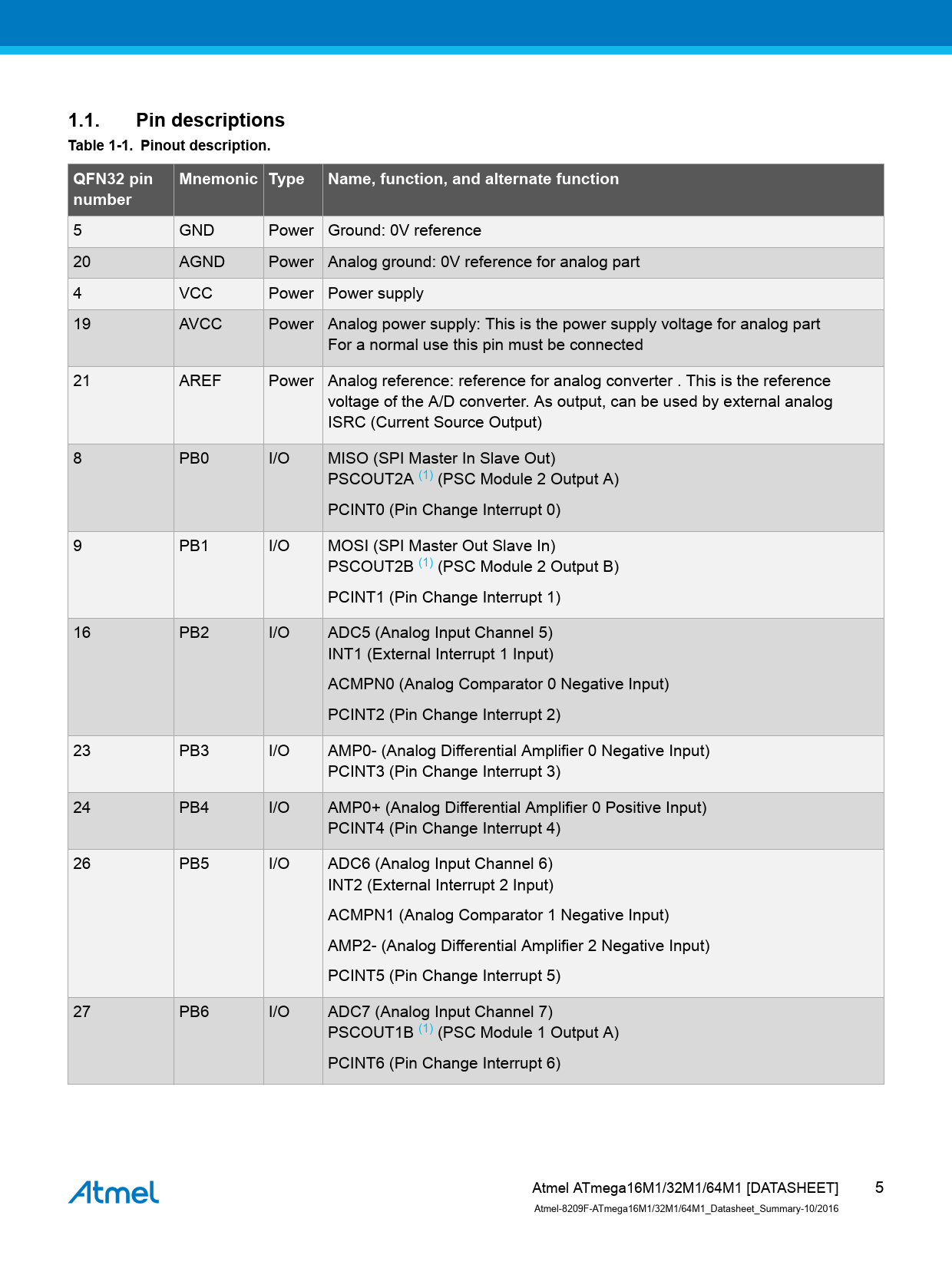 Pages / Page18 / 5 — 1.1. Pin descriptions. Table 1-1. Pinout description. QFN32 pin. Mnemonic …