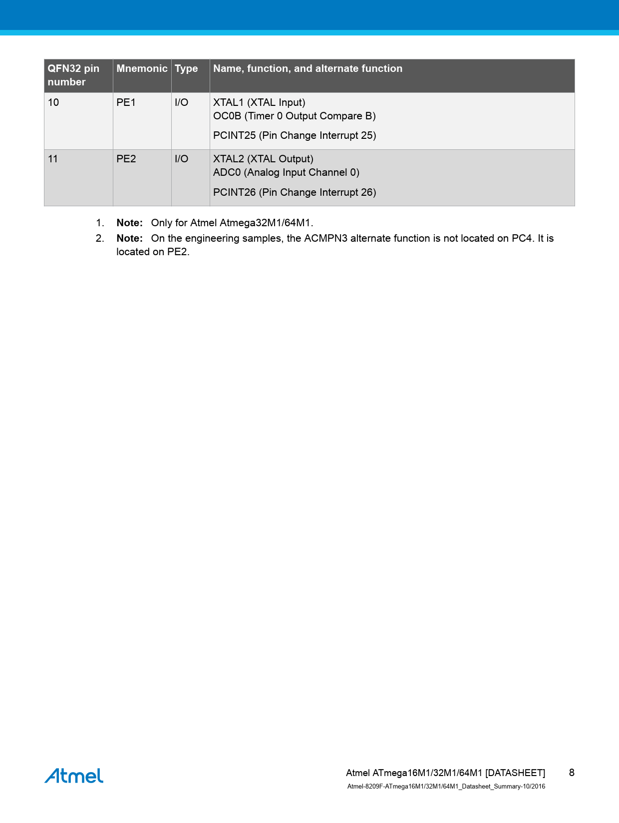 10 PE1 I/O XTAL1 (XTAL Input) OC0B (Timer 0 Output Compare B) PCINT25 (Pin Change Interrupt 25) 11 PE2 I/O XTAL2 (XTAL Output) ADC0 (Analog Input Channel 0) PCINT26 (Pin Change Interrupt 26) 1.