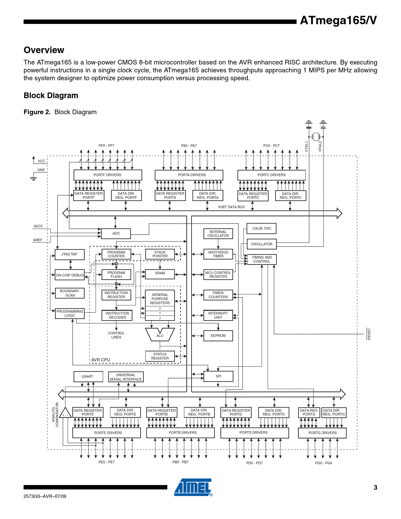 ATmega165/VOverview The ATmega165 is a low-power CMOS 8-bit microcontroller based on the AVR enhanced RISC architecture. By executing powerful instructions in a single clock cycle, the ATmega165 achieves throughputs approaching 1 MIPS per MHz allowing the system designer to optimize power consumption versus processing speed. Block DiagramFigure 2. Block Diagram PF0 - PF7 PA0 - PA7 PC0 - PC7 AL1 AL2 XT XT VCC GND PORTF DRIVERS PORTA DRIVERS PORTC DRIVERS DATA REGISTER DATA DIR. DATA REGISTER DATA DIR. DATA REGISTER DATA DIR. PORTF REG. PORTF PORTA REG. PORTA PORTC REG. PORTC 8-BIT DATA BUS AVCC CALIB. OSC INTERNAL ADC OSCILLATOR AREF OSCILLATOR PROGRAM STACK WATCHDOG JTAG TAP COUNTER POINTER TIMER TIMING AND CONTROL PROGRAM SRAM MCU CONTROL ON-CHIP DEBUG FLASH REGISTER BOUNDARY- INSTRUCTION TIMER/ SCAN GENERAL REGISTER COUNTERS PURPOSE REGISTERS X PROGRAMMING INSTRUCTION Y INTERRUPT LOGIC DECODER Z UNIT CONTROL ALU EEPROM LINES RESET STATUS REGISTER AVR CPU USART UNIVERSAL SPI SERIAL INTERFACE R O T DATA REGISTER DATA DIR. DATA REGISTER DATA DIR. DATA REGISTER DATA DIR. DATA REG. DATA DIR. ARA + - PORTE REG. PORTE PORTB REG. PORTB PORTD REG. PORTD PORTG REG. PORTG ANALOG COMP PORTE DRIVERS PORTB DRIVERS PORTD DRIVERS PORTG DRIVERS PE0 - PE7 PB0 - PB7 PD0 - PD7 PG0 - PG4 3 2573GS–AVR–07/09 Document Outline Features Pin Configurations Disclaimer Overview Block Diagram Pin Descriptions VCC GND Port A (PA7..PA0) Port B (PB7..PB0) Port C (PC7..PC0) Port D (PD7..PD0) Port E (PE7..PE0) Port F (PF7..PF0) Port G (PG4..PG0) RESET XTAL1 XTAL2 AVCC AREF Register Summary Instruction Set Summary Ordering Information Packaging Information 64A 64M1 Errata ATmega165 Rev A Datasheet Revision History Changes from Rev. 2573F-08/06 to Rev. 2573G-07/09 Changes from Rev. 2573E-07/06 to Rev. 2573F-08/06 Changes from Rev. 2573D-03/06 to Rev. 2573E-07/06 Changes from Rev. 2573C-03/06 to Rev. 2573D-03/06 Changes from Rev. 2573B-03/05 to Rev. 2573C-02/06 Changes from Rev. 2573A-06/04 to Rev. 2573B-03/05