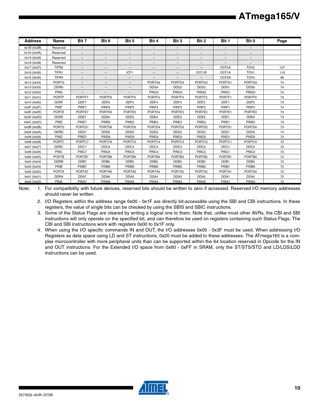 Pages / Page19 / 10 — ATmega165/V. Address. Name. Bit 7. Bit 6. Bit 5. Bit 4. Bit 3. Bit 2. Bit …