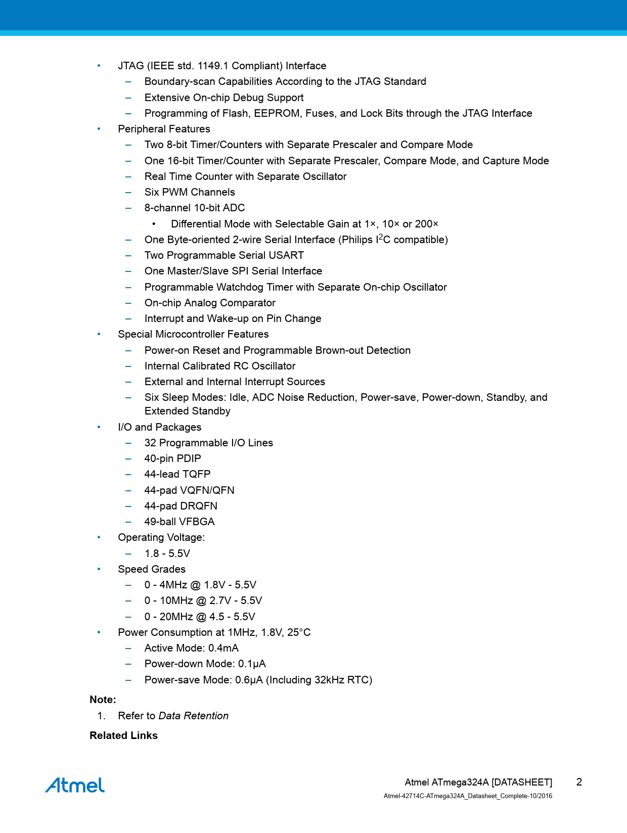 • JTAG (IEEE std. 1149.1 Compliant) Interface – Boundary-scan Capabilities According to the JTAG Standard – Extensive On-chip Debug Support – Programming of Flash, EEPROM, Fuses, and Lock Bits through the JTAG Interface • Peripheral Features – Two 8-bit Timer/Counters with Separate Prescaler and Compare Mode – One 16-bit Timer/Counter with Separate Prescaler, Compare Mode, and Capture Mode – Real Time Counter with Separate Oscillator – Six PWM Channels – 8-channel 10-bit ADC • Differential Mode with Selectable Gain at 1×, 10× or 200× – One Byte-oriented 2-wire Serial Interface (Philips I2C compatible) – Two Programmable Serial USART – One Master/Slave SPI Serial Interface – Programmable Watchdog Timer with Separate On-chip Oscillator – On-chip Analog Comparator – Interrupt and Wake-up on Pin Change • Special Microcontroller Features – Power-on Reset and Programmable Brown-out Detection – Internal Calibrated RC Oscillator – External and Internal Interrupt Sources – Six Sleep Modes: Idle, ADC Noise Reduction, Power-save, Power-down, Standby, and Extended Standby • I/O and Packages – 32 Programmable I/O Lines – 40-pin PDIP – 44-lead TQFP – 44-pad VQFN/QFN – 44-pad DRQFN – 49-ball VFBGA • Operating Voltage: – 1.8 - 5.5V • Speed Grades – 0 - 4MHz @ 1.8V - 5.5V – 0 - 10MHz @ 2.7V - 5.5V – 0 - 20MHz @ 4.5 - 5.5V • Power Consumption at 1MHz, 1.8V, 25°C – Active Mode: 0.4mA – Power-down Mode: 0.1μA – Power-save Mode: 0.6μA (Including 32kHz RTC) Note: 1. Refer to Data Retention Related Links Atmel ATmega324A [DATASHEET] 2 Atmel-42714C-ATmega324A_Datasheet_Complete-10/2016 Document Outline Introduction Feature Table of Contents 1. Description 2. Configuration Summary 3. Ordering Information 4. Block Diagram 5. Pin Configurations 5.1. Pinout 5.1.1. PDIP 5.1.2. TQFN and QFN 5.1.3. DRQFN 5.1.4. VFBGA 5.2. Pin Descriptions 5.2.1. VCC 5.2.2. GND 5.2.3. Port A (PA[7:0]) 5.2.4. Port B (PB[7:0]) 5.2.5. Port C (PC[7:0]) 5.2.6. Port D (PD[7:0]) 5.2.7. RESET 5.2.8. XTAL1 5.2.9. XTAL2 5.2.10. AVCC 5.2.11. AREF 6. I/O Multiplexing 7. General Information 7.1. Resources 7.2. Data Retention 7.3. About Code Examples 7.4. Capacitive Touch Sensing 7.4.1. QTouch Library 8. AVR CPU Core 8.1. Overview 8.2. ALU – Arithmetic Logic Unit 8.3. Status Register 8.3.1. Status Register 8.4. General Purpose Register File 8.4.1. The X-register, Y-register, and Z-register 8.5. Stack Pointer 8.5.1. Stack Pointer Register Low and High byte 8.6. Accessing 16-bit Registers 8.7. Instruction Execution Timing 8.8. Reset and Interrupt Handling 8.8.1. Interrupt Response Time 9. AVR Memories 9.1. Overview 9.2. In-System Reprogrammable Flash Program Memory 9.3. SRAM Data Memory 9.3.1. Data Memory Access Times 9.4. EEPROM Data Memory 9.4.1. EEPROM Read/Write Access 9.4.2. Preventing EEPROM Corruption 9.5. I/O Memory 9.5.1. General Purpose I/O Registers 9.6. Register Description 9.6.1. Accessing 16-bit Registers 9.6.2. EEPROM Address Register Low and High Byte 9.6.3. EEPROM Data Register 9.6.4. EEPROM Control Register 9.6.5. GPIOR2 – General Purpose I/O Register 2 9.6.6. GPIOR1 – General Purpose I/O Register 1 9.6.7. GPIOR0 – General Purpose I/O Register 0 10. System Clock and Clock Options 10.1. Clock Systems and Their Distribution 10.1.1. CPU Clock – clkCPU 10.1.2. I/O Clock – clkI/O 10.1.3. Flash Clock – clkFLASH 10.1.4. Asynchronous Timer Clock – clkASY 10.1.5. ADC Clock – clkADC 10.2. Clock Sources 10.2.1. Default Clock Source 10.2.2. Clock Startup Sequence 10.2.3. Clock Source Connections 10.3. Low Power Crystal Oscillator 10.4. Full Swing Crystal Oscillator 10.5. Low Frequency Crystal Oscillator 10.6. Calibrated Internal RC Oscillator 10.7. 128kHz Internal Oscillator 10.8. External Clock 10.9. Timer/Counter Oscillator 10.10. Clock Output Buffer 10.11. System Clock Prescaler 10.12. Register Description 10.12.1. Oscillator Calibration Register 10.12.2. Clock Prescaler Register 11. PM - Power Management and Sleep Modes 11.1. Overview 11.2. Sleep Modes 11.3. BOD Disable 11.4. Idle Mode 11.5. ADC Noise Reduction Mode 11.6. Power-Down Mode 11.7. Power-Save Mode 11.8. Standby Mode 11.9. Extended Standby Mode 11.10. Power Reduction Register 11.11. Minimizing Power Consumption 11.11.1. Analog to Digital Converter 11.11.2. Analog Comparator 11.11.3. Brown-Out Detector 11.11.4. Internal Voltage Reference 11.11.5. Watchdog Timer 11.11.6. Port Pins 11.11.7. On-chip Debug System 11.12. Register Description 11.12.1. Sleep Mode Control Register 11.12.2. MCU Control Register 11.12.3. Power Reduction Register 0 12. SCRST - System Control and Reset 12.1. Resetting the AVR 12.2. Reset Sources 12.3. Power-on Reset 12.4. External Reset 12.5. Brown-out Detection 12.6. Watchdog System Reset 12.7. Internal Voltage Reference 12.7.1. Voltage Reference Enable Signals and Start-up Time 12.8. Watchdog Timer 12.8.1. Features 12.8.2. Overview 12.9. Register Description 12.9.1. MCU Status Register 12.9.2. WDTCSR – Watchdog Timer Control Register 13. Interrupts 13.1. Overview 13.2. Interrupt Vectors in ATmega324A 13.3. Register Description 13.3.1. Moving Interrupts Between Application and Boot Space 13.3.2. MCU Control Register 14. External Interrupts 14.1. EXINT - External Interrupts 14.1.1. Pin Change Interrupt Timing 14.1.2. Register Description 14.1.2.1. External Interrupt Control Register A 14.1.2.2. External Interrupt Mask Register 14.1.2.3. External Interrupt Flag Register 14.1.2.4. Pin Change Interrupt Control Register 14.1.2.5. Pin Change Interrupt Flag Register 14.1.2.6. Pin Change Mask Register 0 14.1.2.7. Pin Change Mask Register 1 14.1.2.8. Pin Change Mask Register 2 14.1.2.9. Pin Change Mask Register 3 15. I/O-Ports 15.1. Overview 15.2. Ports as General Digital I/O 15.2.1. Configuring the Pin 15.2.2. Toggling the Pin 15.2.3. Switching Between Input and Output 15.2.4. Reading the Pin Value 15.2.5. Digital Input Enable and Sleep Modes 15.2.6. Unconnected Pi