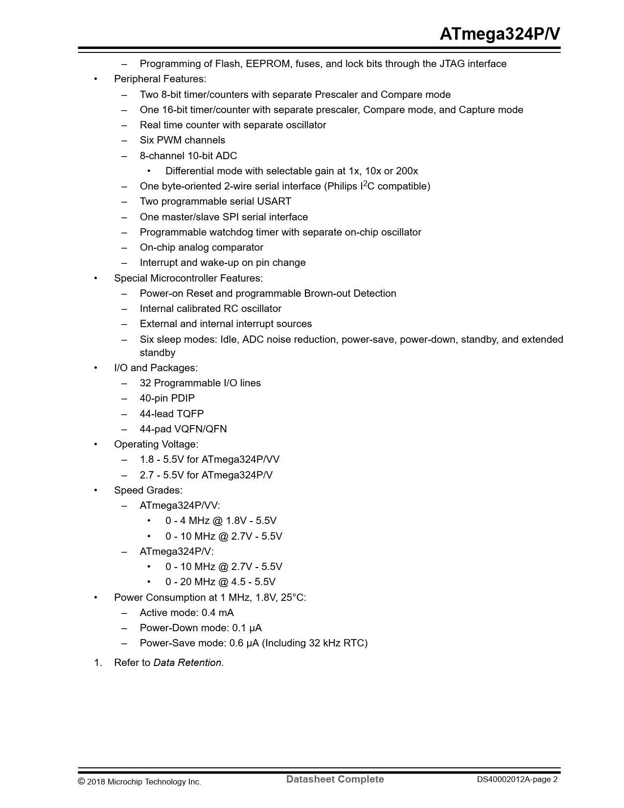 – Programming of Flash, EEPROM, fuses, and lock bits through the JTAG interface • Peripheral Features: – Two 8-bit timer/counters with separate Prescaler and Compare mode – One 16-bit timer/counter with separate prescaler, Compare mode, and Capture mode – Real time counter with separate oscillator – Six PWM channels – 8-channel 10-bit ADC • Differential mode with selectable gain at 1x, 10x or 200x – One byte-oriented 2-wire serial interface (Philips I2C compatible) – Two programmable serial USART – One master/slave SPI serial interface – Programmable watchdog timer with separate on-chip oscillator – On-chip analog comparator – Interrupt and wake-up on pin change • Special Microcontroller Features: – Power-on Reset and programmable Brown-out Detection – Internal calibrated RC oscillator – External and internal interrupt sources – Six sleep modes: Idle, ADC noise reduction, power-save, power-down, standby, and extended standby • I/O and Packages: – 32 Programmable I/O lines – 40-pin PDIP – 44-lead TQFP – 44-pad VQFN/QFN • Operating Voltage: – 1.8 - 5.5V for ATmega324P/VV – 2.7 - 5.5V for ATmega324P/V • Speed Grades: – ATmega324P/VV: • 0 - 4 MHz @ 1.8V - 5.5V • 0 - 10 MHz @ 2.7V - 5.5V – ATmega324P/V: • 0 - 10 MHz @ 2.7V - 5.5V • 0 - 20 MHz @ 4.5 - 5.5V • Power Consumption at 1 MHz, 1.8V, 25°C: – Active mode: 0.4 mA – Power-Down mode: 0.1 μA – Power-Save mode: 0.6 μA (Including 32 kHz RTC) 1. Refer to Data Retention. © 2018 Microchip Technology Inc.