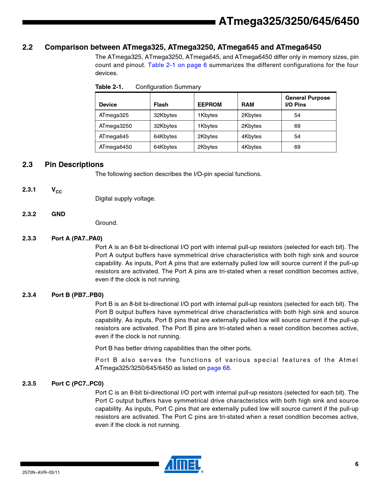 The ATmega325, ATmega3250, ATmega645, and ATmega6450 differ only in memory sizes, pin count and pinout. Table 2-1 on page 6 summarizes the different configurations for the four devices.