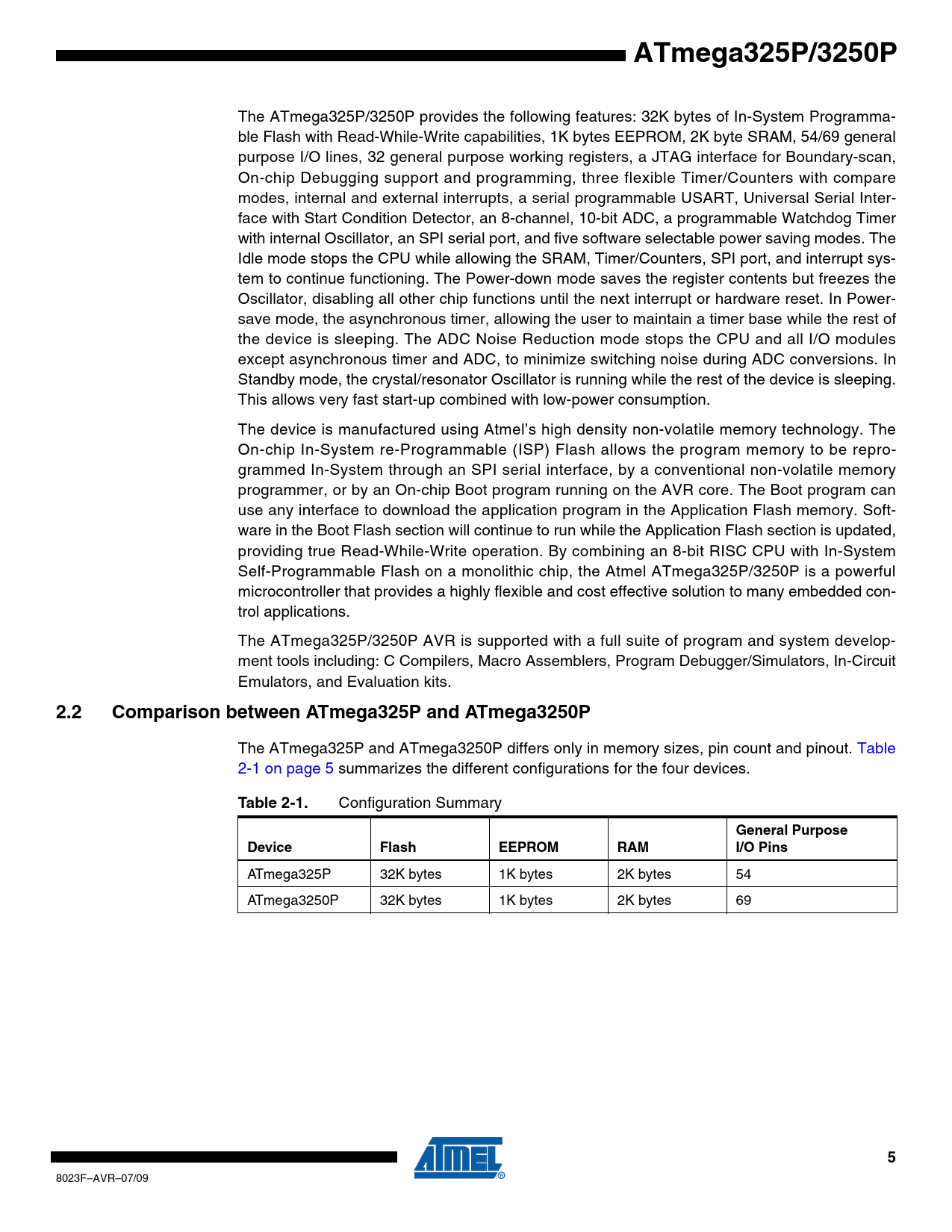 The ATmega325P and ATmega3250P differs only in memory sizes, pin count and pinout. Table 2-1 on page 5 summarizes the different configurations for the four devices.
