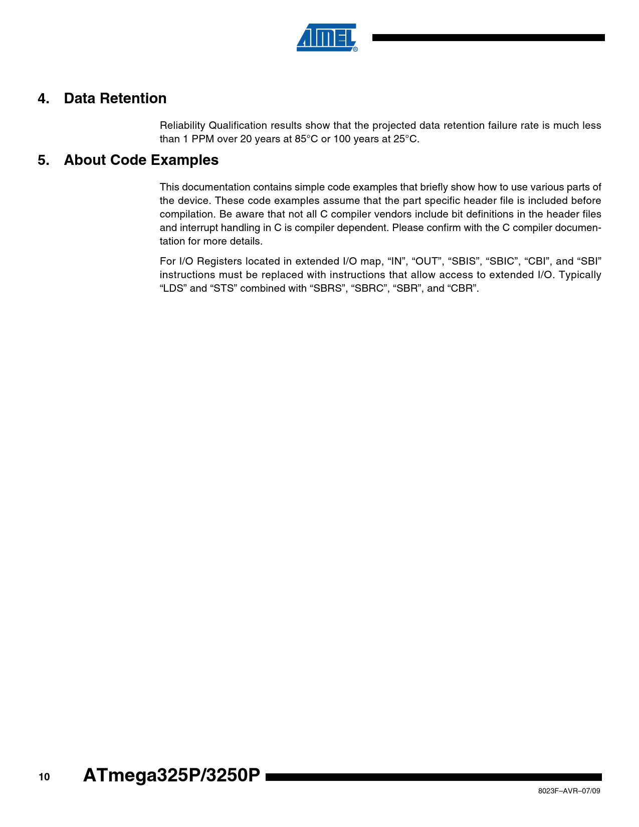 Note: 1. 4.Data Retention Reliability Qualification results show that the projected data retention failure rate is much less than 1 PPM over 20 years at 85°C or 100 years at 25°C. 5.About Code Examples This documentation contains simple code examples that briefly show how to use various parts of the device. These code examples assume that the part specific header file is included before compilation. Be aware that not all C compiler vendors include bit definitions in the header files and interrupt handling in C is compiler dependent. Please confirm with the C compiler documen- tation for more details. For I/O Registers located in extended I/O map, “IN”, “OUT”, “SBIS”, “SBIC”, “CBI”, and “SBI” instructions must be replaced with instructions that allow access to extended I/O. Typically “LDS” and “STS” combined with “SBRS”, “SBRC”, “SBR”, and “CBR”. 10ATmega325P/3250P 8023F–AVR–07/09 Document Outline Features 1. Pin Configurations 1.1 Disclaimer 2. Overview 2.1 Block Diagram 2.2 Comparison between ATmega325P and ATmega3250P 2.3 Pin Descriptions 2.3.1 VCC 2.3.2 GND 2.3.3 Port A (PA7..PA0) 2.3.4 Port B (PB7..PB0) 2.3.5 Port C (PC7..PC0) 2.3.6 Port D (PD7..PD0) 2.3.7 Port E (PE7..PE0) 2.3.8 Port F (PF7..PF0) 2.3.9 Port G (PG5..PG0) 2.3.10 Port H (PH7..PH0) 2.3.11 Port J (PJ6..PJ0) 2.3.12 RESET 2.3.13 XTAL1 2.3.14 XTAL2 2.3.15 AVCC 2.3.16 AREF 3. Resources 4. Data Retention 5. About Code Examples 6. AVR CPU Core 6.1 Overview 6.2 Architectural Overview 6.3 ALU – Arithmetic Logic Unit 6.4 AVR Status Register 6.4.1 SREG – AVR Status Register 6.5 General Purpose Register File 6.5.1 The X-register, Y-register, and Z-register 6.6 Stack Pointer 6.6.1 SPH and SPL – Stack Pointer High and Stack Pointer Low 6.7 Instruction Execution Timing 6.8 Reset and Interrupt Handling 6.8.1 Interrupt Response Time 7. AVR Memories 7.1 Overview 7.2 In-System Reprogrammable Flash Program Memory 7.3 SRAM Data Memory 7.3.1 Data Memory Access Times 7.4 EEPROM Data Memory 7.4.1 EEPROM Read/Write Access 7.4.2 EEPROM Write During Power-down Sleep Mode 7.4.3 Preventing EEPROM Corruption 7.5 I/O Memory 7.6 Register Description 7.6.1 EEARH and EEARL – The EEPROM Address Register 7.6.2 EEDR – The EEPROM Data Register 7.6.3 EECR – The EEPROM Control Register 7.6.4 General Purpose I/O Registers 7.6.5 GPIOR2 – General Purpose I/O Register 2 7.6.6 GPIOR1 – General Purpose I/O Register 1 7.6.7 GPIOR0 – General Purpose I/O Register 0 8. System Clock and Clock Options 8.1 Clock Systems and their Distribution 8.1.1 CPU Clock – clkCPU 8.1.2 I/O Clock – clkI/O 8.1.3 Flash Clock – clkFLASH 8.1.4 Asynchronous Timer Clock – clkASY 8.1.5 ADC Clock – clkADC 8.2 Clock Sources 8.3 Default Clock Source 8.4 Crystal Oscillator 8.5 Low-frequency Crystal Oscillator 8.6 Calibrated Internal RC Oscillator 8.7 External Clock 8.8 Clock Output Buffer 8.9 Timer/Counter Oscillator 8.10 System Clock Prescaler 8.10.1 Switching Time 8.11 Register Description 8.11.1 OSCCAL – Oscillator Calibration Register 8.11.2 CLKPR – Clock Prescale Register 9. Power Management and Sleep Modes 9.1 Overview 9.2 Sleep Modes 9.3 BOD Disable 9.4 Idle Mode 9.5 ADC Noise Reduction Mode 9.6 Power-down Mode 9.7 Power-save Mode 9.8 Standby Mode 9.9 Power Reduction Register 9.10 Minimizing Power Consumption 9.10.1 Analog to Digital Converter 9.10.2 Analog Comparator 9.10.3 Brown-out Detector 9.10.4 Internal Voltage Reference 9.10.5 Watchdog Timer 9.10.6 Port Pins 9.10.7 JTAG Interface and On-chip Debug System 9.11 Register Description 9.11.1 SMCR – Sleep Mode Control Register 9.11.2 MCUCR – MCU Control Register 9.11.3 PRR – Power Reduction Register 10. System Control and Reset 10.1 Resetting the AVR 10.2 Reset Sources 10.2.1 Power-on Reset 10.2.2 External Reset 10.2.3 Brown-out Detection 10.2.4 Watchdog Reset 10.3 Internal Voltage Reference 10.3.1 Voltage Reference Enable Signals and Start-up Time 10.4 Watchdog Timer 10.4.1 Timed Sequences for Changing the Configuration of the Watchdog Timer 10.4.2 Safety Level 1 10.4.3 Safety Level 2 10.5 Register Description 10.5.1 MCUSR – MCU Status Register 10.5.2 WDTCR – Watchdog Timer Control Register 11. Interrupts 11.1 Overview 11.2 Interrupt Vectors 11.2.1 Moving Interrupts Between Application and Boot Space 11.3 Register Description 11.3.1 MCUCR – MCU Control Register 12. External Interrupts 12.1 Overview 12.2 Pin Change Interrupt Timing 12.3 Register Description 12.3.1 EICRA – External Interrupt Control Register A 12.3.2 EIMSK – External Interrupt Mask Register 12.3.3 EIFR – External Interrupt Flag Register 12.3.4 PCMSK3 – Pin Change Mask Register 3(1) 12.3.5 PCMSK2 – Pin Change Mask Register 2(1) 12.3.6 PCMSK1 – Pin Change Mask Register 1 12.3.7 PCMSK0 – Pin Change Mask Register 0 13. I/O-Ports 13.1 Overview 13.2 Ports as General Digital I/O 13.2.1 Configuring the Pin 13.2.2 Toggling the Pin 13.2.3 Switching Between Input and Output 13.2.4 Reading the Pin Value 13.2.5 Digital Input Enable and Sleep Modes 13.2.6 Unconnected Pins 13.3 Alternate Port Functions 13.3.1 Alternate Functions of Port B 13.3.2 Alternate Functions of Port D 13.3.3 Alternate Functions of Port E 13.3.4 Alternate Functions of Port F 13.3.5 Alternate Functions of Port G 13.3.6 Alternate Functions of Port H 13.3.7 Alternate Functions of Port J 13.4 Register Description 13.4.1 MCUCR – MCU Control Register 13.4.2 PORTA – Port A Data Register 13.4.3 DDRA – Port A Data Direction Register 13.4.4 PINA – Port A Input Pins Address 13.4.5 PORTB – Port B Data Register 13.4.6 DDRB – Port B Data Direction Register 13.4.7 PINB – Port B Input Pins Address 13.4.8 PORTC – Port C Data Register 13.4.9 DDRC – Port C Data Direction Register 13.4.10 PINC – Port C Input Pins Address 13.4.11 PORTD – Port D Data Register 13.4.12 DDRD – Port D Data Direction Register 13.4.13 PIND – Port D Input Pins Address 13.4.14 PORTE – Port E Data Register 13.4.15 DDRE – P