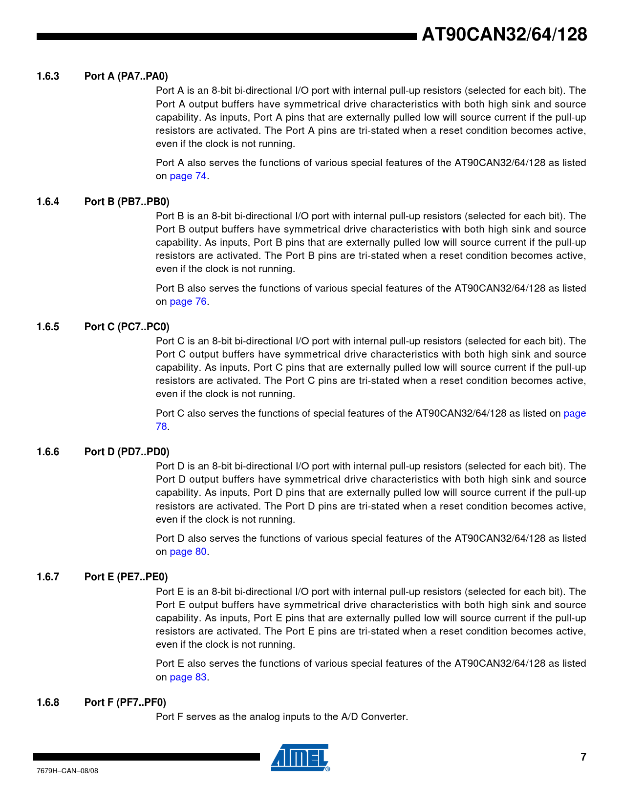 AT90CAN32/64/128 1.6.3 Port A (PA7..PA0) 1.6.4 Port B (PB7..PB0) 1.6.5 Port C (PC7..PC0) 1.6.6 Port D (PD7..PD0) 1.6.7