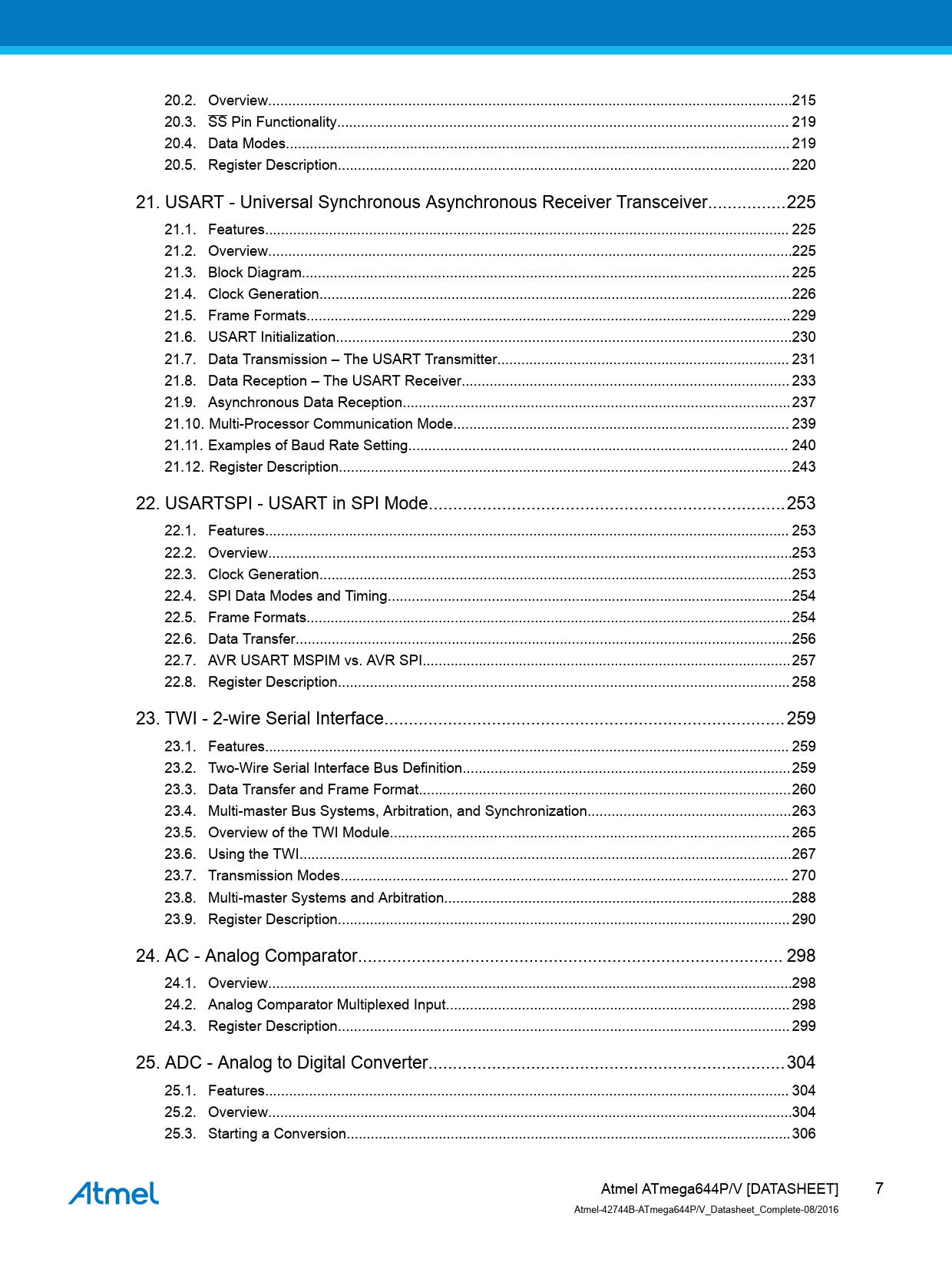 link to page 215 link to page 219 link to page 219 link to page 220 link to page 225 link to page 225 link to page 225 link to page 225 link to page 226 link to page 229 link to page 230 link to page 231 link to page 233 link to page 237 link to page 239 link to page 240 link to page 243 link to page 253 link to page 253 link to page 253 link to page 253 link to page 254 link to page 254 link to page 256 link to page 257 link to page 258 link to page 259 link to page 259 link to page 259 link to page 260 link to page 263 link to page 265 link to page 267 link to page 270 link to page 288 link to page 290 link to page 298 link to page 298 link to page 298 link to page 299 link to page 304 link to page 304 link to page 304 link to page 306 20.2. Overview...215 20.3. SS Pin Functionality... 219 20.4. Data Modes.. 219 20.5. Register Description... 220 21. USART - Universal Synchronous Asynchronous Receiver Transceiver..225 21.1. Features... 225 21.2. Overview...225 21.3. Block Diagram.. 225 21.4. Clock Generation..226 21.5. Frame Formats...229 21.6. USART Initialization..230 21.7. Data Transmission – The USART Transmitter... 231 21.8. Data Reception – The USART Receiver.. 233 21.9. Asynchronous Data Reception...237 21.10. Multi-Processor Communication Mode.. 239 21.11. Examples of Baud Rate Setting... 240 21.12. Register Description...243 22. USARTSPI - USART in SPI Mode...253 22.1. Features... 253 22.2. Overview...253 22.3. Clock Generation..253 22.4. SPI Data Modes and Timing...254 22.5. Frame Formats...254 22.6. Data Transfer..256 22.7. AVR USART MSPIM vs. AVR SPI..257 22.8. Register Description... 258 23. TWI - 2-wire Serial Interface..259 23.1. Features... 259 23.2. Two-Wire Serial Interface Bus Definition..259 23.3. Data Transfer and Frame Format...260 23.4. Multi-master Bus Systems, Arbitration, and Synchronization...263 23.5. Overview of the TWI Module.. 265 23.6. Using the TWI...267 23.7. Transmission Modes.. 270 23.8. Multi-master Systems and Arbitration...288 23.9. Register Description... 290 24. AC - Analog Comparator... 298 24.1. Overview...298 24.2. Analog Comparator Multiplexed Input.. 298 24.3. Register Description... 299 25. ADC - Analog to Digital Converter...304 25.1. Features... 304 25.2. Overview...304 25.3. Starting a Conversion...306 Atmel ATmega644P/V [DATASHEET] 7 Atmel-42744B-ATmega644P/V_Datasheet_Complete-08/2016 Document Outline Introduction Feature Table of Contents 1. Description 2. Configuration Summary 3. Ordering Information 4. Block Diagram 5. Pin Configurations 5.1. Pinout 5.1.1. PDIP 5.1.2. TQFN and QFN 5.2. Pin Descriptions 5.2.1. VCC 5.2.2. GND 5.2.3. Port A (PA[7:0]) 5.2.4. Port B (PB[7:0]) 5.2.5. Port C (PC[7:0]) 5.2.6. Port D (PD[7:0]) 5.2.7. RESET 5.2.8. XTAL1 5.2.9. XTAL2 5.2.10. AVCC 5.2.11. AREF 6. I/O Multiplexing 7. General Information 7.1. Resources 7.2. Data Retention 7.3. About Code Examples 7.4. Capacitive Touch Sensing 7.4.1. QTouch Library 8. AVR CPU Core 8.1. Overview 8.2. ALU – Arithmetic Logic Unit 8.3. Status Register 8.3.1. Status Register 8.4. General Purpose Register File 8.4.1. The X-register, Y-register, and Z-register 8.5. Stack Pointer 8.5.1. Stack Pointer Register Low and High byte 8.5.2. Extended Z-pointer Register for ELPM/SPM 8.6. Accessing 16-bit Registers 8.7. Instruction Execution Timing 8.8. Reset and Interrupt Handling 8.8.1. Interrupt Response Time 9. AVR Memories 9.1. Overview 9.2. In-System Reprogrammable Flash Program Memory 9.3. SRAM Data Memory 9.3.1. Data Memory Access Times 9.4. EEPROM Data Memory 9.4.1. EEPROM Read/Write Access 9.4.2. Preventing EEPROM Corruption 9.5. I/O Memory 9.5.1. General Purpose I/O Registers 9.6. Register Description 9.6.1. EEPROM Address Register Low and High Byte 9.6.2. EEPROM Data Register 9.6.3. EEPROM Control Register 9.6.4. GPIOR2 – General Purpose I/O Register 2 9.6.5. GPIOR1 – General Purpose I/O Register 1 9.6.6. GPIOR0 – General Purpose I/O Register 0 10. System Clock and Clock Options 10.1. Clock Systems and Their Distribution 10.1.1. CPU Clock – clkCPU 10.1.2. I/O Clock – clkI/O 10.1.3. Flash Clock – clkFLASH 10.1.4. Asynchronous Timer Clock – clkASY 10.1.5. ADC Clock – clkADC 10.2. Clock Sources 10.2.1. Default Clock Source 10.2.2. Clock Startup Sequence 10.2.3. Clock Source Connections 10.3. Low Power Crystal Oscillator 10.4. Full Swing Crystal Oscillator 10.5. Low Frequency Crystal Oscillator 10.6. Calibrated Internal RC Oscillator 10.7. 128kHz Internal Oscillator 10.8. External Clock 10.9. Timer/Counter Oscillator 10.10. Clock Output Buffer 10.11. System Clock Prescaler 10.12. Register Description 10.12.1. Oscillator Calibration Register 10.12.2. Clock Prescaler Register 11. PM - Power Management and Sleep Modes 11.1. Overview 11.2. Sleep Modes 11.3. BOD Disable 11.4. Idle Mode 11.5. ADC Noise Reduction Mode 11.6. Power-Down Mode 11.7. Power-save Mode 11.8. Standby Mode 11.9. Extended Standby Mode 11.10. Power Reduction Register 11.11. Minimizing Power Consumption 11.11.1. Analog to Digital Converter 11.11.2. Analog Comparator 11.11.3. Brown-Out Detector 11.11.4. Internal Voltage Reference 11.11.5. Watchdog Timer 11.11.6. Port Pins 11.11.7. On-chip Debug System 11.12. Register Description 11.12.1. Sleep Mode Control Register 11.12.2. MCU Control Register 11.12.3. Power Reduction Register 0 12. SCRST - System Control and Reset 12.1. Resetting the AVR 12.2. Reset Sources 12.3. Power-on Reset 12.4. External Reset 12.5. Brown-out Detection 12.6. Watchdog System Reset 12.7. Internal Voltage Reference 12.7.1. Voltage Reference Enable Signals and Start-up Time 12.8. Watchdog Timer 12.8.1. Features 12.8.2. Overview 12.9. Register Description 12.9.1. MCU Status Register 12.9.2. WDTCSR – Watchdog Timer Control Register 13. Interrupts 13.1. Overview 13.2. Interrupt Vectors in ATmega644P 13.3. Register Description 13.3.1. Moving Interrupts Between Application and Boot Space 13.3.2. MCU Control Register 14. External Interrupts 14.1. EXINT - External Interrupts