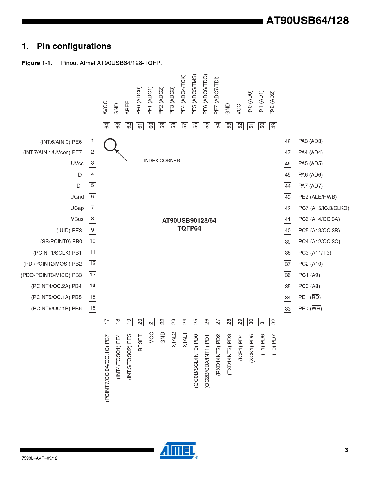 | Pages / Page | 456 / 3 — AT90USB64/128. Pin configurations. Figure 1-1. AT90USB90128/64. TQFP64 |