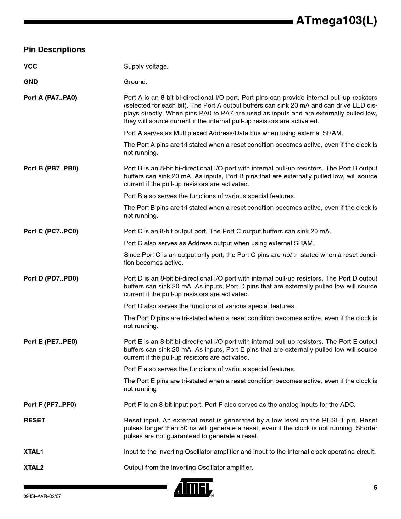 ATmega103(L)Pin DescriptionsVCC Supply voltage. GND Ground. Port A (PA7..PA0) Port A is an 8-bit bi-directional I/O port. Port pins can provide internal pull-up resistors (selected for each bit). The Port A output buffers can sink 20 mA and can drive LED dis- plays directly. When pins PA0 to PA7 are used as inputs and are externally pulled low, they will source current if the internal pull-up resistors are activated. Port A serves as Multiplexed Address/Data bus when using external SRAM. The Port A pins are tri-stated when a reset condition becomes active, even if the clock is not running. Port B (PB7..PB0) Port B is an 8-bit bi-directional I/O port with internal pull-up resistors. The Port B output buffers can sink 20 mA. As inputs, Port B pins that are externally pulled low, will source current if the pull-up resistors are activated. Port B also serves the functions of various special features. The Port B pins are tri-stated when a reset condition becomes active, even if the clock is not running. Port C (PC7..PC0) Port C is an 8-bit output port. The Port C output buffers can sink 20 mA. Port C also serves as Address output when using external SRAM. Since Port C is an output only port, the Port C pins are not tri-stated when a reset condi- tion becomes active. Port D (PD7..PD0) Port D is an 8-bit bi-directional I/O port with internal pull-up resistors. The Port D output buffers can sink 20 mA. As inputs, Port D pins that are externally pulled low will source current if the pull-up resistors are activated. Port D also serves the functions of various special features. The Port D pins are tri-stated when a reset condition becomes active, even if the clock is not running. Port E (PE7..PE0) Port E is an 8-bit bi-directional I/O port with internal pull-up resistors. The Port E output buffers can sink 20 mA. As inputs, Port E pins that are externally pulled low will source current if the pull-up resistors are activated. Port E also serves the functions of various special features. The Port E pins are tri-stated when a reset condition becomes active, even if the clock is not running Port F (PF7..PF0) Port F is an 8-bit input port. Port F also serves as the analog inputs for the ADC. RESET Reset input. An external reset is generated by a low level on the RESET pin. Reset pulses longer than 50 ns will generate a reset, even if the clock is not running. Shorter pulses are not guaranteed to generate a reset. XTAL1 Input to the inverting Oscillator amplifier and input to the internal clock operating circuit. XTAL2 Output from the inverting Oscillator amplifier. 5 0945I–AVR–02/07 Document Outline Features Pin Configuration Description Block Diagram Pin Descriptions VCC GND Port A (PA7..PA0) Port B (PB7..PB0) Port C (PC7..PC0) Port D (PD7..PD0) Port E (PE7..PE0) Port F (PF7..PF0) RESET XTAL1 XTAL2 TOSC1 TOSC2 WR RD ALE AVCC AREF AGND PEN Clock Options Crystal Oscillator External Clock Timer Oscillator Architectural Overview General Purpose Register File X-register, Y-register and Z- register ALU - Arithmetic Logic Unit ISP Flash Program Memory SRAM Data Memory Program and Data Addressing Modes Register Direct, Single Register Rd Register Direct, Two Registers Rd and Rr I/O Direct Data Direct Data Indirect with Displacement Data Indirect Data Indirect with Pre- decrement Data Indirect with Post- increment Constant Addressing Using the LPM and ELPM Instructions Direct Program Address, JMP and CALL Indirect Program Addressing, IJMP and ICALL Relative Program Addressing, RJMP and RCALL EEPROM Data Memory Memory Access Times and Instruction Execution Timing I/O Memory Status Register - SREG Stack Pointer - SP RAM Page Z Select Register - RAMPZ MCU Control Register - MCUCR XTAL Divide Control Register - XDIV Reset and Interrupt Handling Reset Sources Power-on Reset External Reset Watchdog Reset MCU Status Register - MCUSR Interrupt Handling External Interrupt Mask Register - EIMSK External Interrupt Flag Register - EIFR External Interrupt Control Register - EICR Timer/Counter Interrupt Mask Register - TIMSK Timer/Counter Interrupt Flag Register - TIFR Interrupt Response Time Sleep Modes Idle Mode Power-down Mode Power-save Mode Timer/Counters Timer/Counter Prescalers 8-bit Timer/Counters T/C0 and T/C2 Timer/Counter0 Control Register - TCCR0 Timer/Counter2 Control Register - TCCR2 Timer/Counter0 - TCNT0 Timer/Counter2 - TCNT2 Timer/Counter0 Output Compare Register - OCR0 Timer/Counter2 Output Compare Register - OCR2 Timer/Counters 0 and 2 in PWM Mode Asynchronous Status Register - ASSR Asynchronous Operation of Timer/Counter0 16-bit Timer/Counter1 Timer/Counter1 Control Register A - TCCR1A Timer/Counter1 Control Register B - TCCR1B Timer/Counter1 - TCNT1H and TCNT1L Timer/Counter1 Output Compare Register - OCR1AH and OCR1AL Timer/Counter1 Output Compare Register - OCR1BH and OCR1BL Timer/Counter1 Input Capture Register - ICR1H and ICR1L Timer/Counter1 in PWM Mode Watchdog Timer Watchdog Timer Control Register - WDTCR EEPROM Read/Write Access EEPROM Address Register - EEARH, EEARL EEPROM Data Register - EEDR EEPROM Control Register - EECR Prevent EEPROM Corruption Serial Peripheral Interface - SPI SS Pin Functionality Data Modes SPI Control Register - SPCR SPI Status Register - SPSR SPI Data Register - SPDR UART Data Transmission Data Reception UART Control UART I/O Data Register - UDR UART Status Register - USR UART Control Register - UCR Baud Rate Generator UART Baud Rate Register - UBRR Analog Comparator Analog Comparator Control and Status Register - ACSR Analog-to-Digital Converter Feature list: Operation Prescaling ADC Noise Canceler Function ADC Multiplexer Select Register - ADMUX ADC Control and Status Register - ADCSR ADC Data Register - ADCL and ADCH ADC Noise Canceling Techniques ADC DC Characteristics Interface to External SRAM I/O Ports Port A Port A Data Register - PORTA Port A Data Direction Register - DDRA Port A Input Pins Address - PINA Port A as General Digital I/O Port A Schematics Por