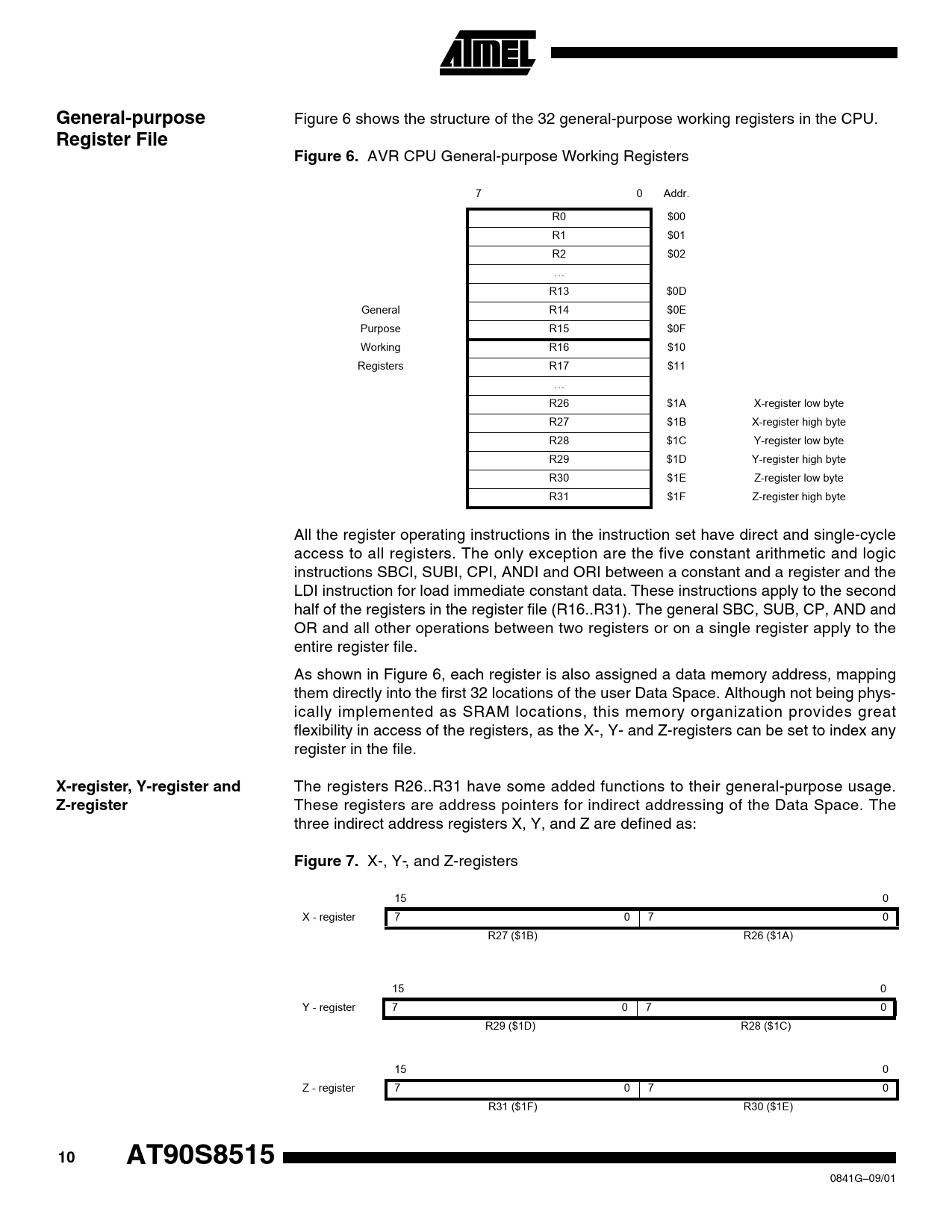General-purpose Register File Figure 6 shows the structure of the 32 general-purpose working registers in the CPU. Figure 6. AVR CPU General-purpose Working Registers 7 0 Addr. R0 $00 R1 $01 R2 $02 … R13 $0D General R14 $0E Purpose R15 $0F Working R16 $10 Registers R17 $11 … R26 $1A X-register low byte R27 $1B X-register high byte R28 $1C Y-register low byte R29 $1D Y-register high byte R30 $1E Z-register low byte R31 $1F Z-register high byte All the register operating instructions in the instruction set have direct and single-cycle access to all registers. The only exception are the five constant arithmetic and logic instructions SBCI, SUBI, CPI, ANDI and ORI between a constant and a register and the LDI instruction for load immediate constant data. These instructions apply to the second half of the registers in the register file (R16.R31). The general SBC, SUB, CP, AND and OR and all other operations between two registers or on a single register apply to the entire register file. As shown in Figure 6, each register is also assigned a data memory address, mapping them directly into the first 32 locations of the user Data Space. Although not being physically implemented as SRAM locations, this memory organization provides great flexibility in access of the registers, as the X-, Y-and Z-registers can be set to index any register in the file. X-register, Y-register and Z-register The registers R26.R31 have some added functions to their general-purpose usage. These registers are address pointers for indirect addressing of the Data Space. The three indirect address registers X, Y, and Z are defined as: Figure 7. X-, Y-, and Z-registers 15 X -register 0 7 0 7 R27 ($1B) 0 R26 ($1A) 15 Y -register 0 7 0 7 R29 ($1D) 0 R28 ($1C) 15 Z -register 0 7 0 R31 ($1F) 10 7 0 R30 ($1E) AT90S8515 0841G–09/01