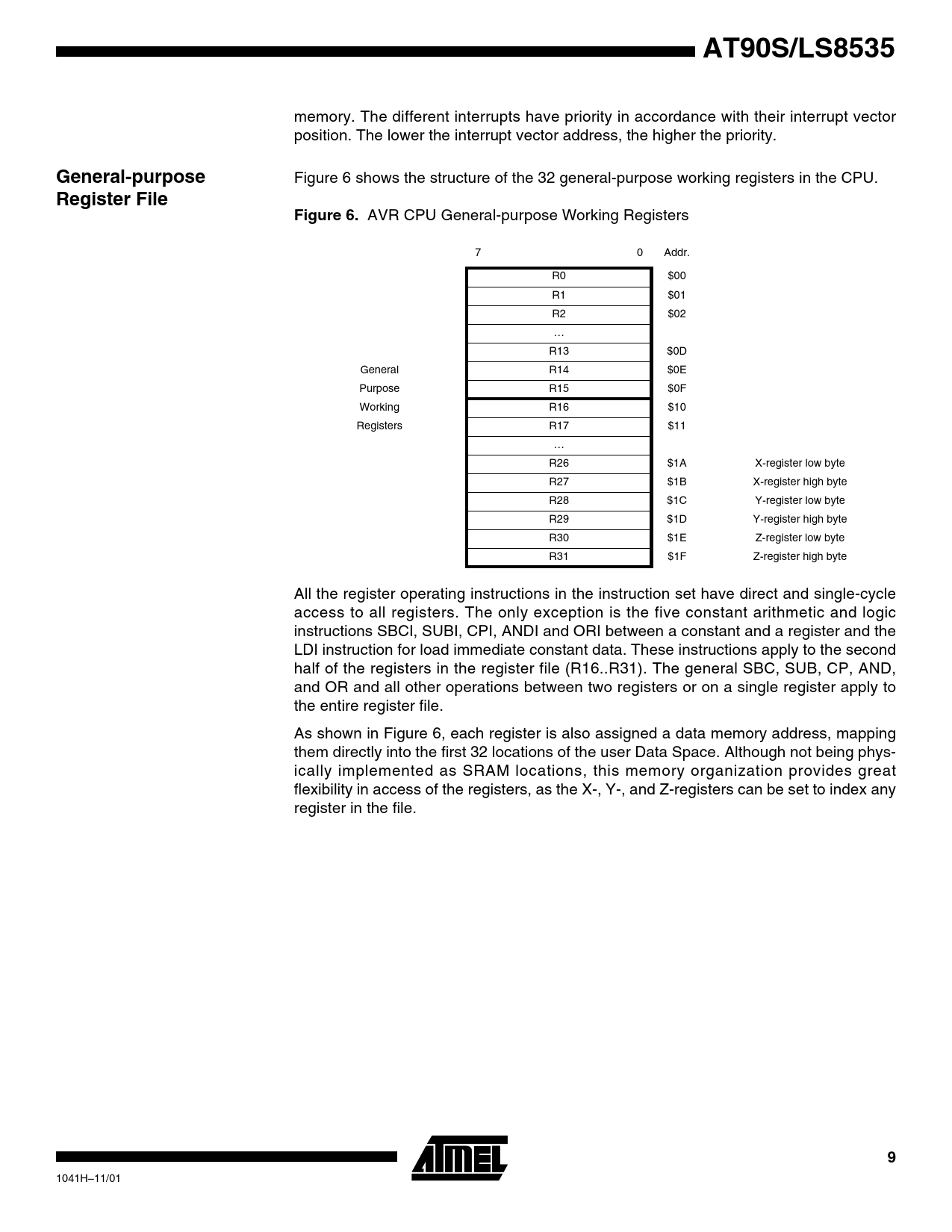 link to page 9 link to page 9 AT90S/LS8535 memory. The different interrupts have priority in accordance with their interrupt vector position. The lower the interrupt vector address, the higher the priority. General-purpose Figure 6 shows the structure of the 32 general-purpose working registers in the CPU. Register FileFigure 6. AVR CPU General-purpose Working Registers 7 0 Addr. R0 $00 R1 $01 R2 $02 … R13 $0D General R14 $0E Purpose R15 $0F Working R16 $10 Registers R17 $11 … R26 $1A X-register low byte R27 $1B X-register high byte R28 $1C Y-register low byte R29 $1D Y-register high byte R30 $1E Z-register low byte R31 $1F Z-register high byte All the register operating instructions in the instruction set have direct and single-cycle access to all registers. The only exception is the five constant arithmetic and logic instructions SBCI, SUBI, CPI, ANDI and ORI between a constant and a register and the LDI instruction for load immediate constant data. These instructions apply to the second half of the registers in the register file (R16..R31). The general SBC, SUB, CP, AND, and OR and all other operations between two registers or on a single register apply to the entire register file. As shown in Figure 6, each register is also assigned a data memory address, mapping them directly into the first 32 locations of the user Data Space. Although not being phys- ically implemented as SRAM locations, this memory organization provides great flexibility in access of the registers, as the X-, Y-, and Z-registers can be set to index any register in the file. 9 1041H–11/01 Document Outline Features Pin Configurations Description Block Diagram Pin Descriptions VCC GND Port A (PA7..PA0) Port B (PB7..PB0) Port C (PC7..PC0) Port D (PD7..PD0) RESET XTAL1 XTAL2 AVCC AREF AGND Clock Options Crystal Oscillator External Clock Timer Oscillator Architectural Overview General-purpose Register File X-register, Y-register and Z- register ALU – Arithmetic Logic Unit In-System Programmable Flash Program Memory SRAM Data Memory Program and Data Addressing Modes Register Direct, Single Register Rd Register Direct, Two Registers Rd And Rr I/O Direct Data Direct Data Indirect with Displacement Data Indirect Data Indirect with Pre- decrement Data Indirect with Post- increment Constant Addressing Using the LPM Instruction Indirect Program Addressing, IJMP and ICALL Relative Program Addressing, RJMP and RCALL EEPROM Data Memory Memory Access Times and Instruction Execution Timing I/O Memory Status Register – SREG Stack Pointer – SP Reset and Interrupt Handling Reset Sources Power-on Reset External Reset Watchdog Reset MCU Status Register – MCUSR Interrupt Handling General Interrupt Mask Register – GIMSK General Interrupt Flag Register – GIFR Timer/Counter Interrupt Mask Register – TIMSK Timer/Counter Interrupt Flag Register – TIFR External Interrupts Interrupt Response Time MCU Control Register – MCUCR Sleep Modes Idle Mode Power-down Mode Power Save Mode Timer/Counters Timer/Counter Prescalers 8-bit Timer/Counter0 Timer/Counter0 Control Register – TCCR0 Timer Counter 0 – TCNT0 16-bit Timer/Counter1 Timer/Counter1 Control Register A – TCCR1A Timer/Counter1 Control Register B – TCCR1B Timer/Counter1 – TCNT1H AND TCNT1L Timer/Counter1 Output Compare Register – OCR1AH AND OCR1AL Timer/Counter1 Output Compare Register – OCR1BH AND OCR1BL Timer/Counter1 Input Capture Register – ICR1H AND ICR1L Timer/Counter1 In PWM Mode 8-bit Timer/Counter2 Timer/Counter2 Control Register – TCCR2 Timer/Counter2 – TCNT2 Timer/Counter2 Output Compare Register – OCR2 Timer/Counter2 in PWM Mode Asynchronous Status Register – ASSR Asynchronous Operation of Timer/Counter2 Watchdog Timer Watchdog Timer Control Register – WDTCR EEPROM Read/Write Access EEPROM Address Register – EEARH and EEARL EEPROM Data Register – EEDR EEPROM Control Register – EECR Prevent EEPROM Corruption Serial Peripheral Interface – SPI SS Pin Functionality Data Modes SPI Control Register – SPCR SPI Status Register – SPSR SPI Data Register – SPDR UART Data Transmission Data Reception UART Control UART I/O Data Register – UDR UART Status Register – USR UART Control Register – UCR Baud Rate Generator UART Baud Rate Register – UBRR Analog Comparator Analog Comparator Control and Status Register – ACSR Analog-to-Digital Converter Feature list Operation Prescaling ADC Noise Canceler Function ADC Multiplexer Select Register – ADMUX ADC Control and Status Register – ADCSR ADC Data Register – ADCL AND ADCH Scanning Multiple Channels ADC Noise Canceling Techniques ADC Characteristics I/O Ports Port A Port A Data Register – PORTA Port A Data Direction Register – DDRA Port A Input Pins Address – PINA Port A as General Digital I/O Port A Schematics Port B Port B Data Register – PORTB Port B Data Direction Register – DDRB Port B Input Pins Address – PINB Port B As General Digital I/O Alternate Functions of Port B Port B Schematics Port C Port C Data Register – PORTC Port C Data Direction Register – DDRC Port C Input Pins Address – PINC Port C As General Digital I/O Alternate Functions of Port C Port C Schematics Port D Port D Data Register – PORTD Port D Data Direction Register – DDRD Port D Input Pins Address – PIND Port D As General Digital I/O Alternate Functions of Port D Port D Schematics Memory Programming Program and Data Memory Lock Bits Fuse Bits Signature Bytes Programming the Flash and EEPROM Parallel Programming Signal Names Enter Programming Mode Chip Erase Programming the Flash Reading the Flash Programming the EEPROM Reading the EEPROM Programming the Fuse Bits Programming the Lock Bits Reading the Fuse and Lock Bits Reading the Signature Bytes Parallel Programming Characteristics Serial Downloading Serial Programming Algorithm Data Polling EEPROM Data Polling Flash Serial Programming Characteristics Electrical Characteristics Absolute Maximum Ratings* DC Characteristics Ex