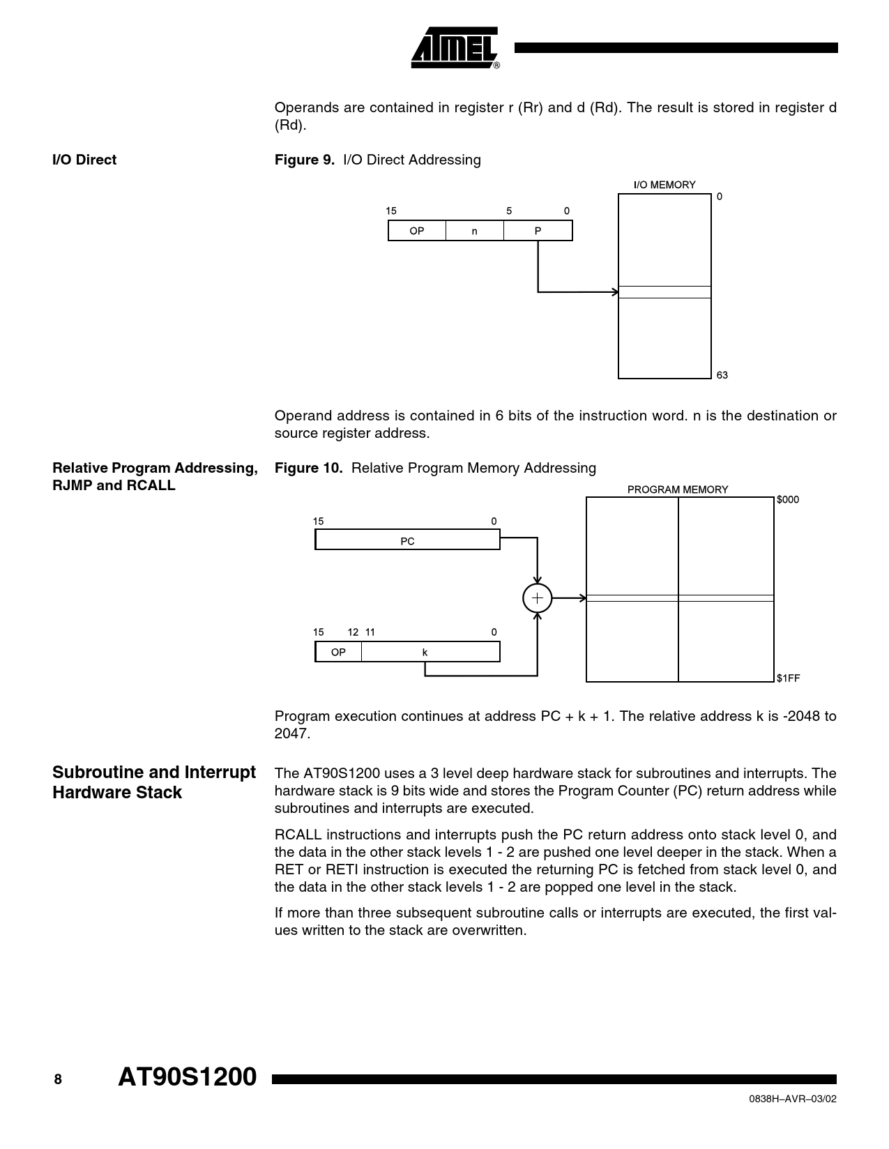 I/O Direct Figure 9 Relative Program Addressing, Figure 10 RJMP and RCALL Subroutine and Interrupt Hardware Stack AT90S1200