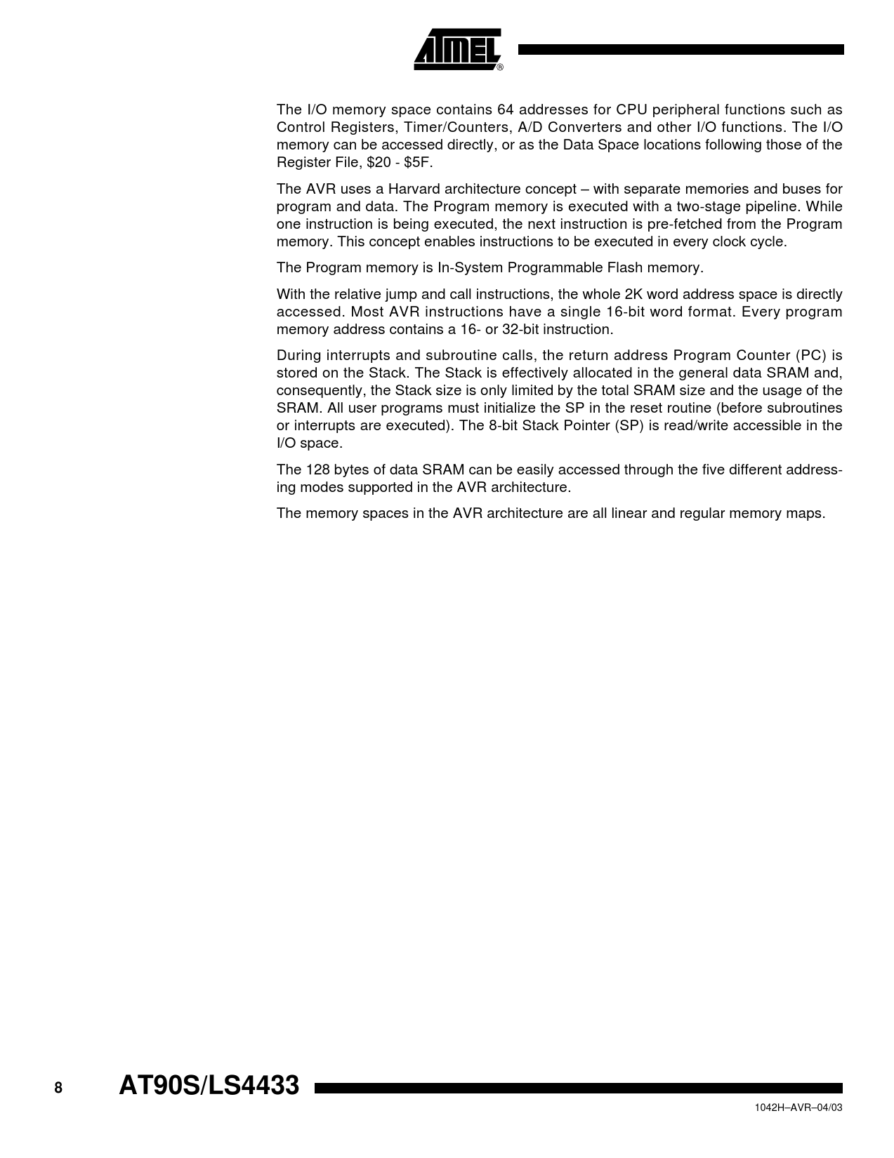 The I/O memory space contains 64 addresses for CPU peripheral functions such as Control Registers, Timer/Counters, A/D Converters and other I/O functions. The I/O memory can be accessed directly, or as the Data Space locations following those of the Register File, $20 - $5F. The AVR uses a Harvard architecture concept – with separate memories and buses for program and data. The Program memory is executed with a two-stage pipeline. While one instruction is being executed, the next instruction is pre-fetched from the Program memory. This concept enables instructions to be executed in every clock cycle. The Program memory is In-System Programmable Flash memory. With the relative jump and call instructions, the whole 2K word address space is directly accessed. Most AVR instructions have a single 16-bit word format. Every program memory address contains a 16- or 32-bit instruction. During interrupts and subroutine calls, the return address Program Counter (PC) is stored on the Stack. The Stack is effectively allocated in the general data SRAM and, consequently, the Stack size is only limited by the total SRAM size and the usage of the SRAM. All user programs must initialize the SP in the reset routine (before subroutines or interrupts are executed). The 8-bit Stack Pointer (SP) is read/write accessible in the I/O space. The 128 bytes of data SRAM can be easily accessed through the five different address- ing modes supported in the AVR architecture. The memory spaces in the AVR architecture are all linear and regular memory maps. 8AT90S/LS4433 1042H–AVR–04/03 Document Outline Features Pin Configurations Description Block Diagram Pin Descriptions VCC GND Port B (PB5..PB0) Port C (PC5..PC0) Port D (PD7..PD0) RESET XTAL1 XTAL2 AVCC AREF AGND Clock Options Crystal Oscillator External Clock Architectural Overview General Purpose Register File X-register, Y-register and Z- register ALU – Arithmetic Logic Unit In-System Programmable Flash Program Memory SRAM Data Memory Program and Data Addressing Modes Register Direct, Single Register Rd Register Direct, Two Registers Rd and Rr I/O Direct Data Direct Data Indirect with Displacement Data Indirect Data Indirect with Pre- decrement Data Indirect with Post- increment Constant Addressing Using the LPM Instruction Indirect Program Addressing, IJMP and ICALL Relative Program Addressing, RJMP and RCALL EEPROM Data Memory Memory Access Times and Instruction Execution Timing I/O Memory Status Register – SREG Stack Pointer – SP Reset and Interrupt Handling Reset Sources Power-on Reset External Reset Brown-out Detection Watchdog Reset MCU Status Register – MCUSR Interrupt Handling General Interrupt Mask Register – GIMSK General Interrupt Flag Register – GIFR Timer/Counter Interrupt Mask Register – TIMSK Timer/Counter Interrupt Flag Register – TIFR External Interrupts Interrupt Response Time MCU Control Register – MCUCR Sleep Modes Idle Mode Power-down Mode Timer/Counters Timer/Counter Prescaler 8-bit Timer/Counter0 Timer/Counter0 Control Register – TCCR0 Timer Counter0 – TCNT0 16-bit Timer/Counter1 Timer/Counter1 Control Register A – TCCR1A Timer/Counter1 Control Register B – TCCR1B Timer/Counter1 – TCNT1H and TCNT1L Timer/Counter1 Output Compare Register – OCR1H and OCR1L Timer/Counter1 Input Capture Register – ICR1H and ICR1L Timer/Counter1 in PWM Mode Watchdog Timer Watchdog Timer Control Register – WDTCR EEPROM Read/Write Access EEPROM Address Register – EEAR EEPROM Data Register – EEDR EEPROM Control Register – EECR Prevent EEPROM Corruption Serial Peripheral Interface – SPI SS Pin Functionality Data Modes SPI Control Register – SPCR SPI Status Register – SPSR SPI Data Register – SPDR UART Data Transmission Data Reception Multi-processor Communication Mode UART Control UART I/O Data Register – UDR UART Control and Status Register A – UCSRA UART Control and Status Register B – UCSRB Baud Rate Generator UART Baud Rate Register – UBRR Analog Comparator Analog Comparator Control and Status Register – ACSR Analog-to-Digital Converter Features Operation Prescaling ADC Noise Canceler Function ADC Multiplexer Select Register – ADMUX ADC Control and Status Register – ADCSR ADC Data Register – ADCL AND ADCH Scanning Multiple Channels ADC Noise Canceling Techniques ADC Characteristics TA = -40°C to 85°C I/O Ports Port B Port B Data Register – PORTB Port B Data Direction Register – DDRB Port B Input Pins Address – PINB Port B as General Digital I/O Alternate Functions of Port B Port C Port C Data Register – PORTC Port C Data Direction Register – DDRC Port C Input Pins Address – PINC Port C as General Digital I/O Port C Schematics Port D Port D Data Register – PORTD Port D Data Direction Register – DDRD Port D Input Pins Address – PIND Port D as General Digital I/O Alternate Functions of Port D Port D Schematics Memory Programming Program and Data Memory Lock Bits Fuse Bits Signature Bytes Programming the Flash and EEPROM Parallel Programming Signal Names Enter Programming Mode Chip Erase Programming the Flash Reading the Flash Programming the EEPROM Reading the EEPROM Programming the Fuse Bits Programming the Lock Bits Reading the Fuse and Lock Bits Reading the Signature Bytes Parallel Programming Characteristics Serial Downloading Serial Programming Algorithm Data Polling EEPROM Data Polling Flash Serial Programming Characteristics Electrical Characteristics Absolute Maximum Ratings* DC Characteristics External Clock Drive Waveforms Typical Characteristics Register Summary Instruction Set Summary Ordering Information Packaging Information 32A 28P3 Errata for AT90S/LS4433 Rev. Rev. C/D/E/F Data Sheet ChangeLog for AT90S/LS4433 Changes from Rev. 1042E-09/01 to Ref. 1042F-03/02 Changes from Rev. 1042F-03/02 to Ref. 1042G-09/02 Changes from Rev. 1042G-09/02 to Ref. 1042H-04/03 Table of Contents